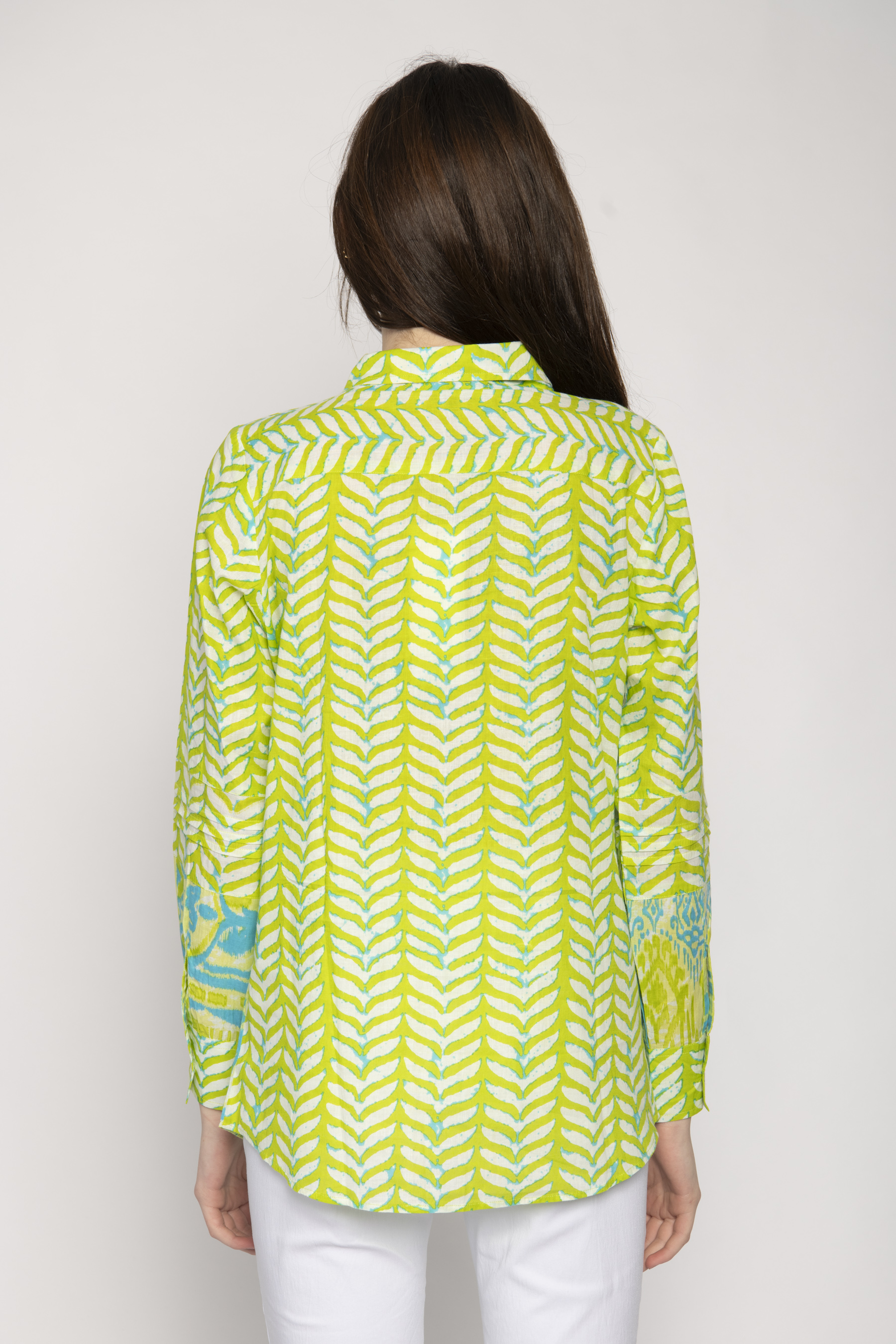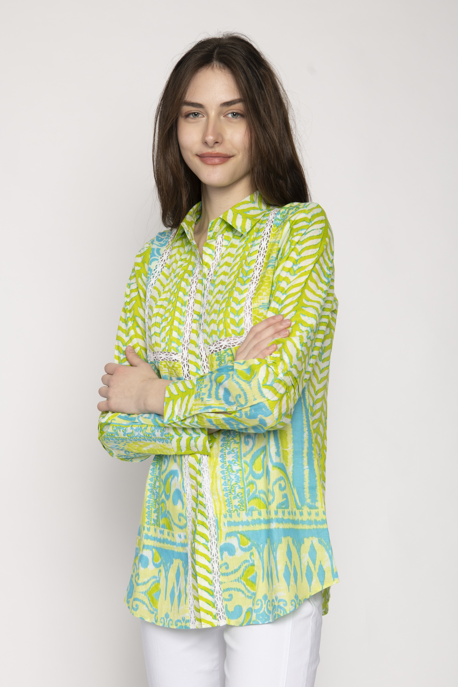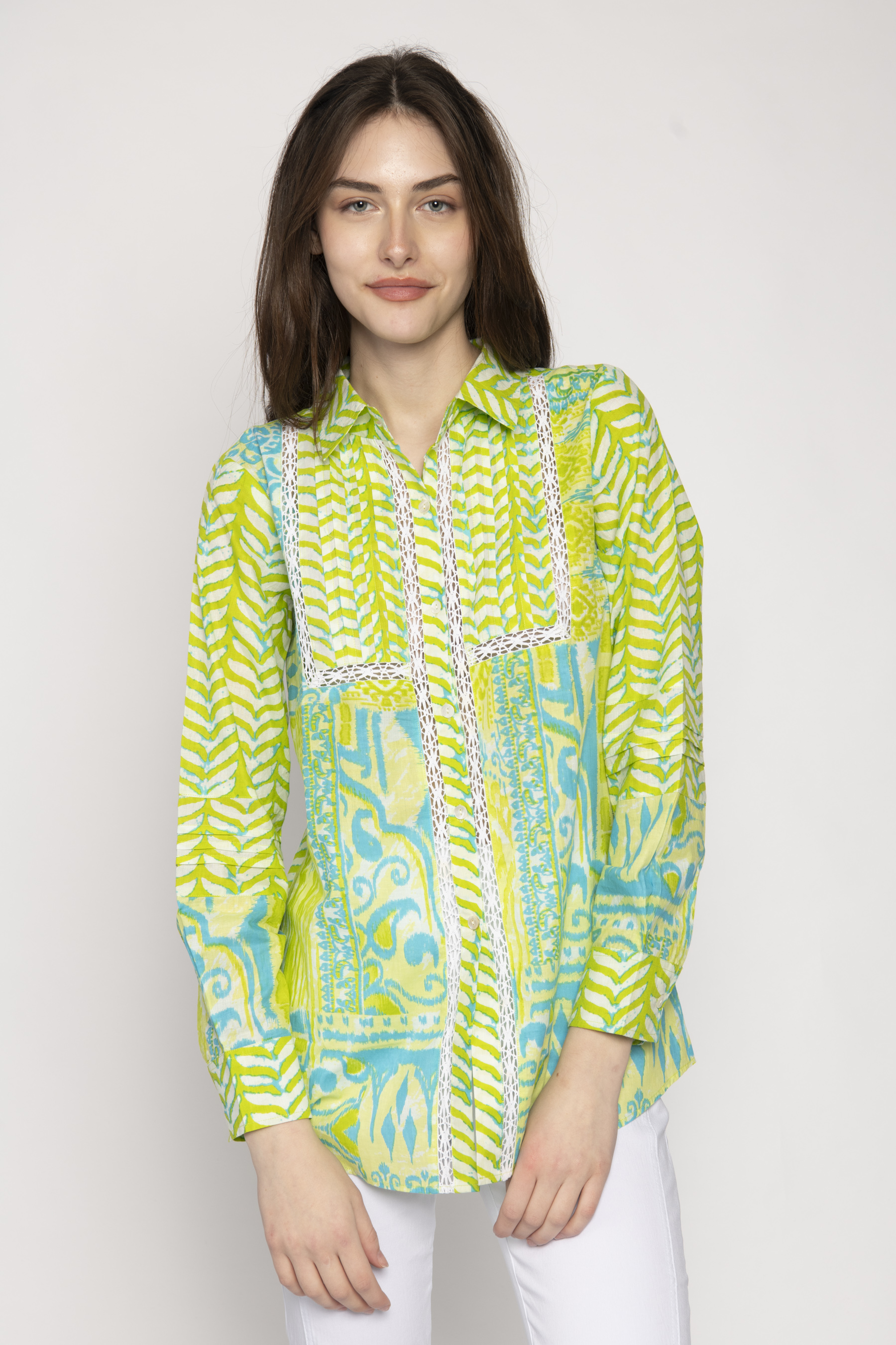 PRINTED BLOUSE, PINTUKING ON BODY AND SLEEVES AND LACE FRONT PANEL