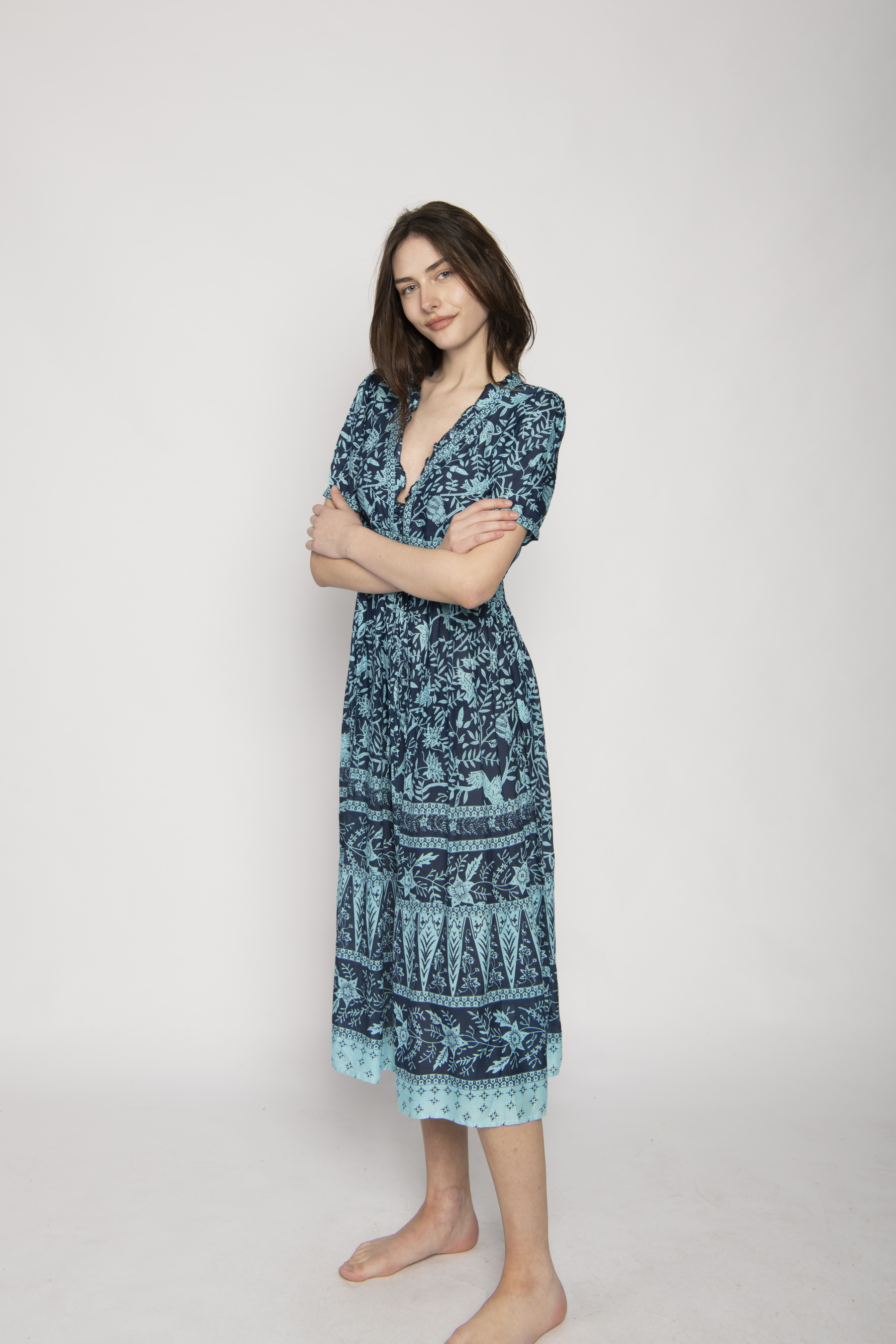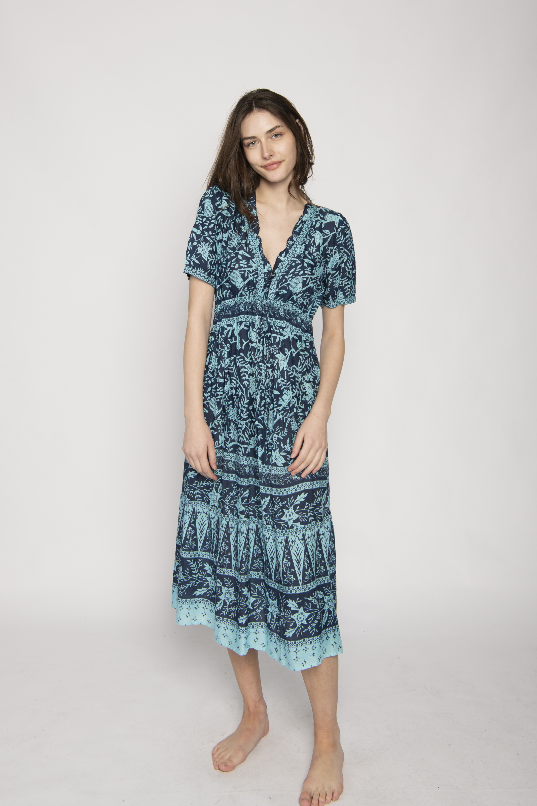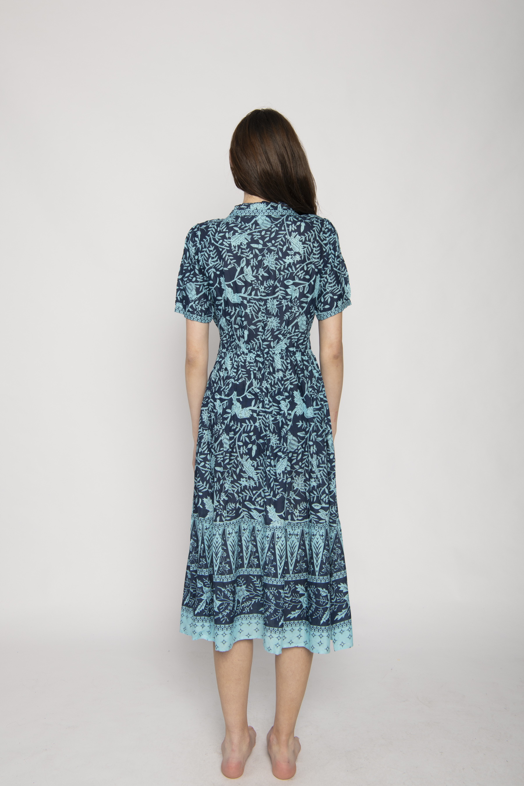 NAVY AND TURQUOISE FRILL NECKLINE MIDI DRESS