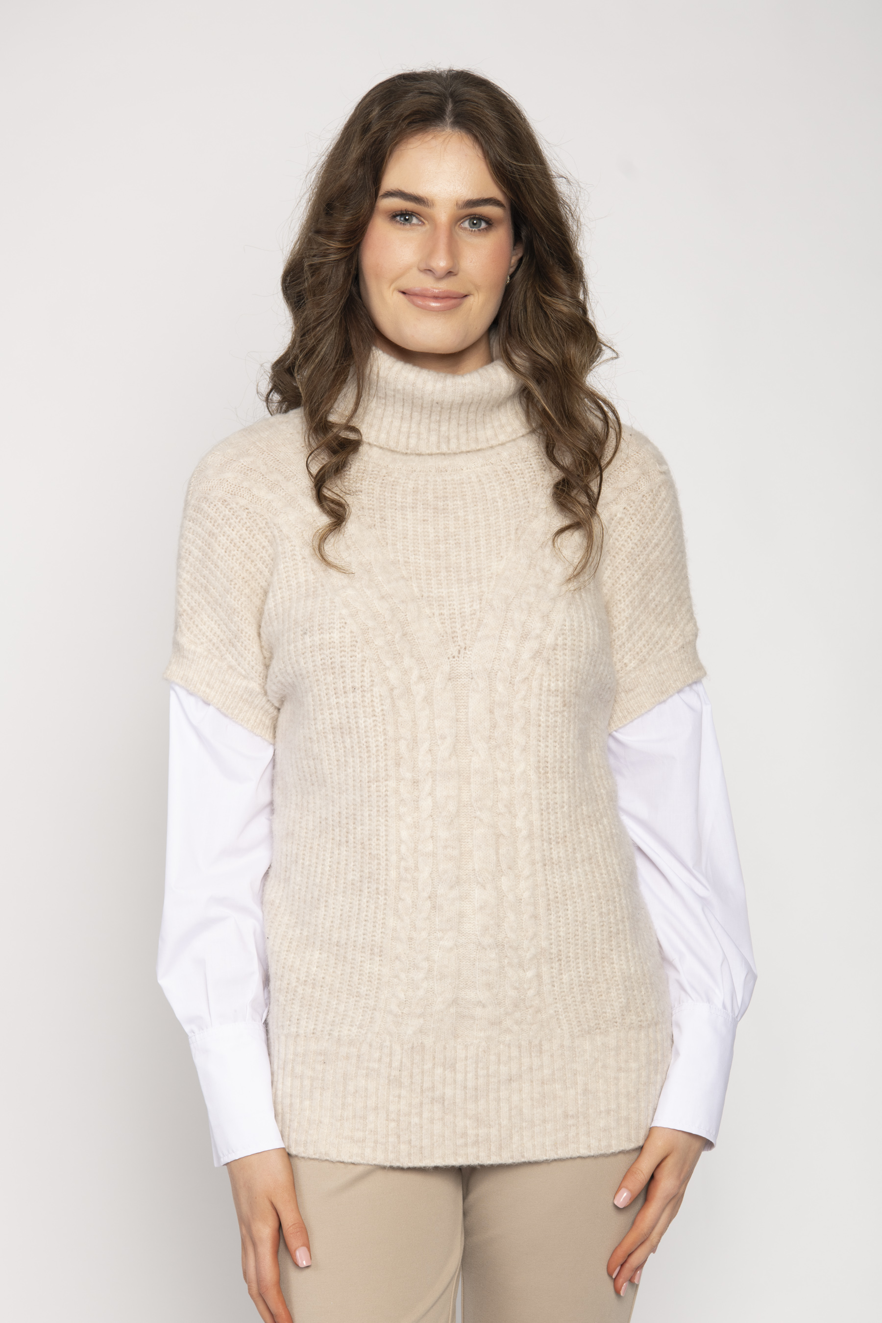 TURTLE NECK RIBBED/SHAPED CABLE SWEATER WITH SHIRT SLEEVE