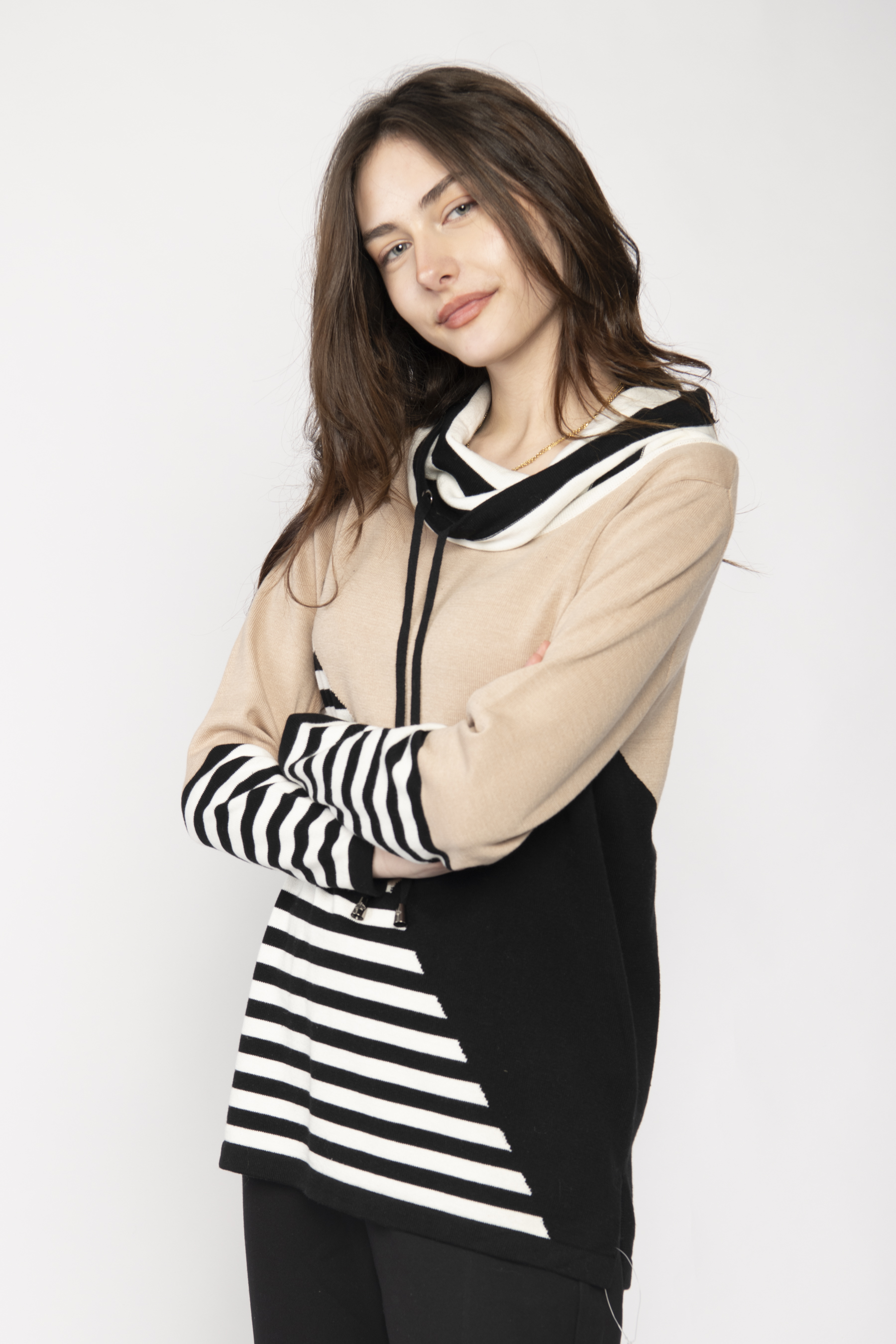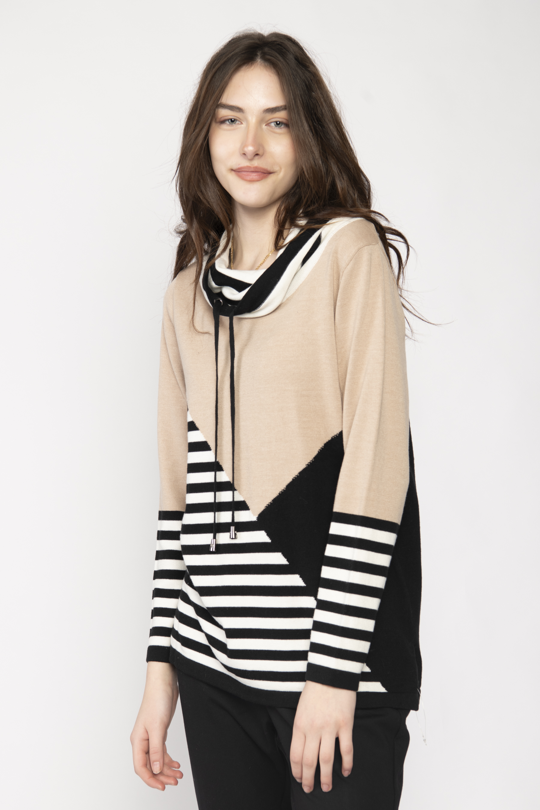 COWL NECK WITH TIE LONG SLEEVE SWEATER WITH NARROW STRIPES AND BLOCK COLOUR