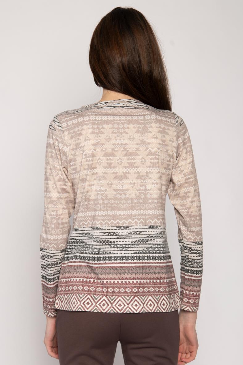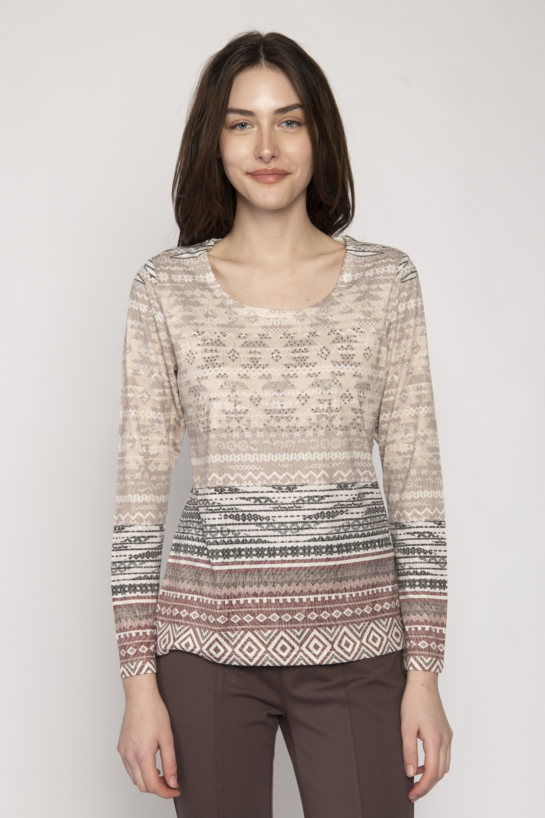 LONG SLEEVE SCOOP NECK JERSEY TOP WITH AZTEC PRINT AND DIAMONTE STUDS
