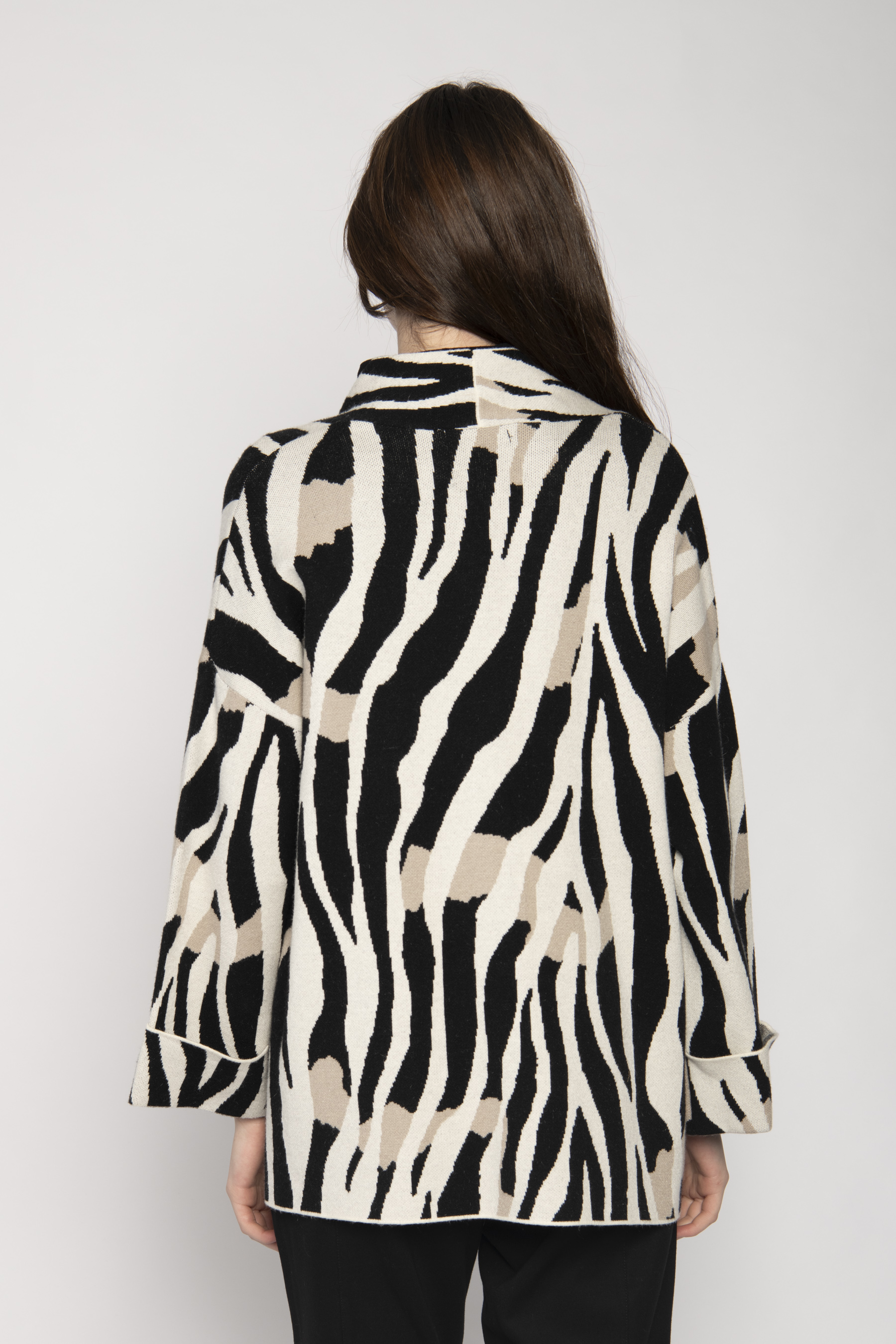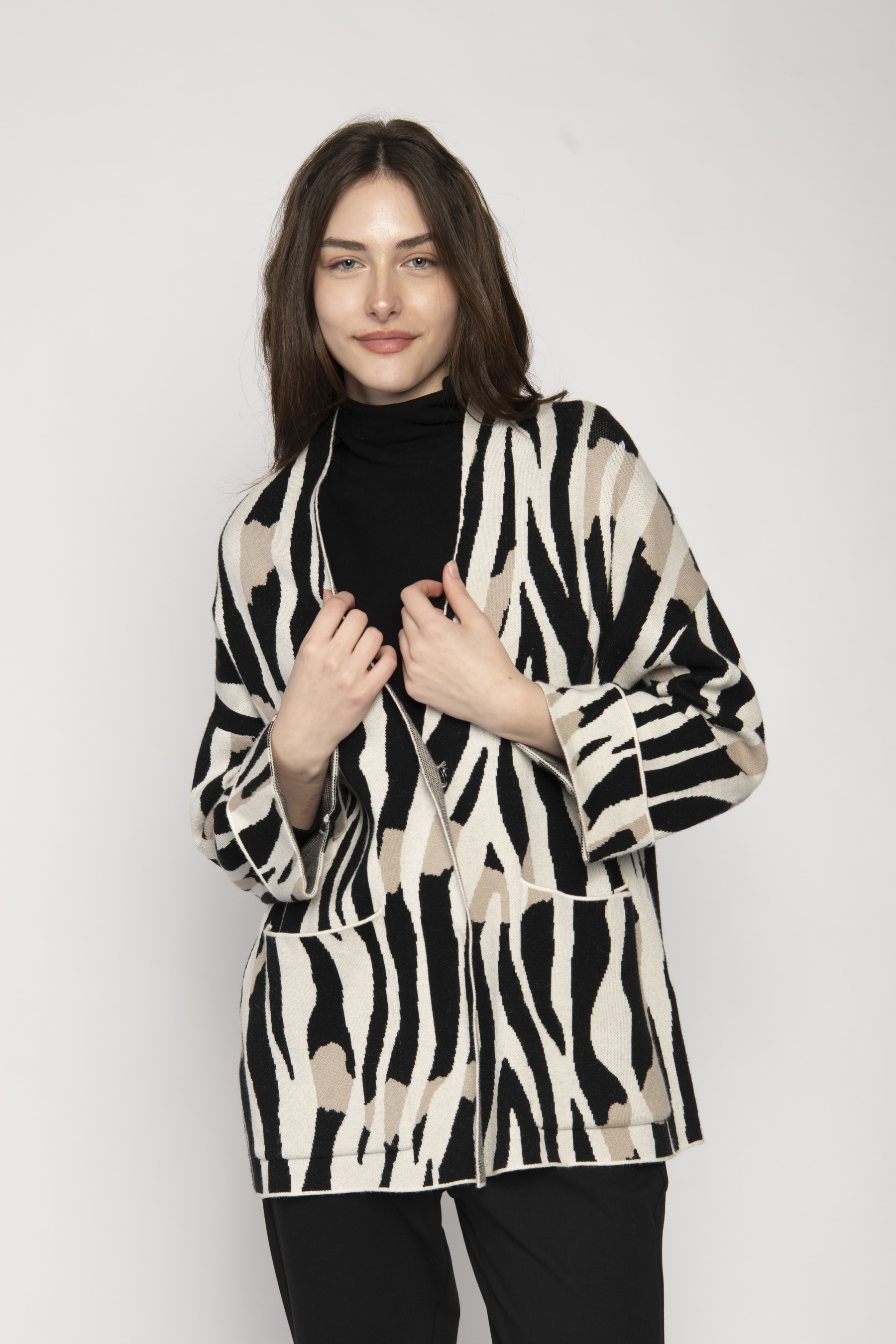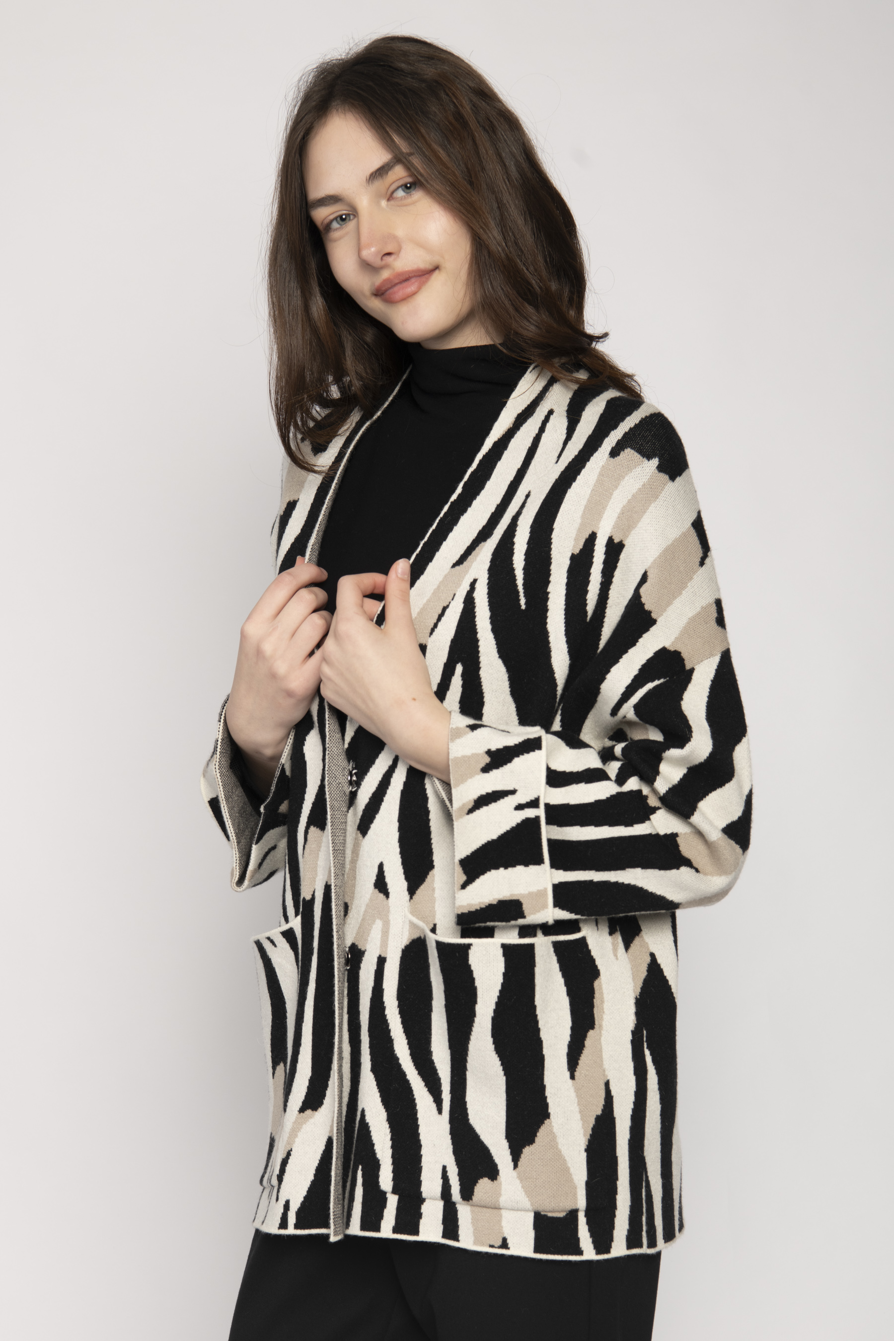 CARDIGAN WITH CONCEALED STUD CLOSURE AND PATCH PKTS ZEBRA JACQUARD