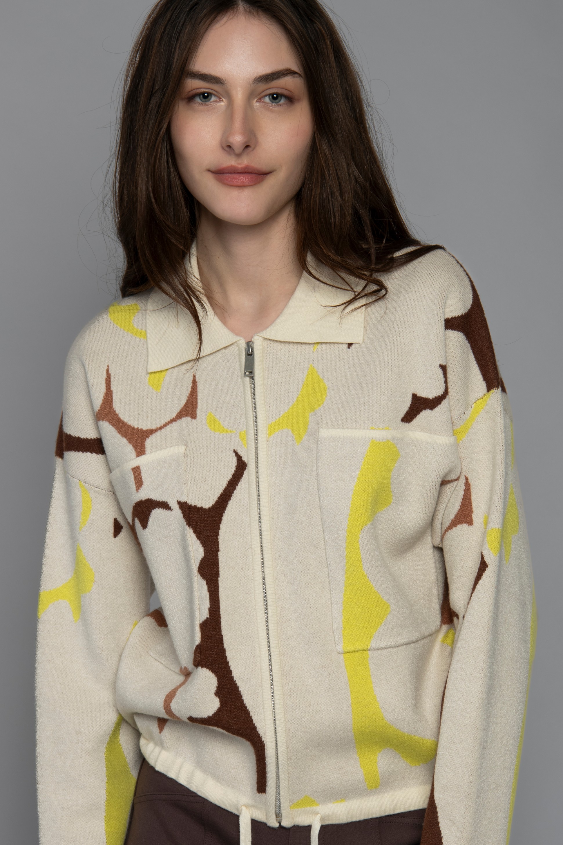 COLLAR & ZIP SHORT CARDIGAN LONG SLEEVE WITH LARGE PATCH PKTS, TIE HEM NEON/BROWN JACQUARD