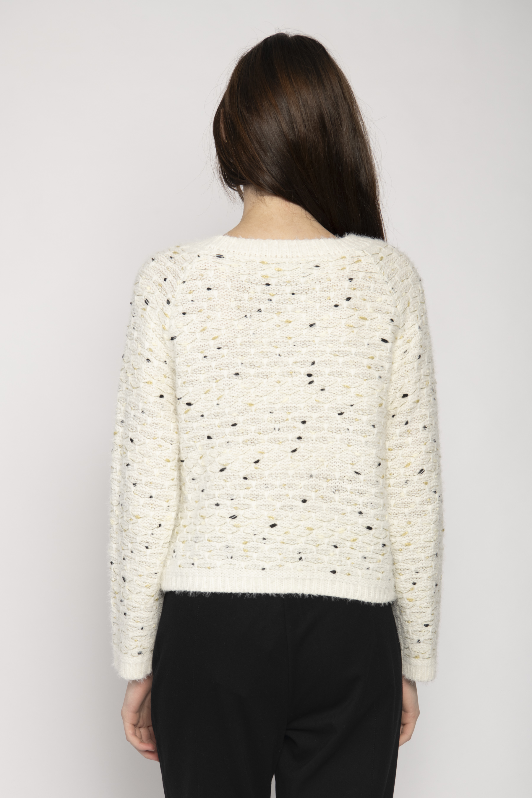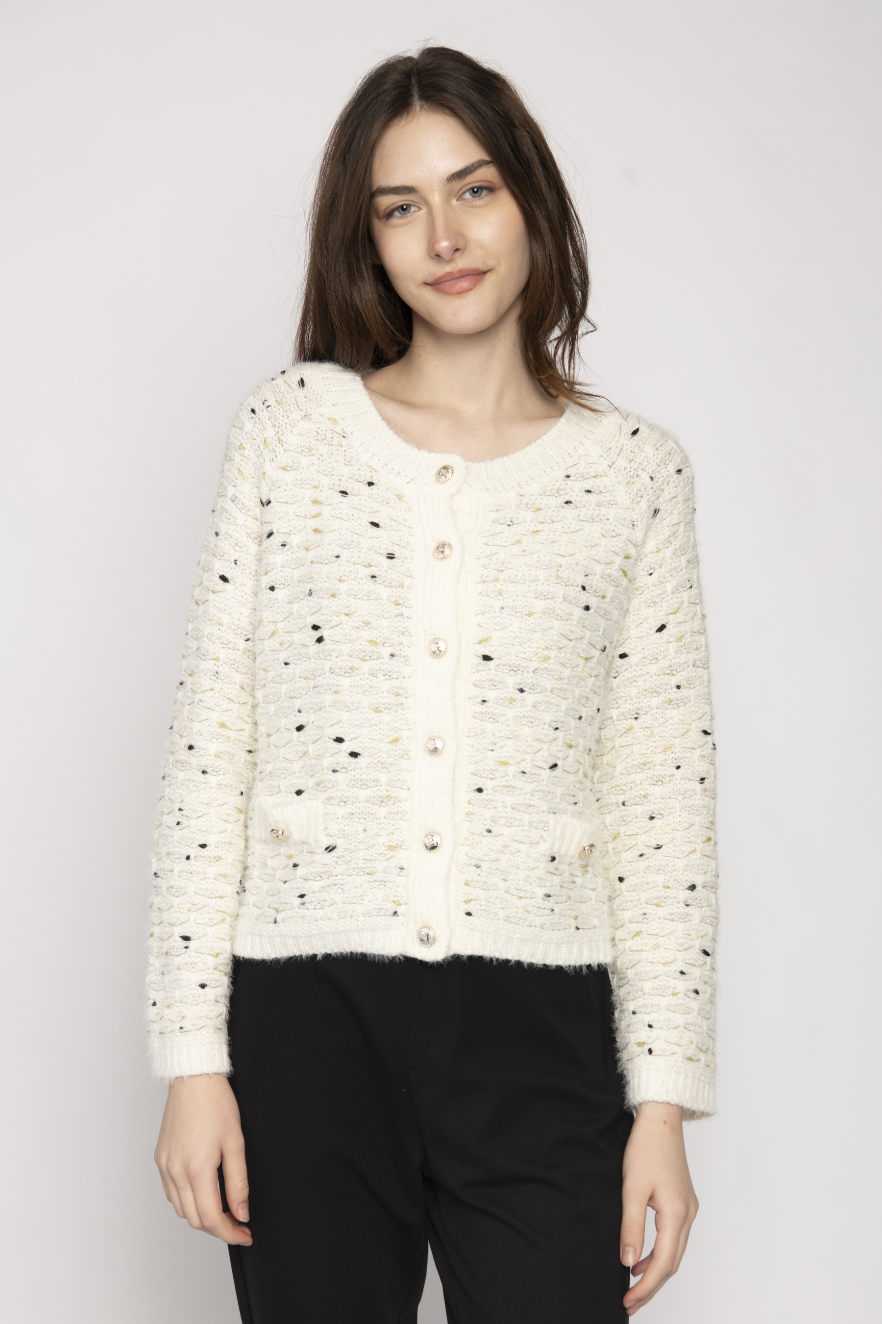SHORT ROUND NECK CHANEL CARDIGAN SILVER BUTTON FRONT FLUFFY WITH LUREX