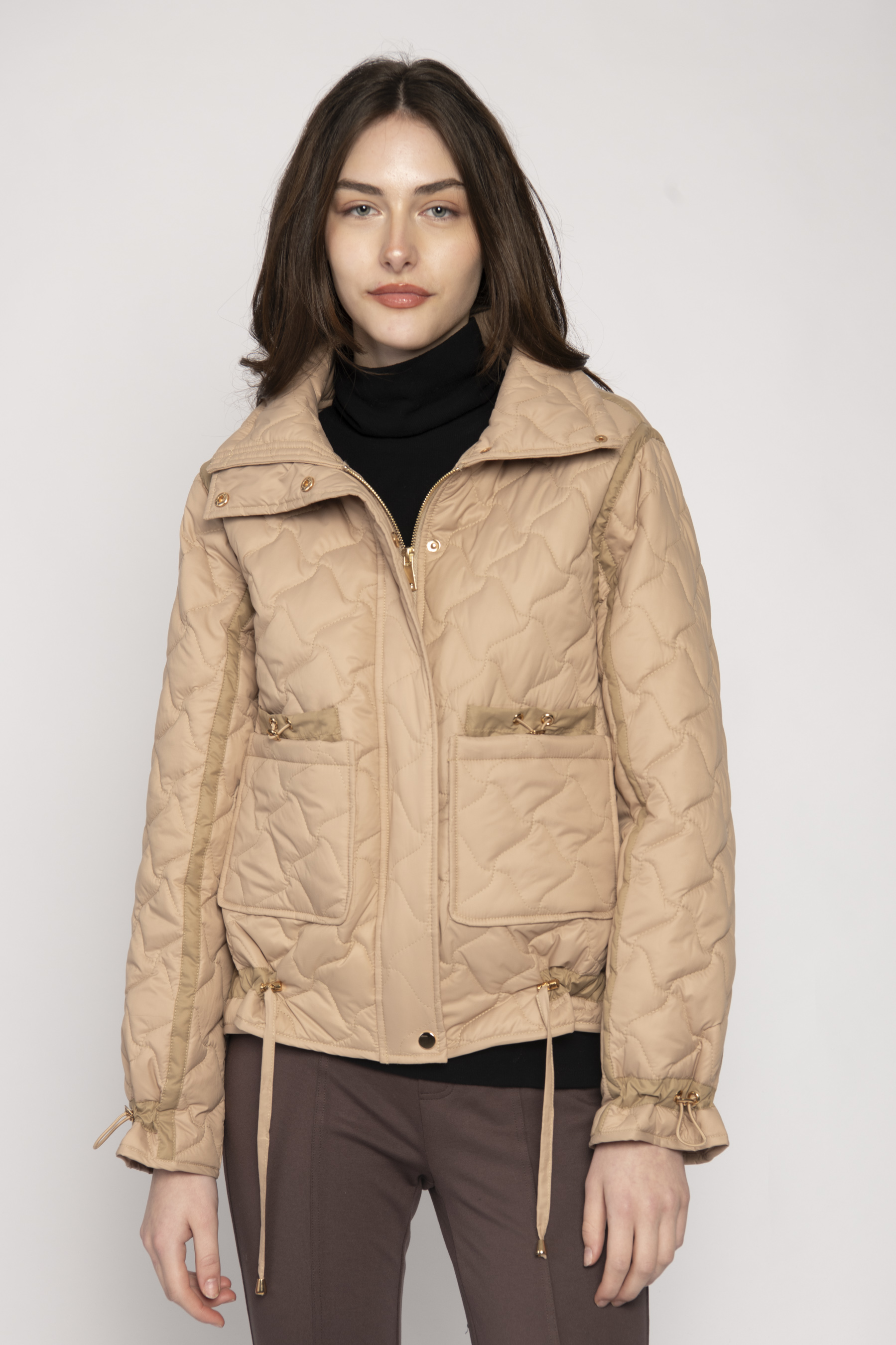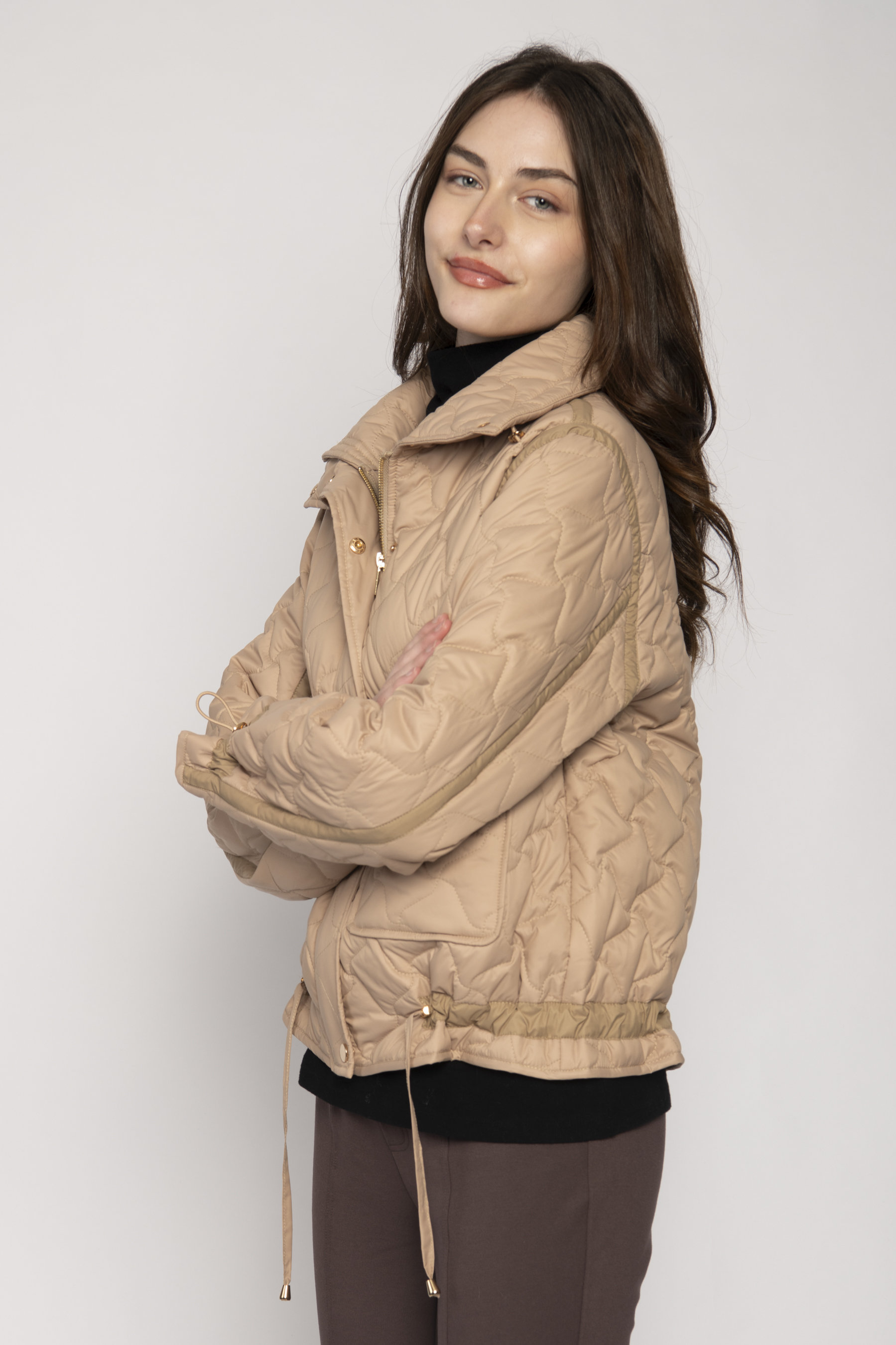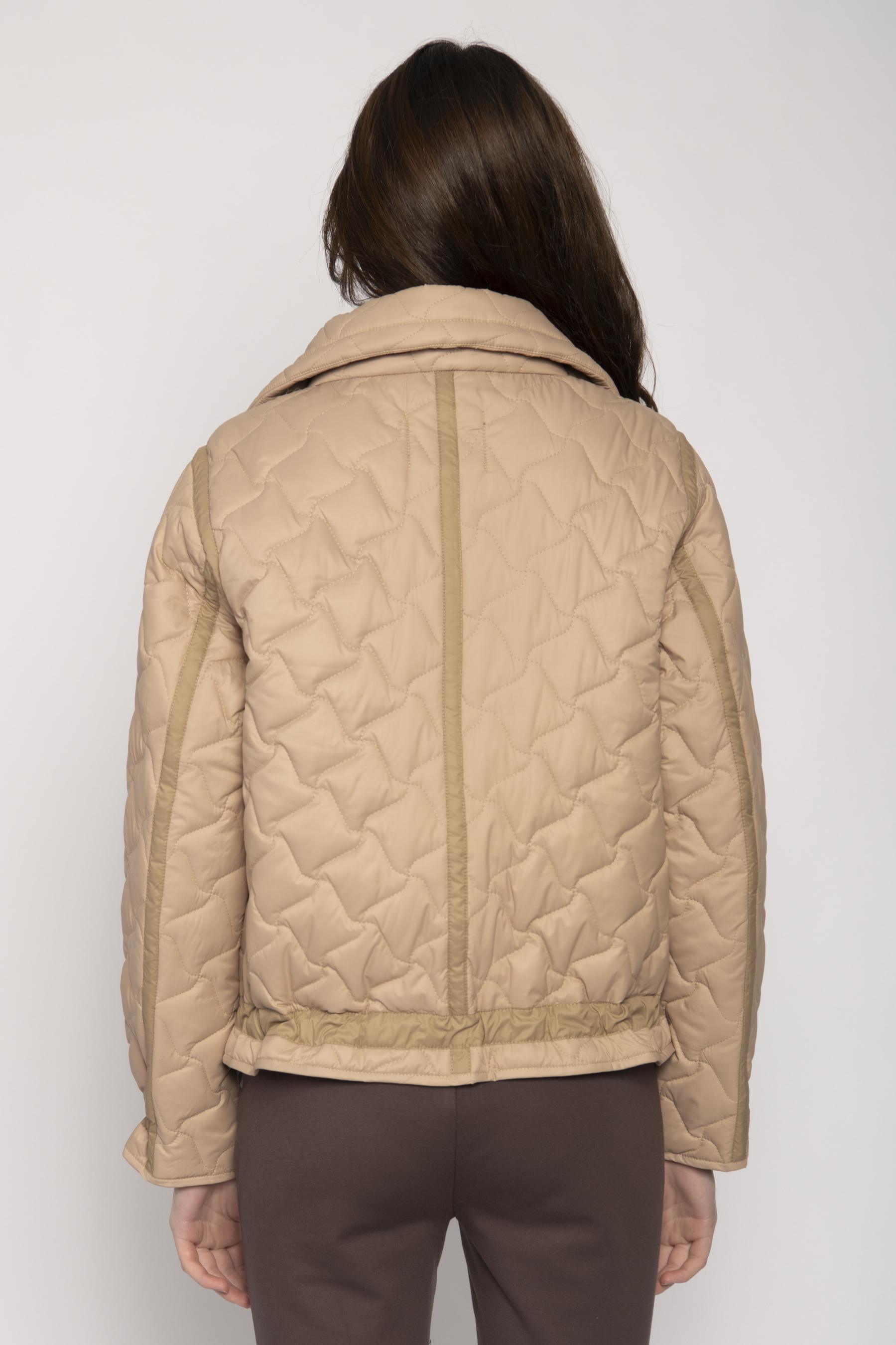 SHORT PADDED JACKET WITH BINDING,COLLAR ZIP/STUD CLOSURE DOUBLE PATCH PKTS STITCHED WAVY DIAMOND PATTERN