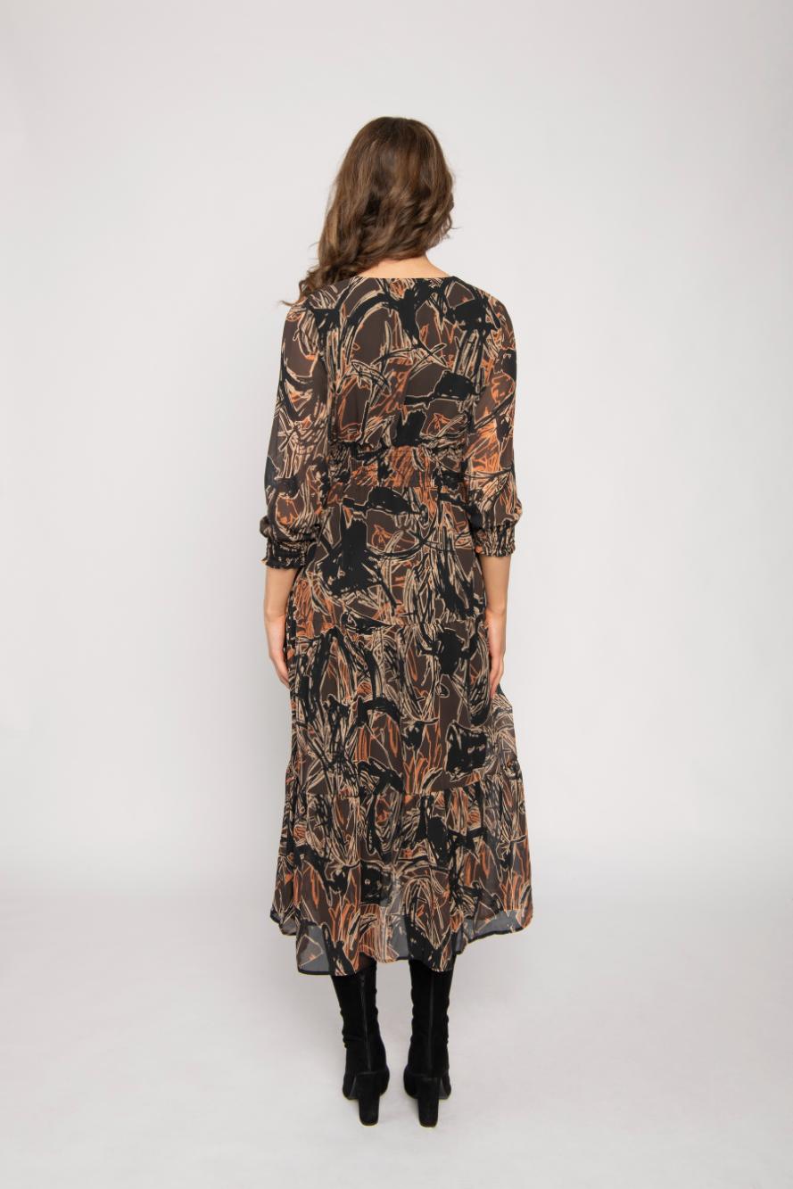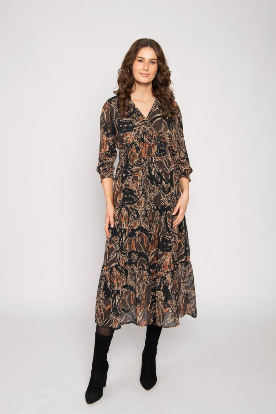 CROSS OVER V NECK MIDI DRESS WITH LONG SLEEVE ELASTIC WAIST AND CUFF, FRILL HEM SCRIBBLE PRINT