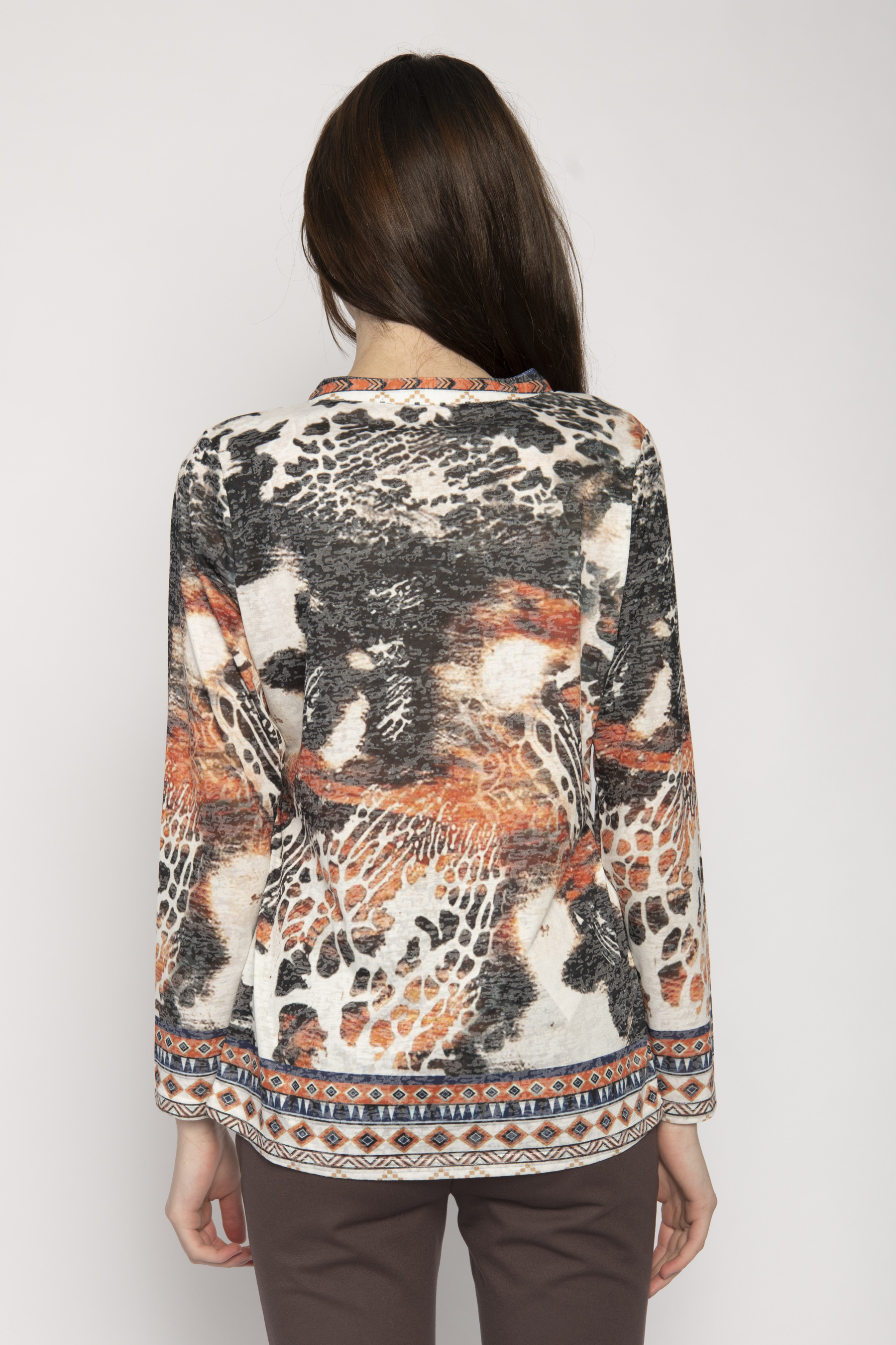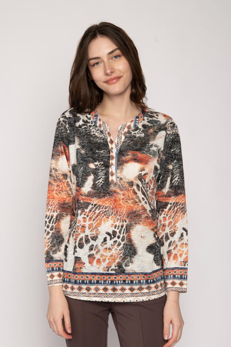 MANDARIN COLLAR V NECK BUTTON PLACKET LONG SLEEVE AFRICAN /BORDER PRINT TOP
