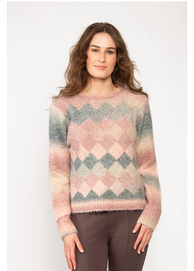 ROUND NECK LONG SLEEVE SWEATER DIAMOND LATTICE PATTERN JERSEY KNIT BACK