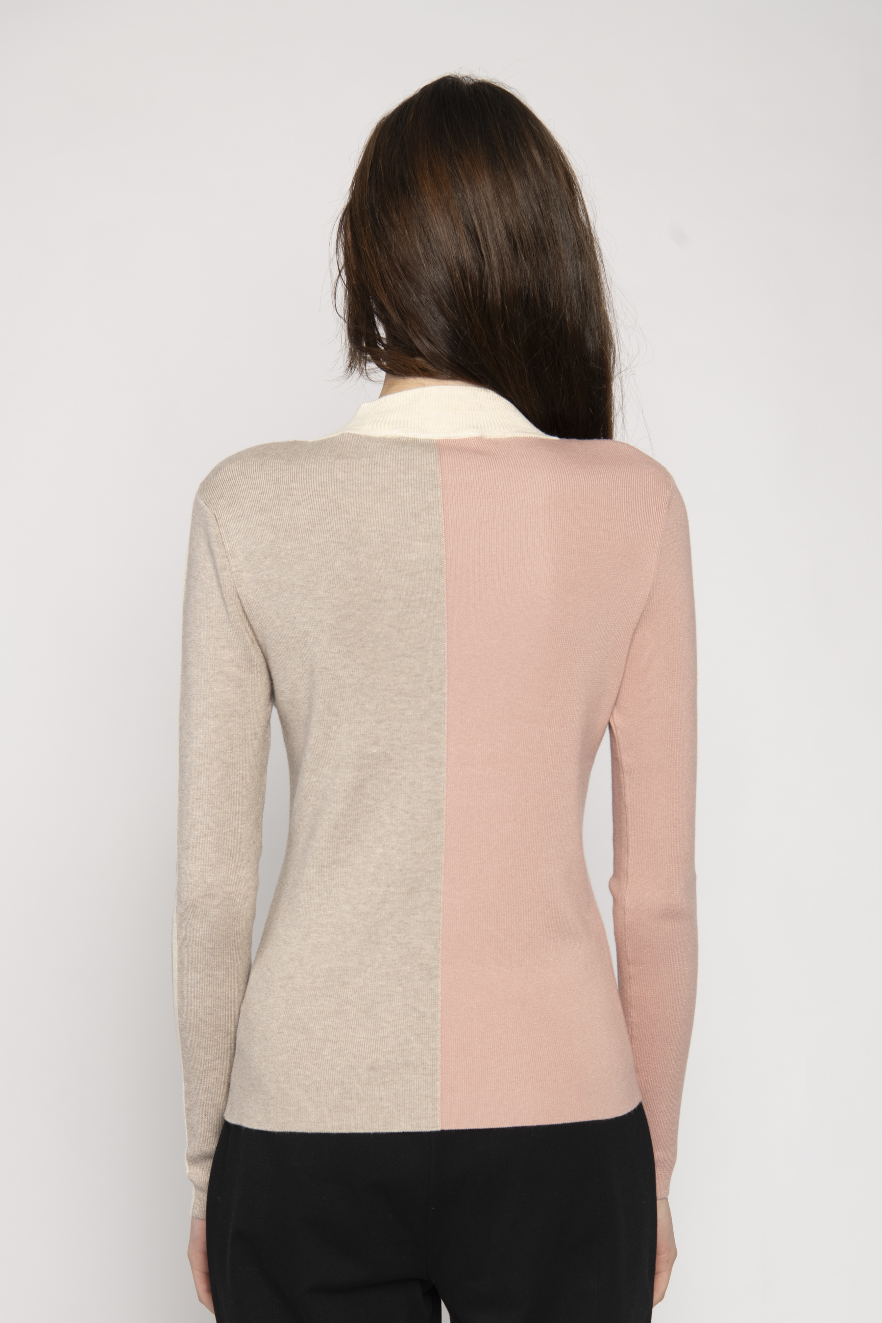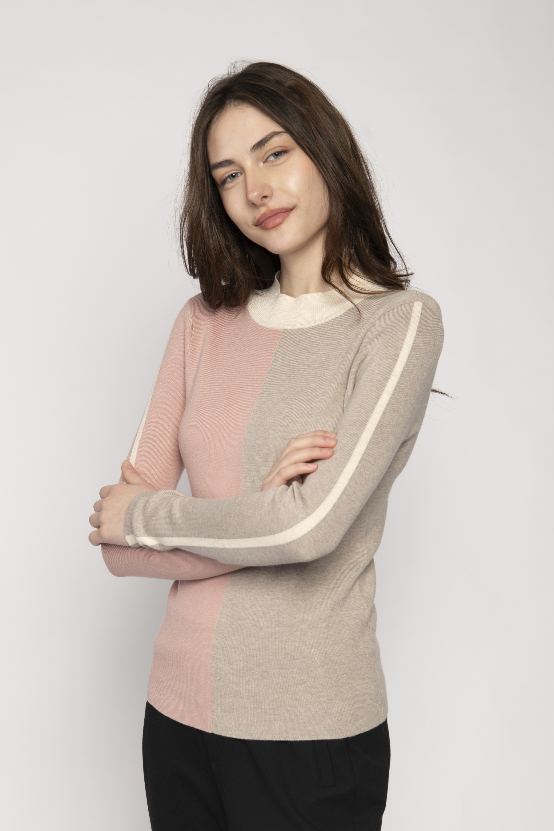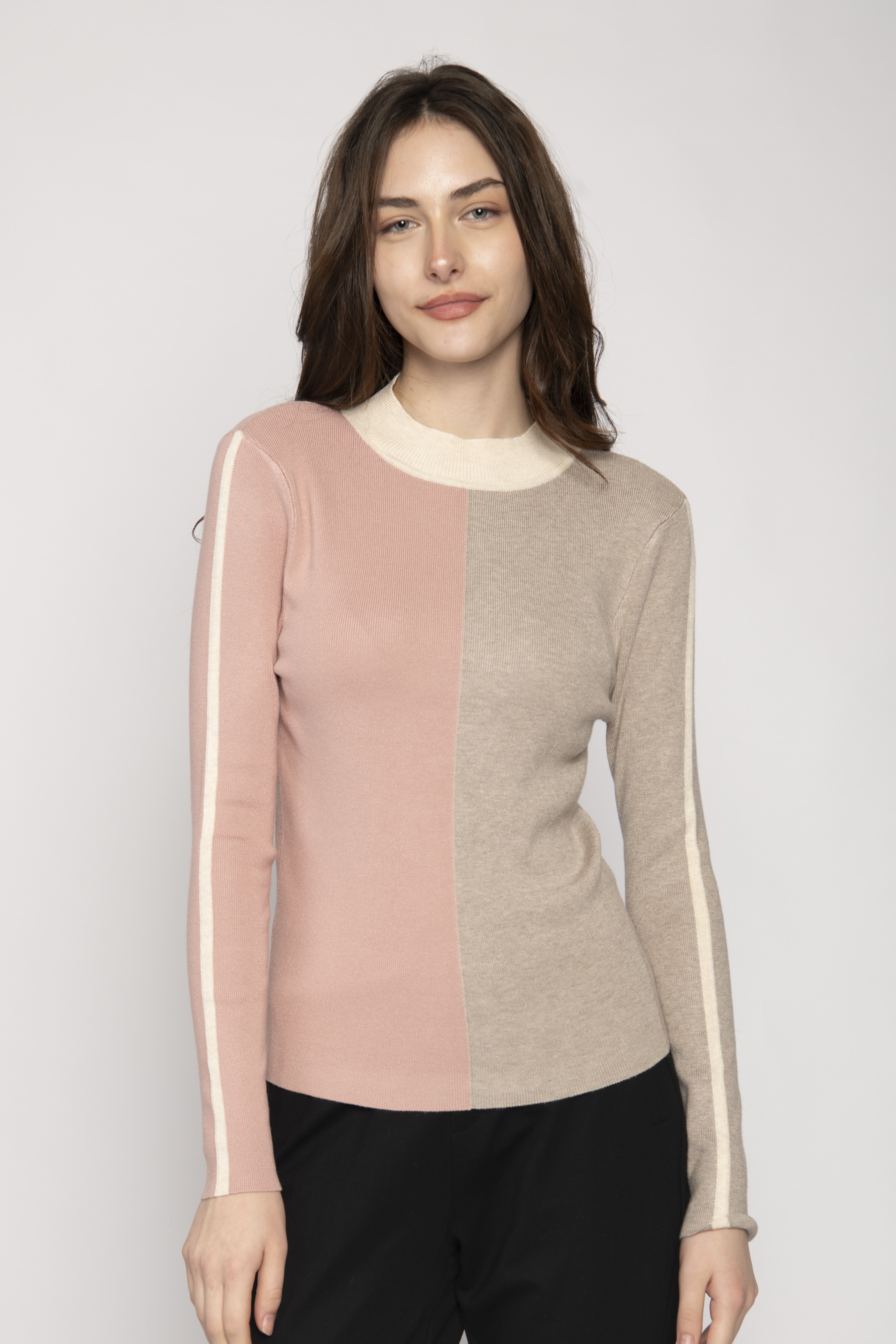 HIGH RIB NECK LONG SLEEVE SWEATER COLOUR BLOCK FRONT STRIPE ON SLEEVE