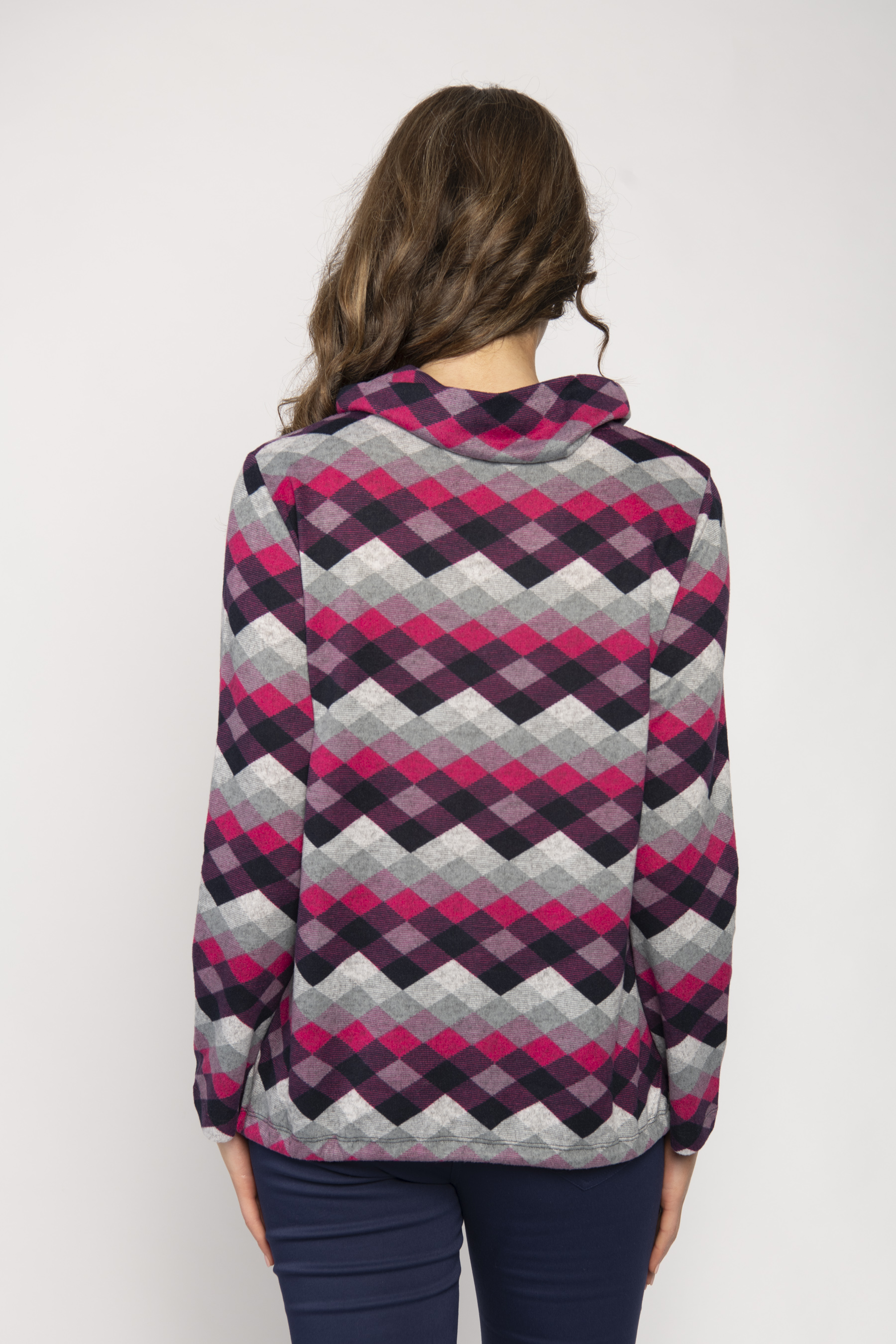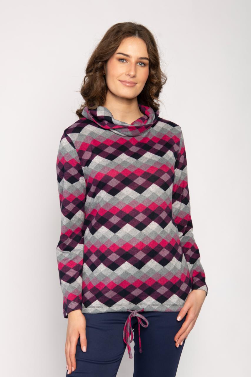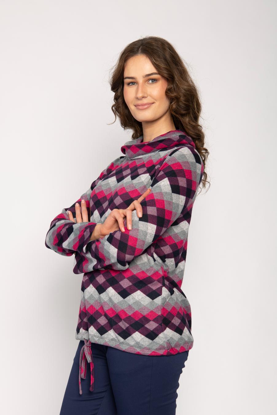 COWL NECK JERSEY TOP WITH TIE WAIST DIAMOND PRINT