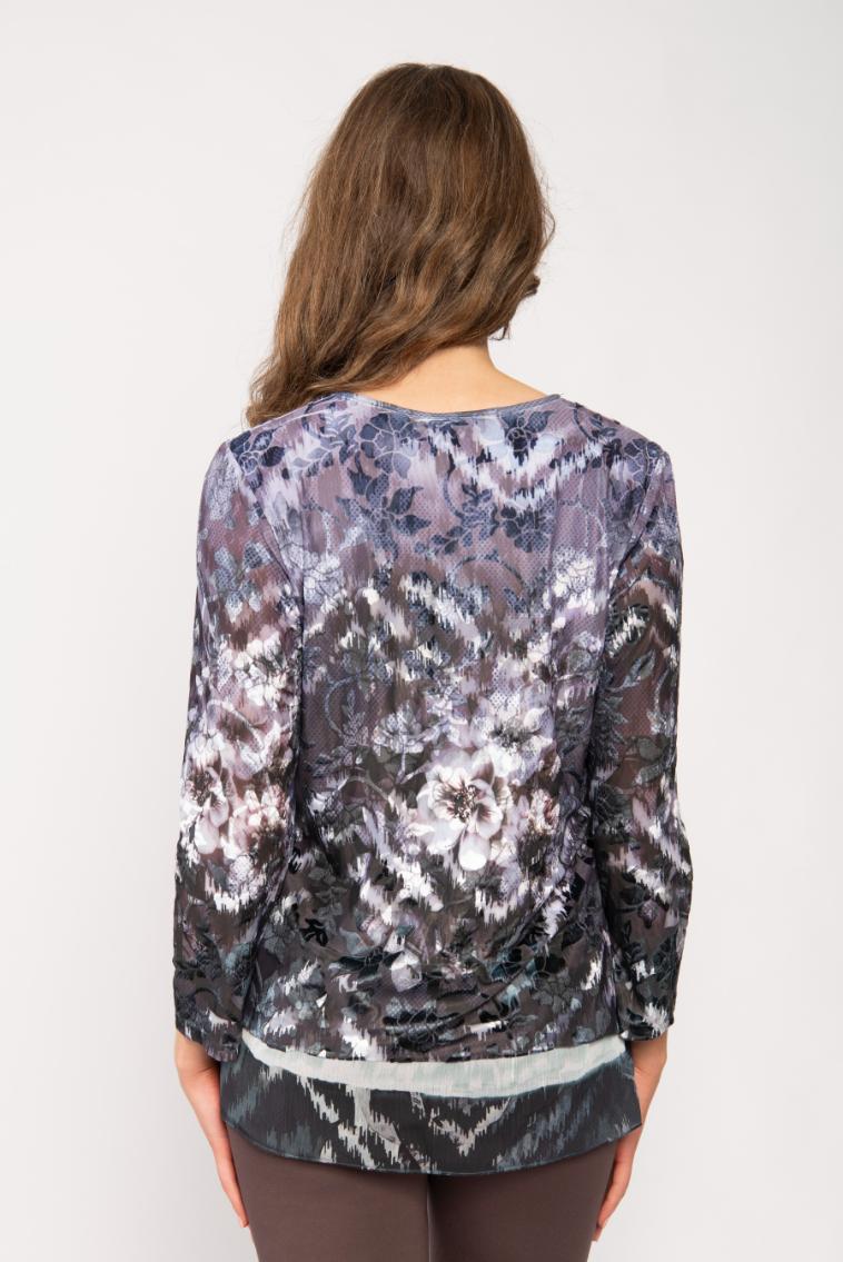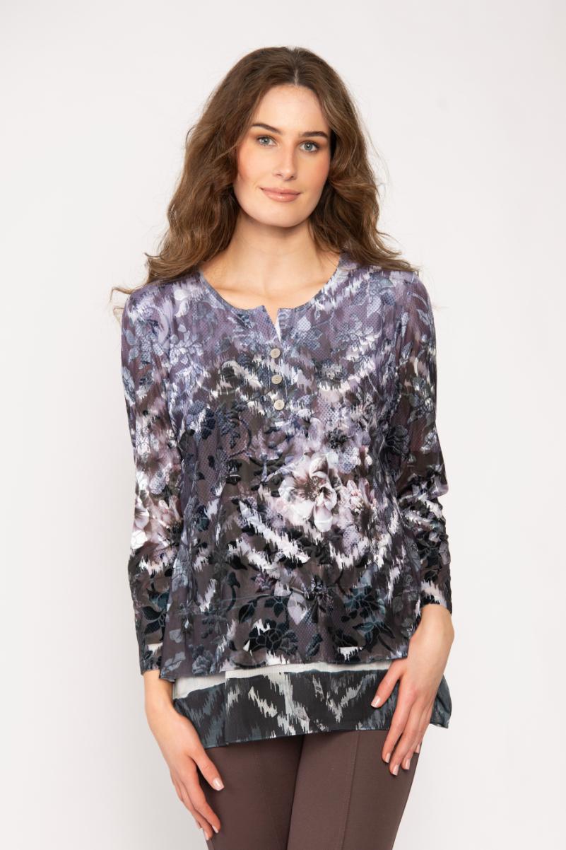 LONG SLEEVE SCOOP NECK JERSEY TOP WITH BUTTONS AND DEVORE FLORAL PRINT