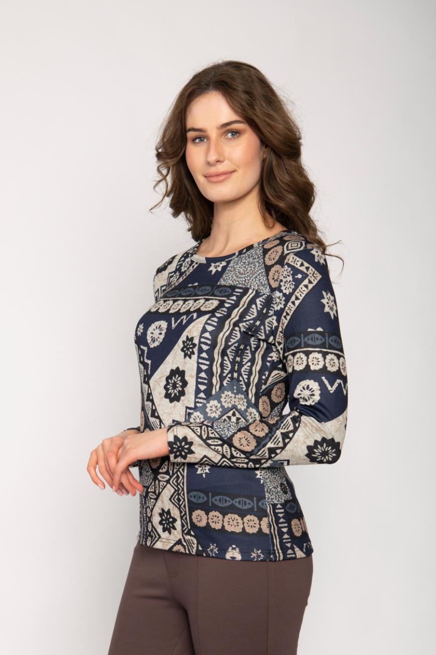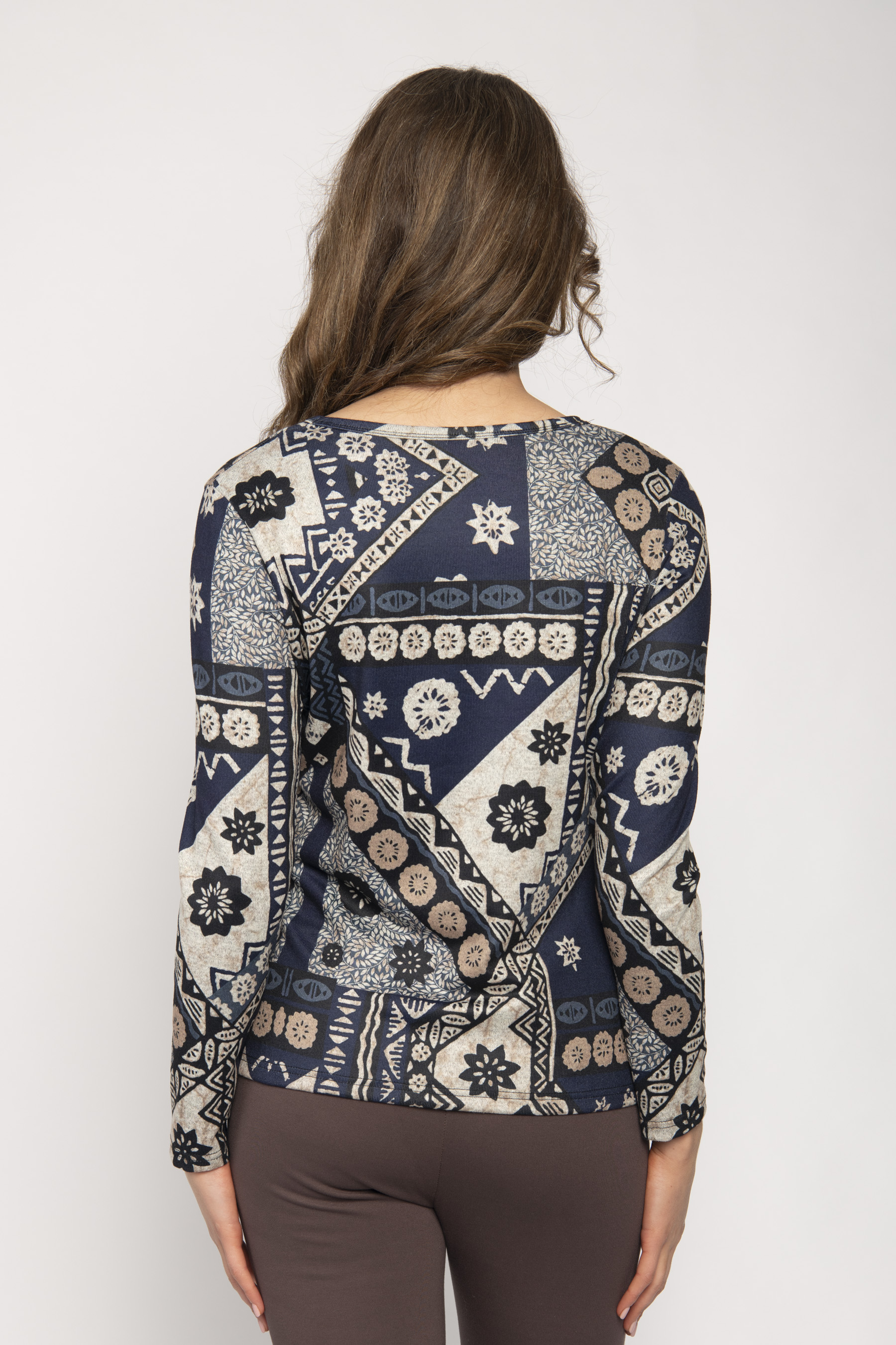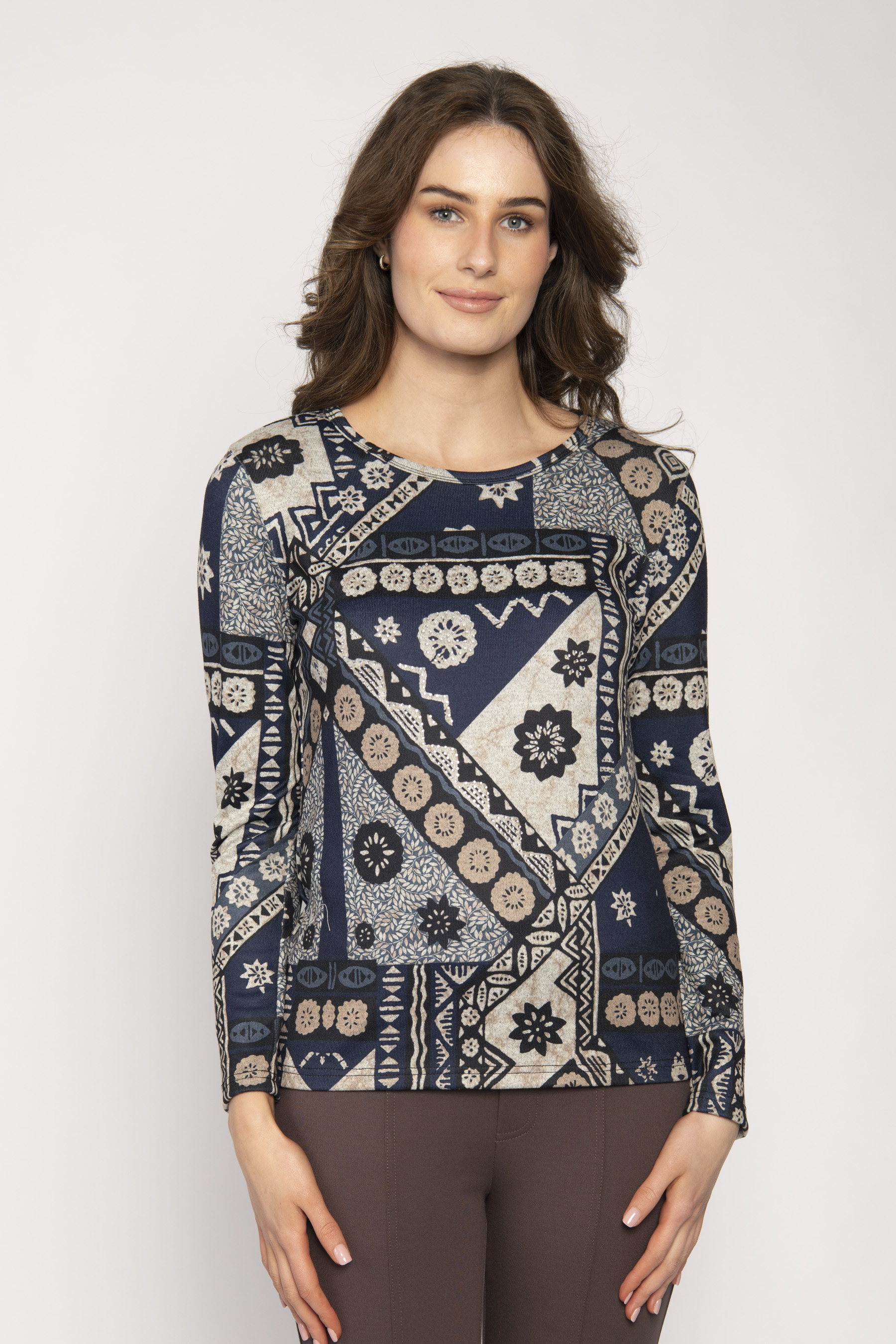BOAT NECK LONG SLEEVE SWIRL LEAF PRINT TOP JERSEY RHINESTONE APPLIQUE