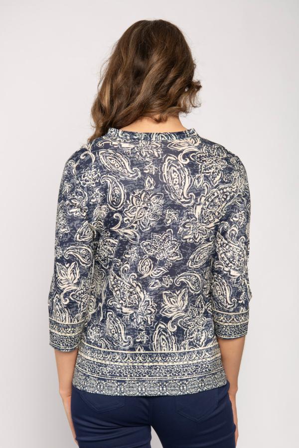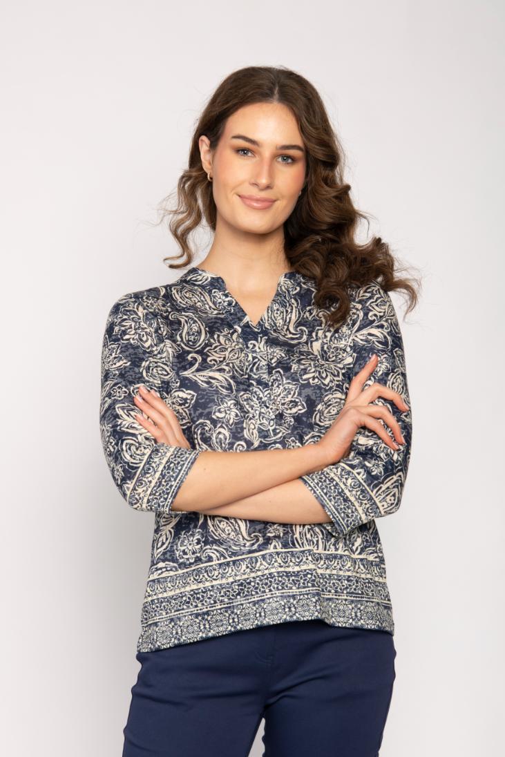 MANDARIN COLLAR V NECK PLACKET LONG SLEEVE FLORAL/PAISLEY PRINT TOP, WITH BORDER PRINT