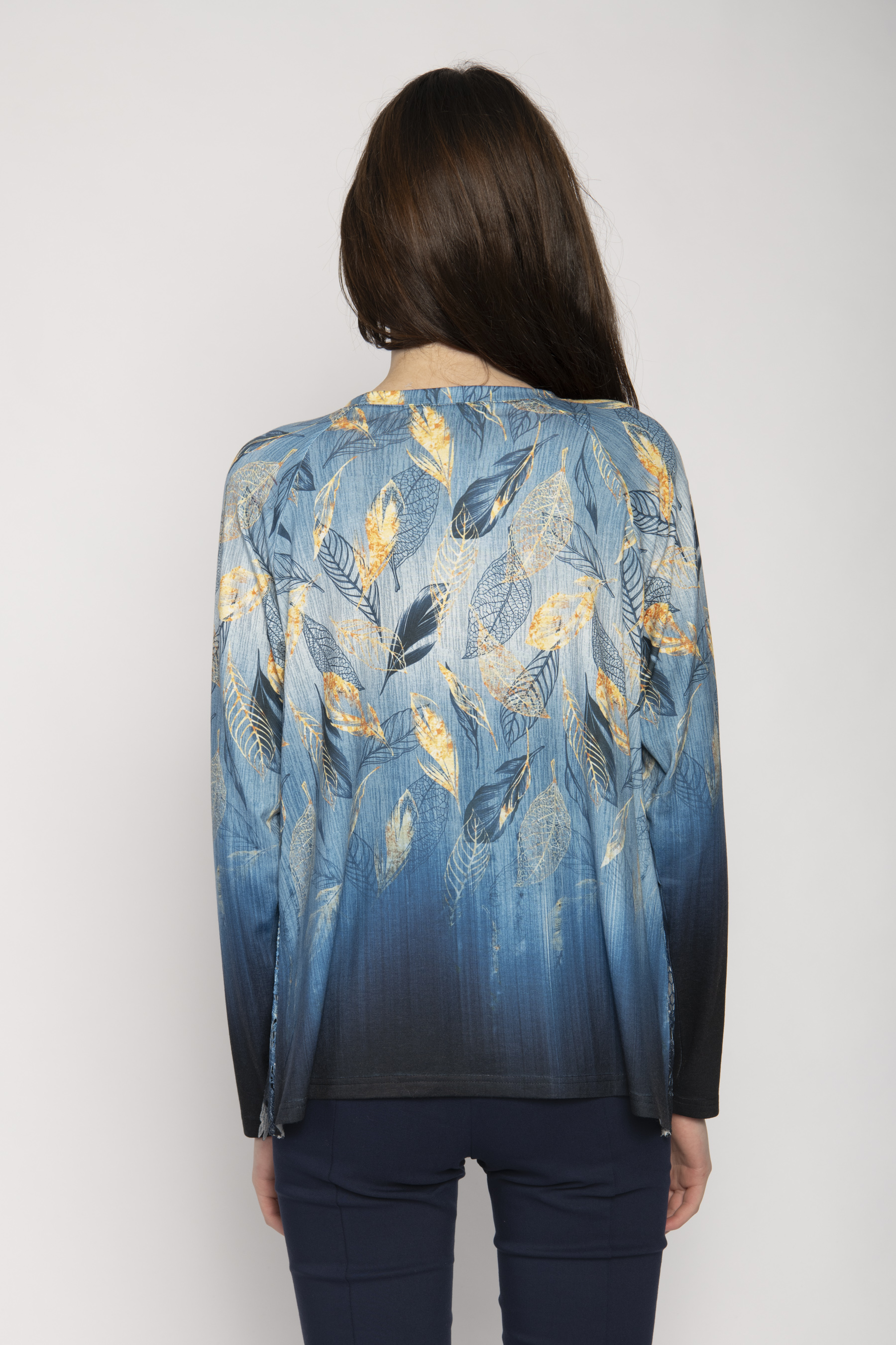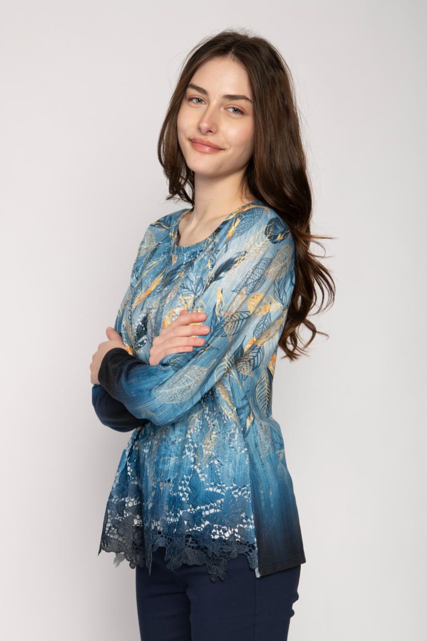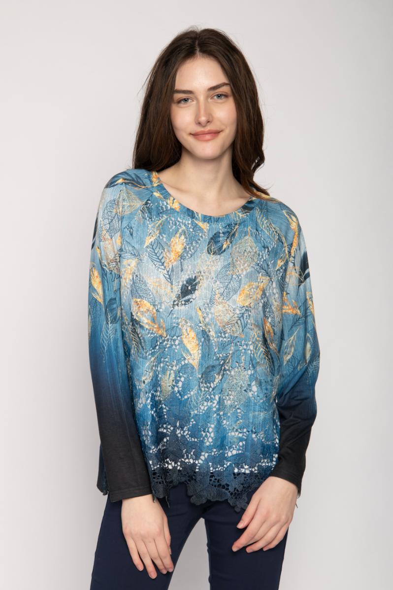 BOAT NECK LONG SLEEVE JERSEY TOP RAGLAN SLEEVE & LEAF PRINT ON LACE FRONT