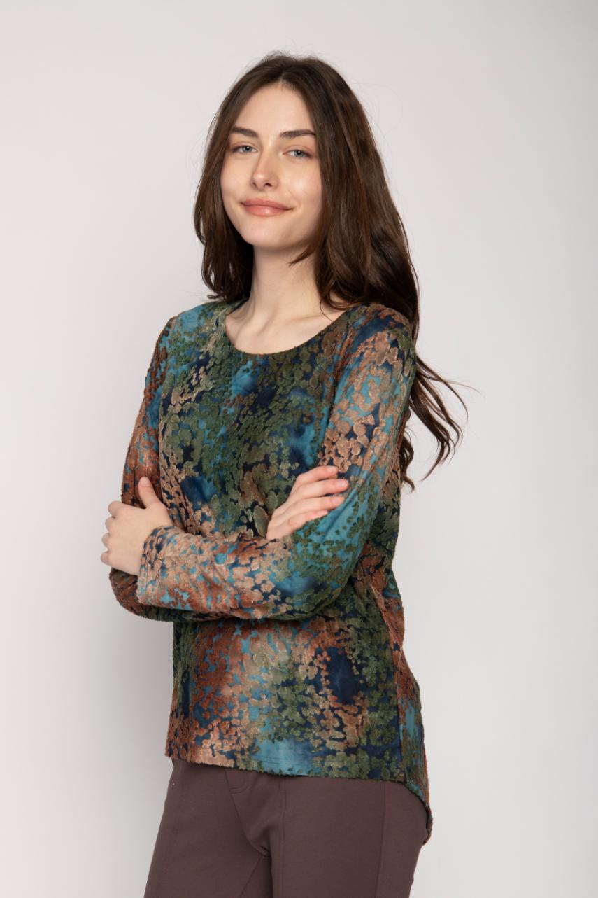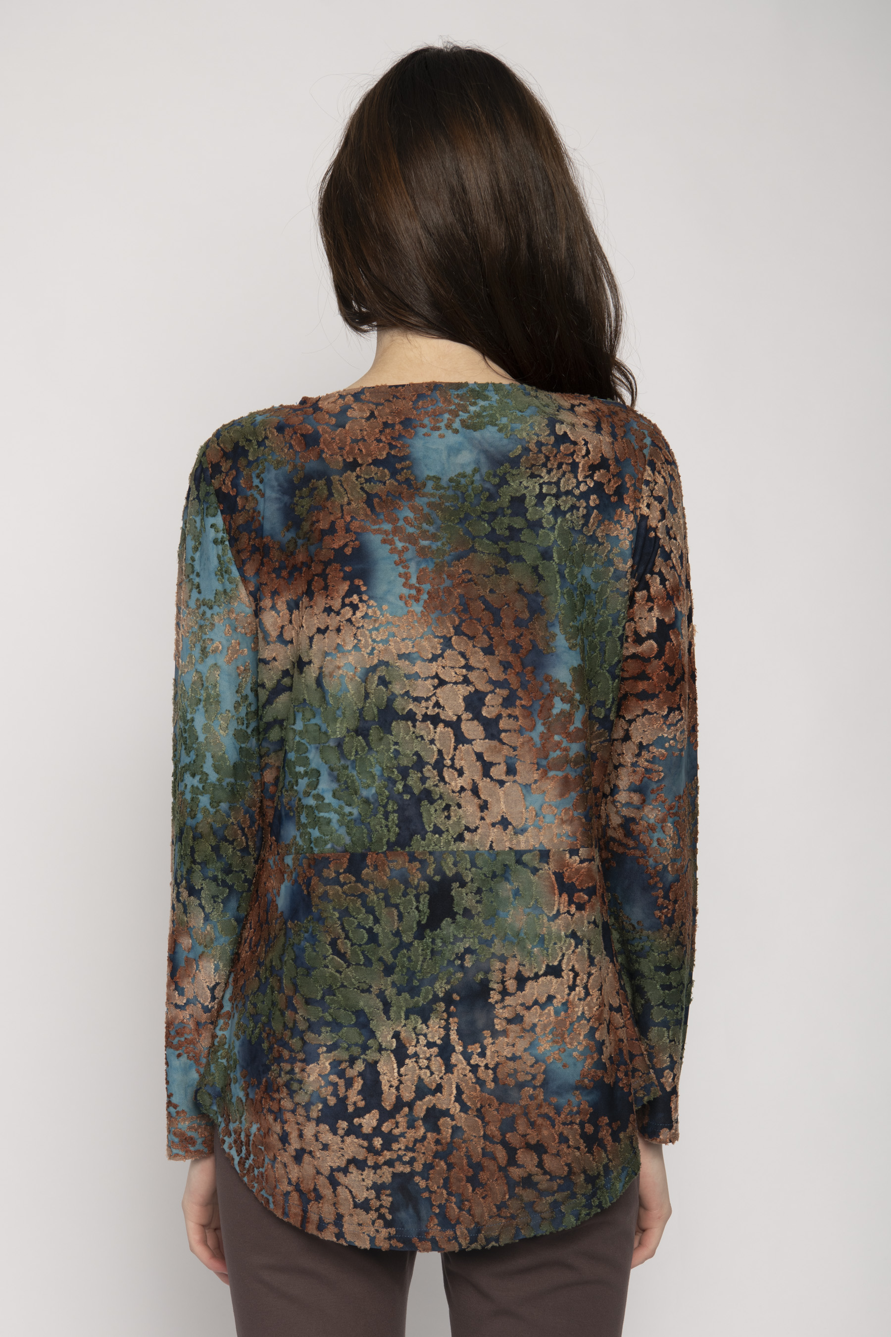 ROUND NECK BURNOUT JERSEY LONG SLEEVE TOP WITH DAPPLED PRINT