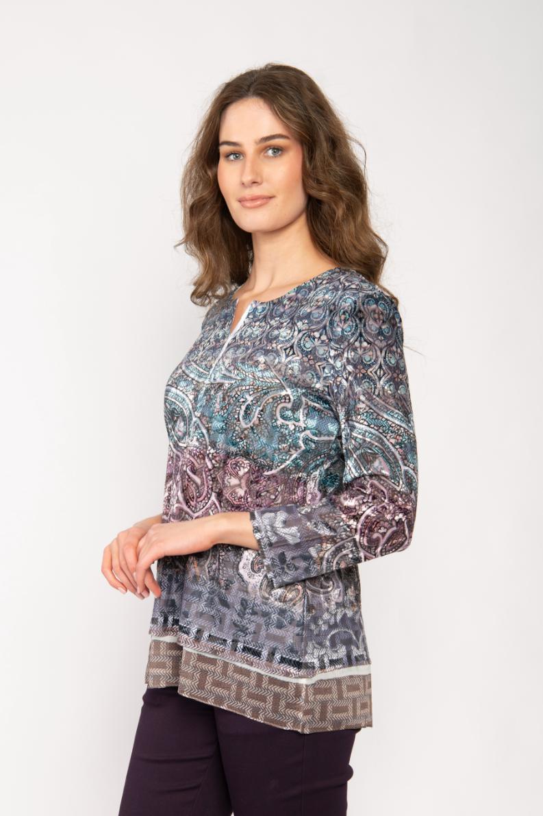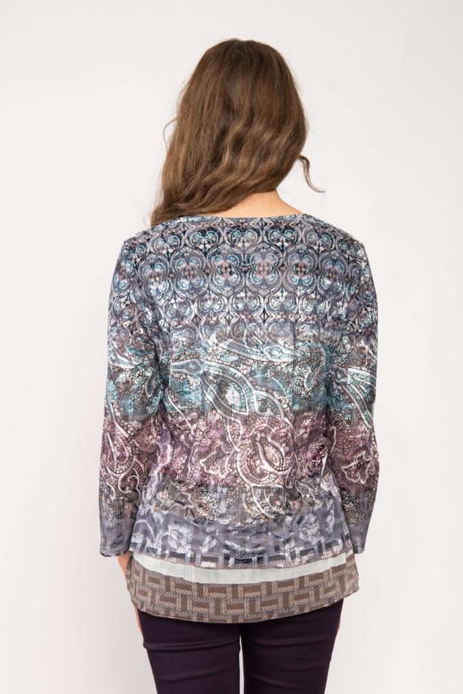 LONG SLEEVE SCOOP NECK JERSEY TOP WITH BUTTONS DEVORE LARGE PAISELY PRINT