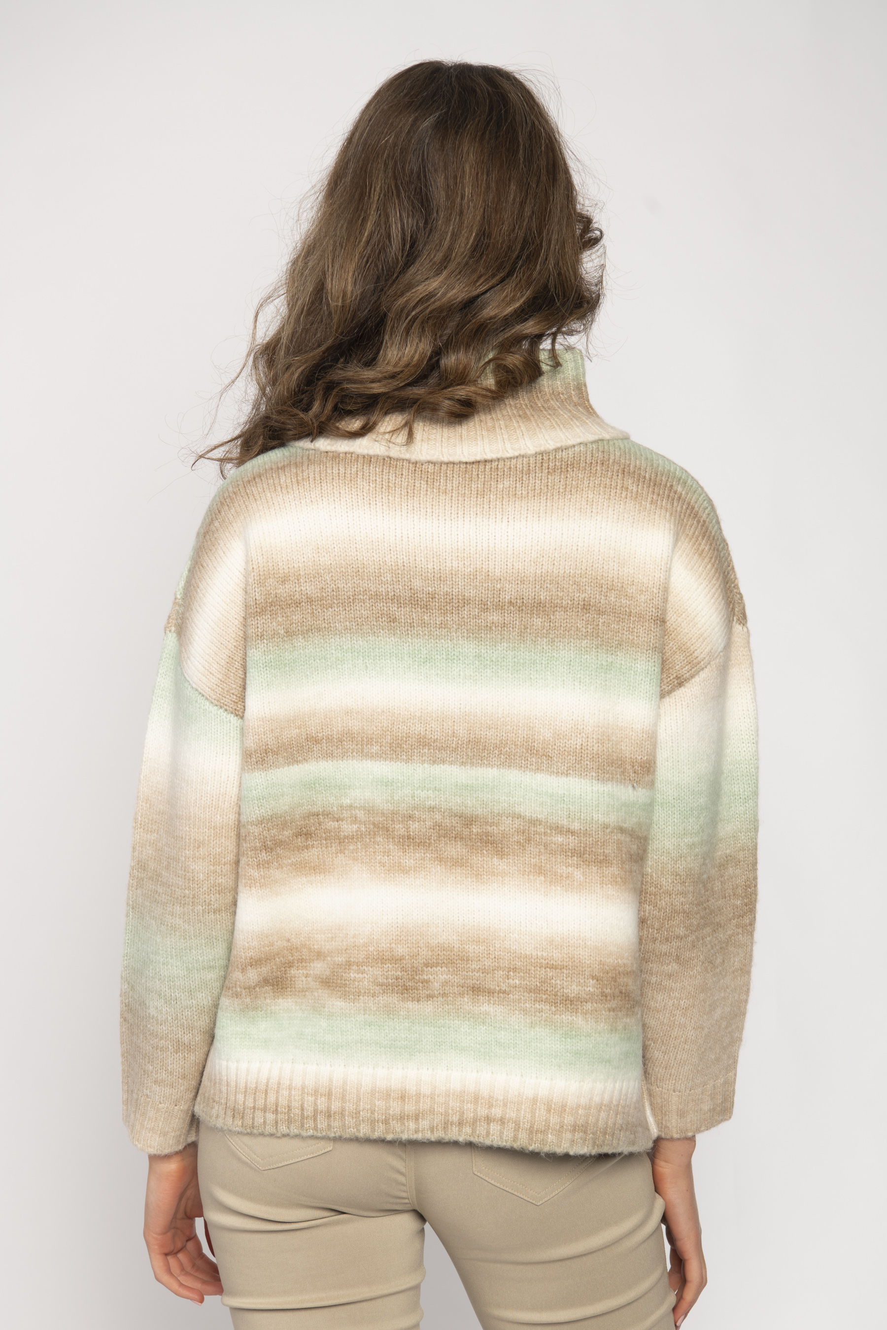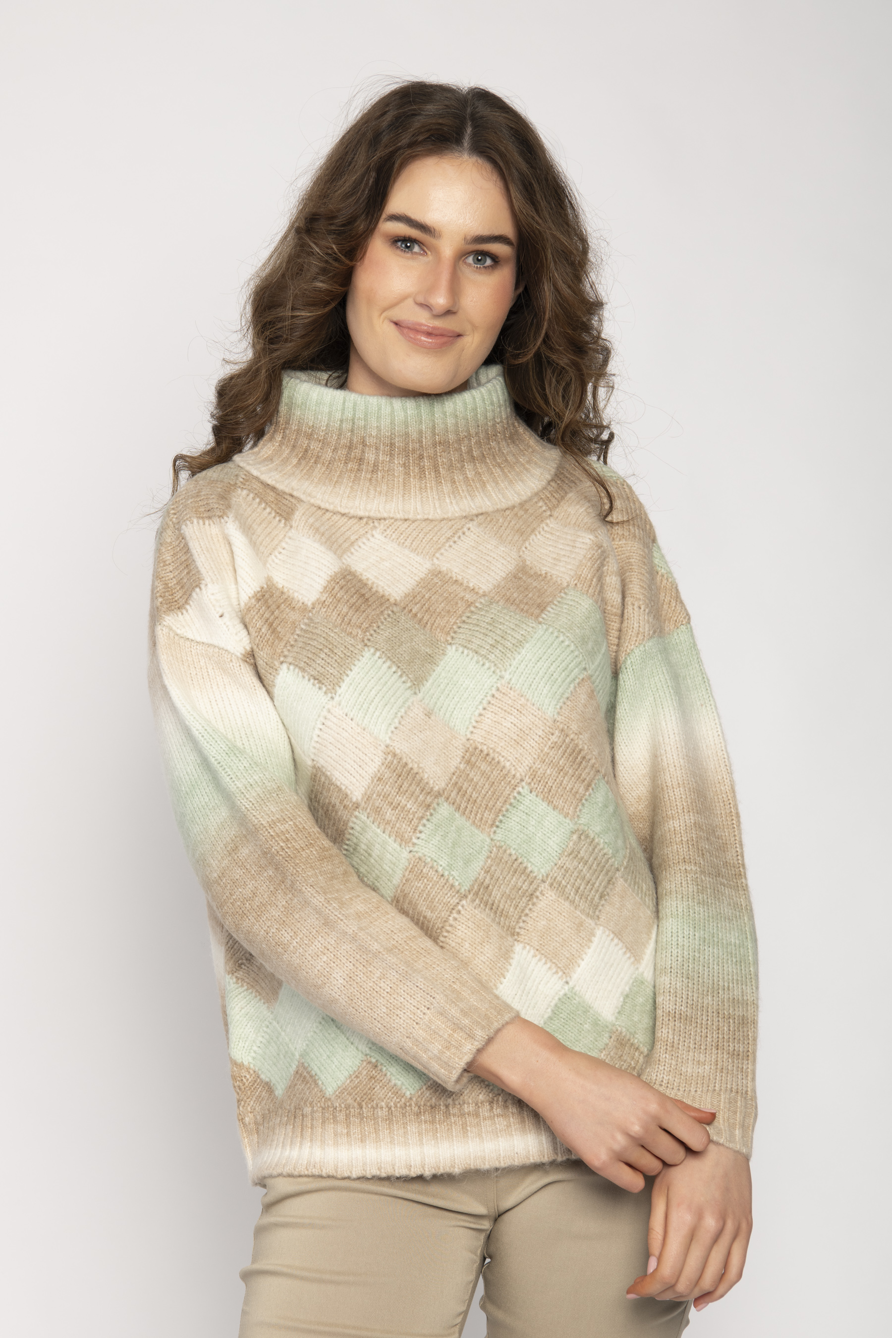 TURTLE NECK SWEATER WITH LATTICE FRONT SPACE DYED JERSEY KNIT BACK