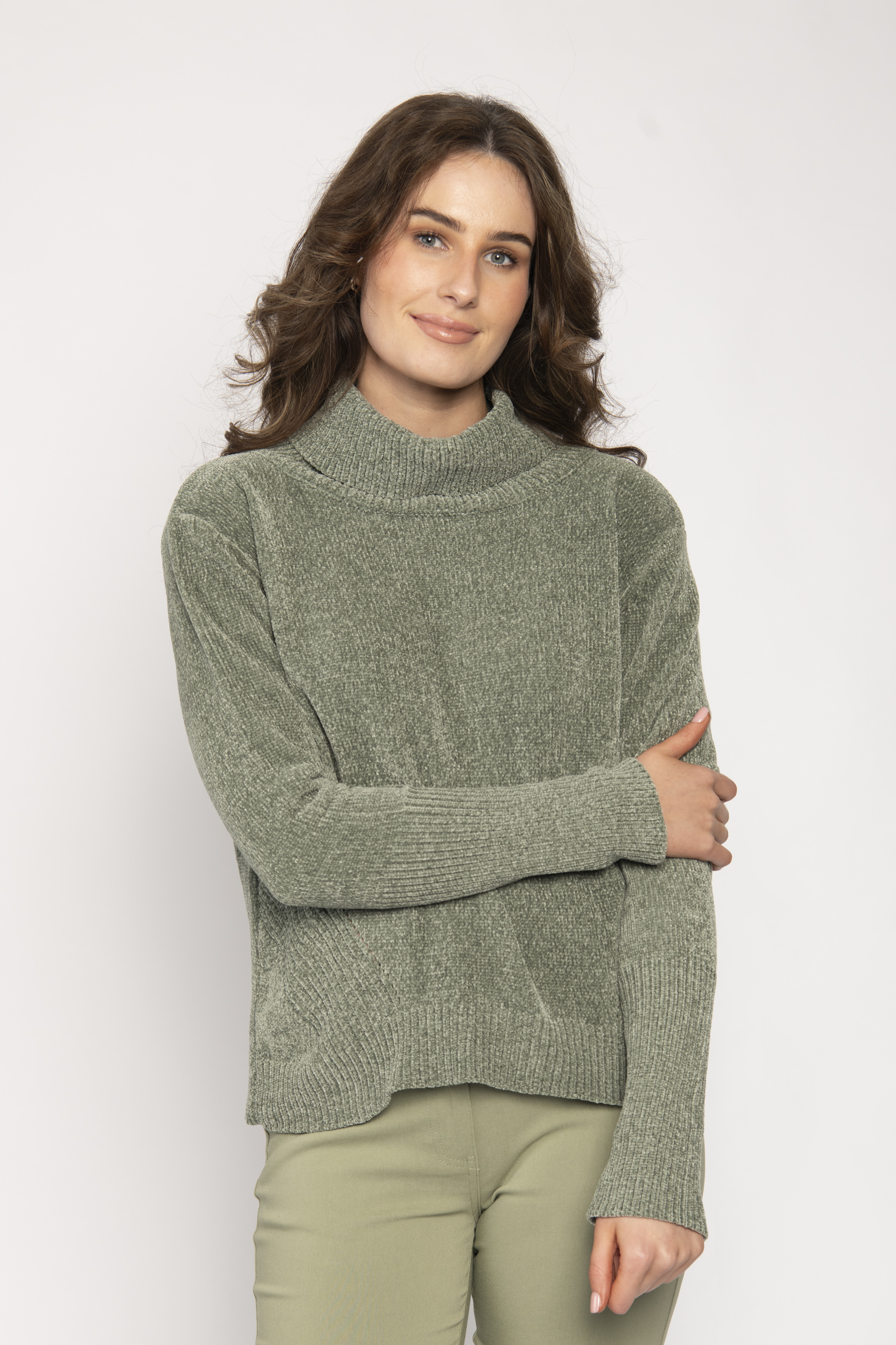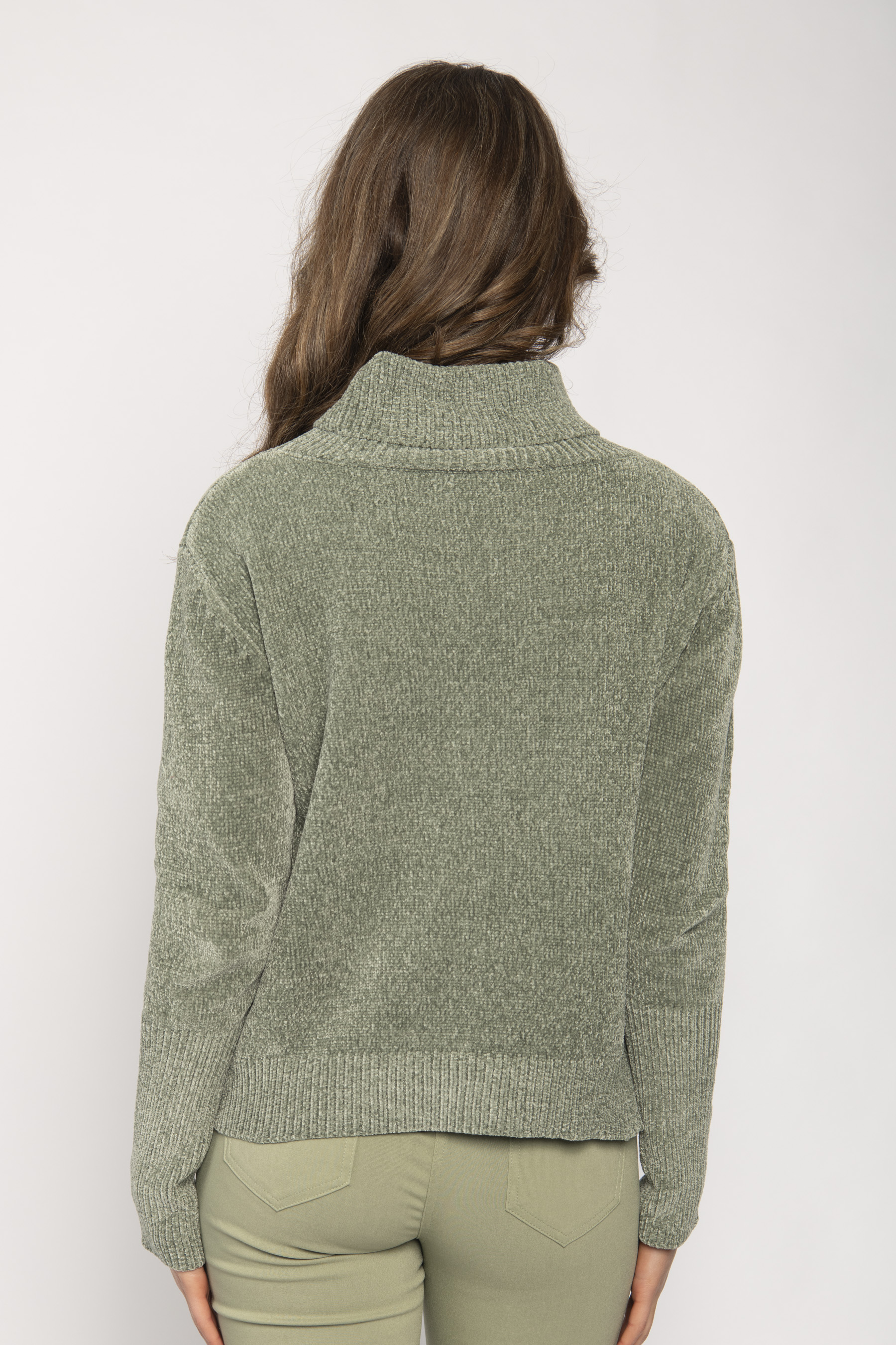 SOFT TURTLE NECK LONG SLEEVE CHENILLE KNIT TOP WITH DIAGONAL RIB AT SIDES & DEEP CUFF