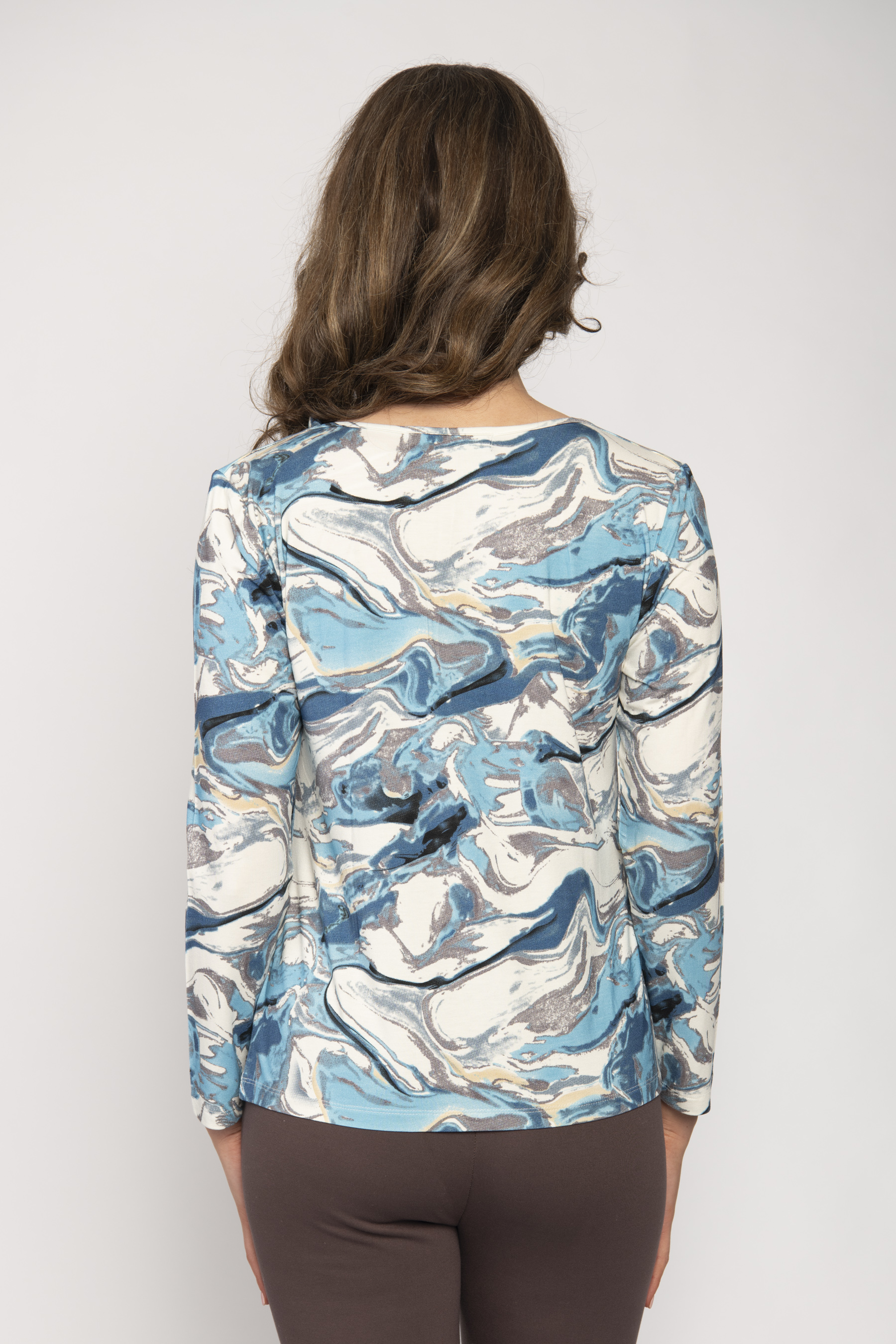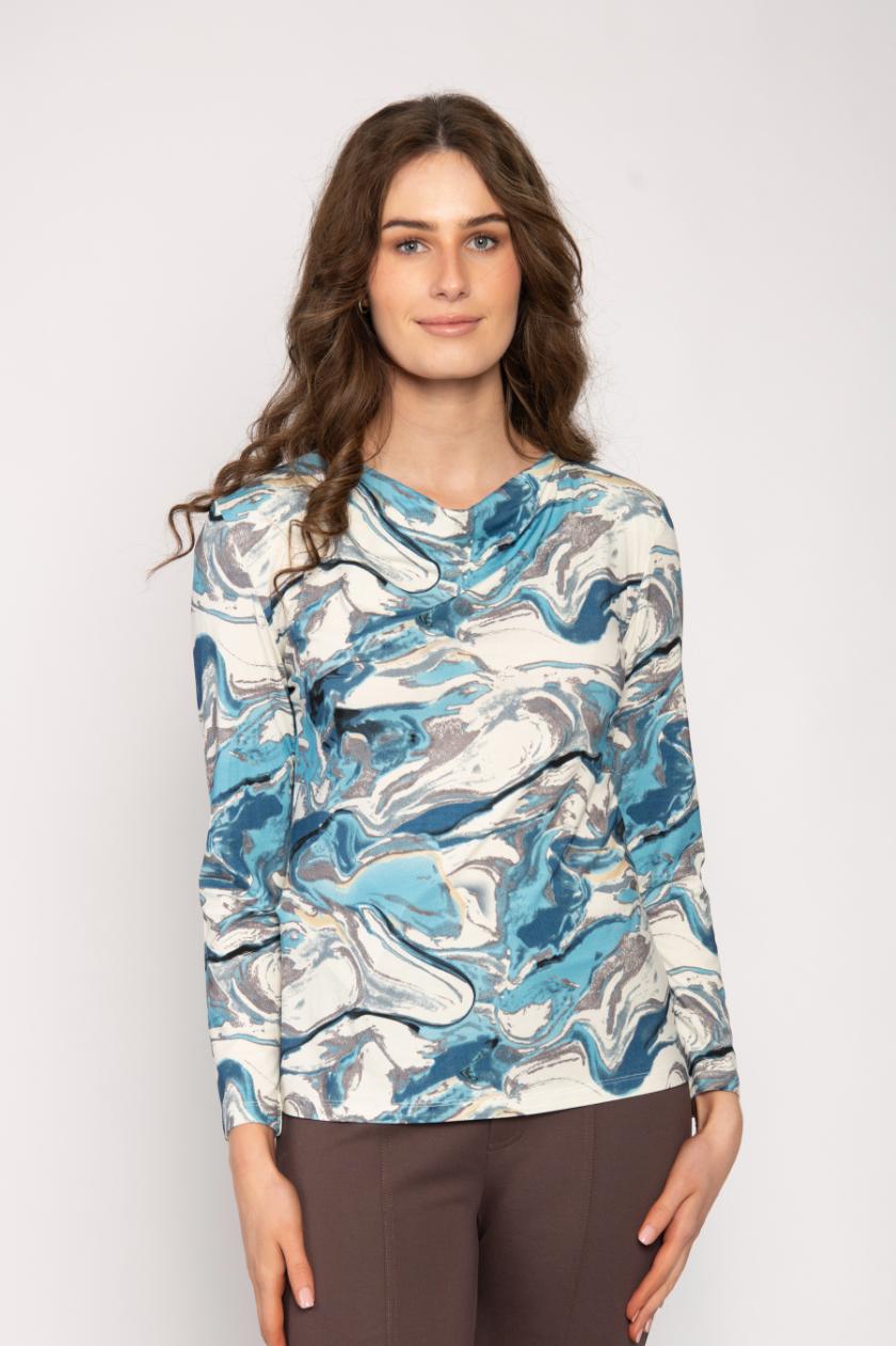 DRAPED SLASH NECK JERSEY LONG SLEEVE TOP WITH WATER WAVE PRINT