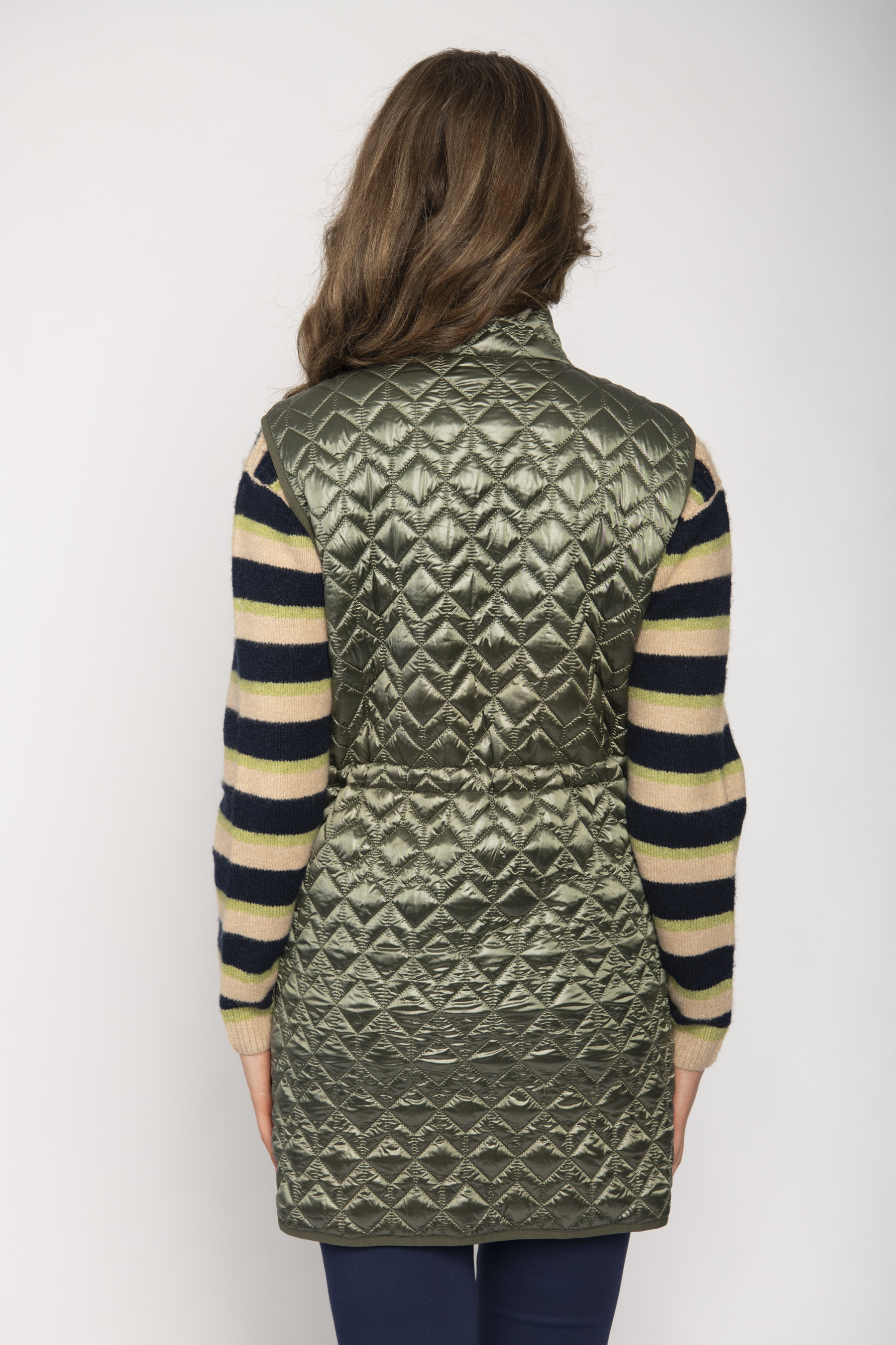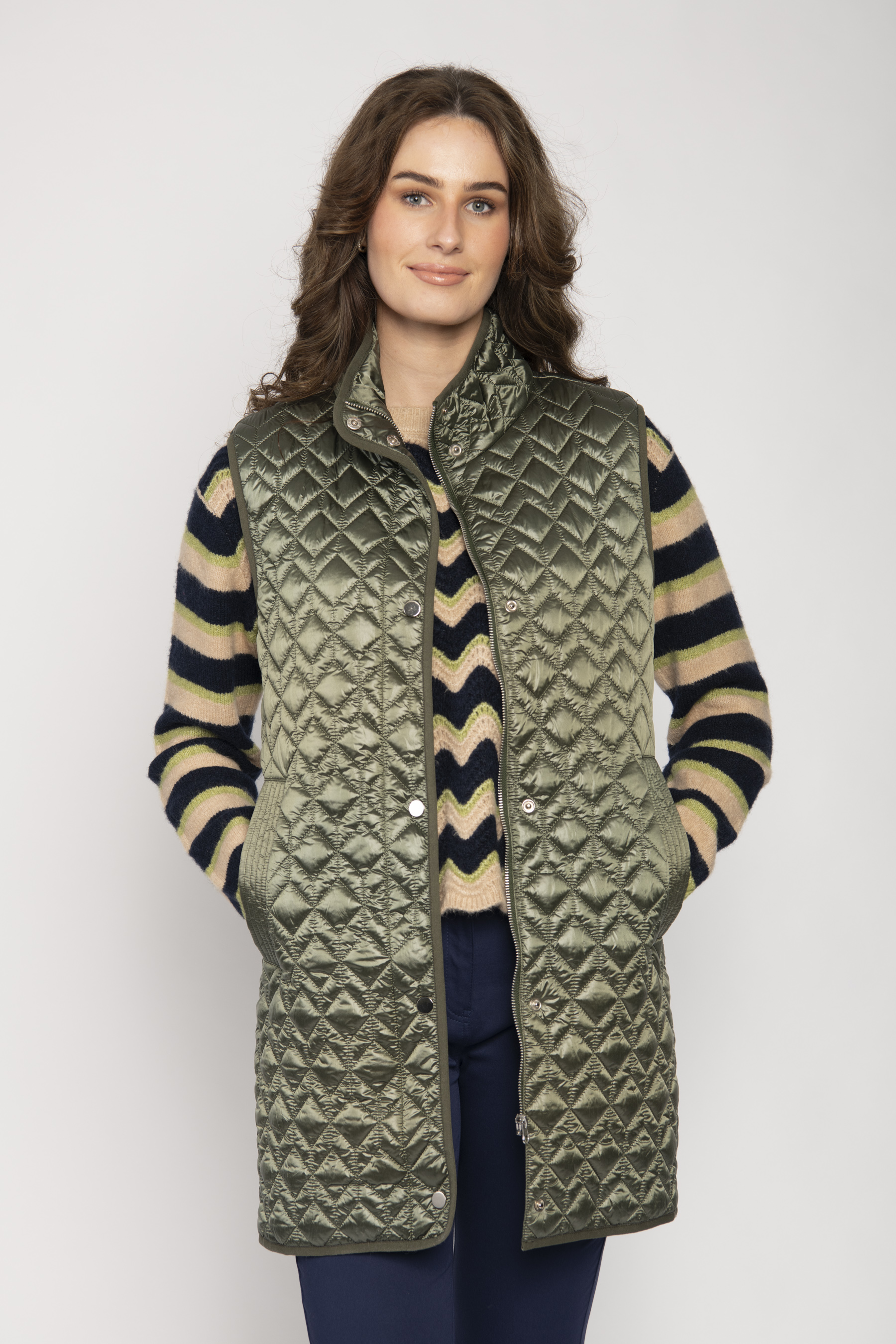 STAND COLLAR DIAMOND STITCH QUILTED LONG GILET SIDE ZIP & PKT