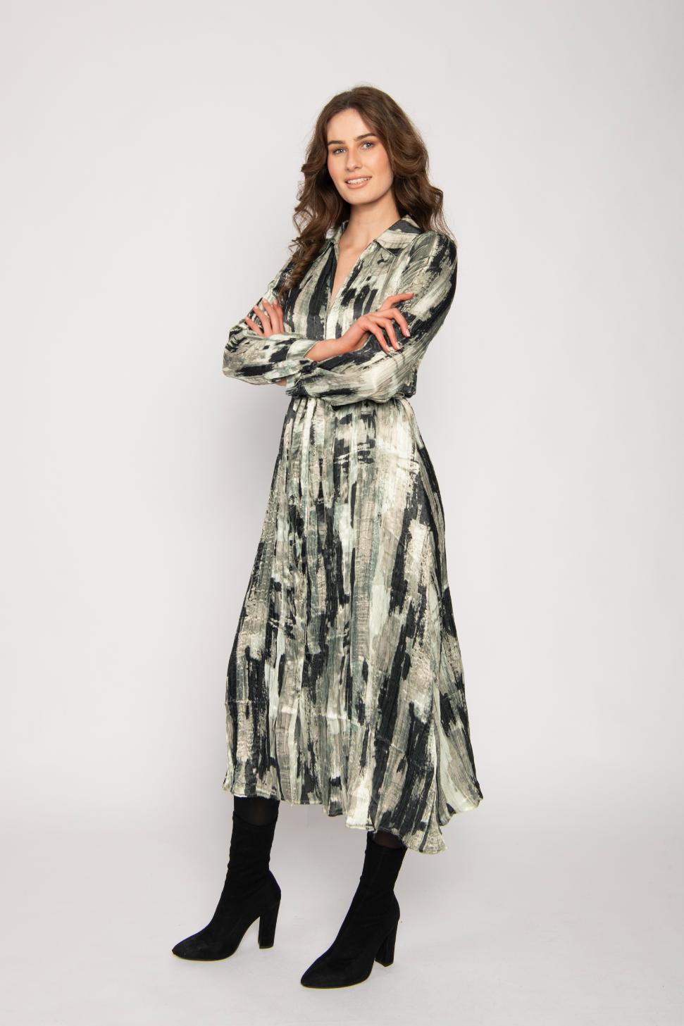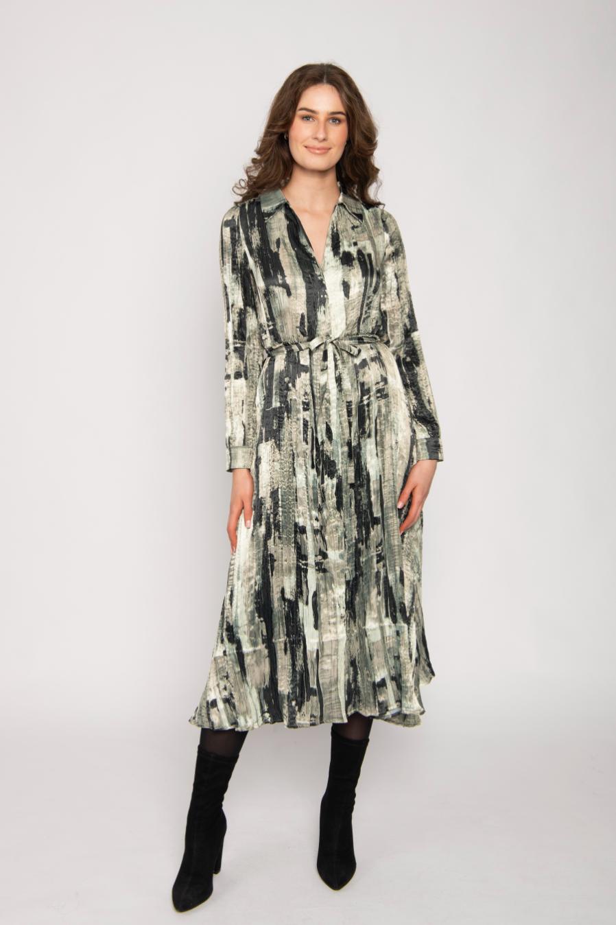 SHIRT NECK CRINKLED LONG SLEEVE CONCEALED BUTTON FRONT MIDI DRESS WITH ELASTIC & TIE WAIST & ALL OVER BRUSH STROKE PRINT