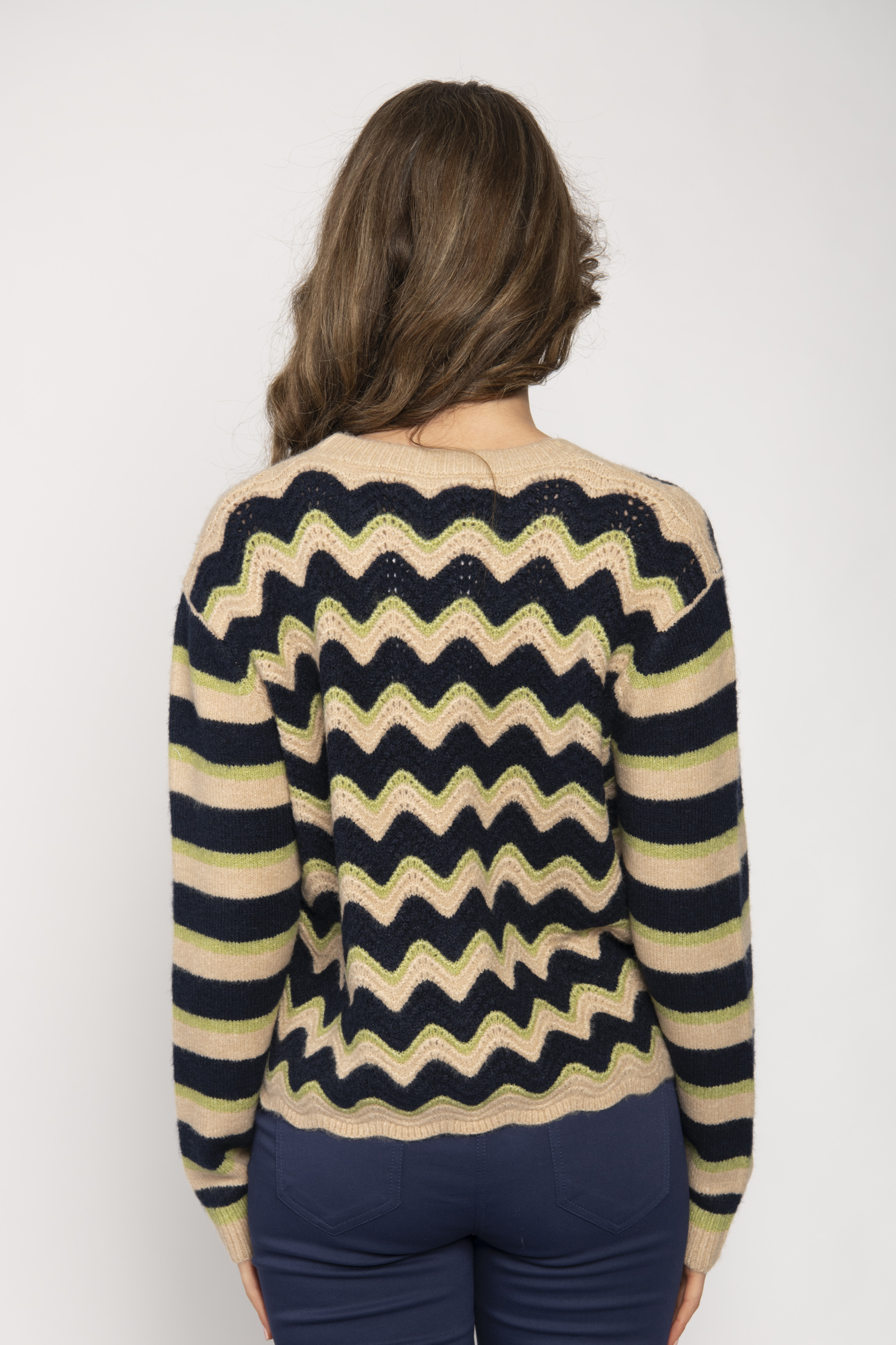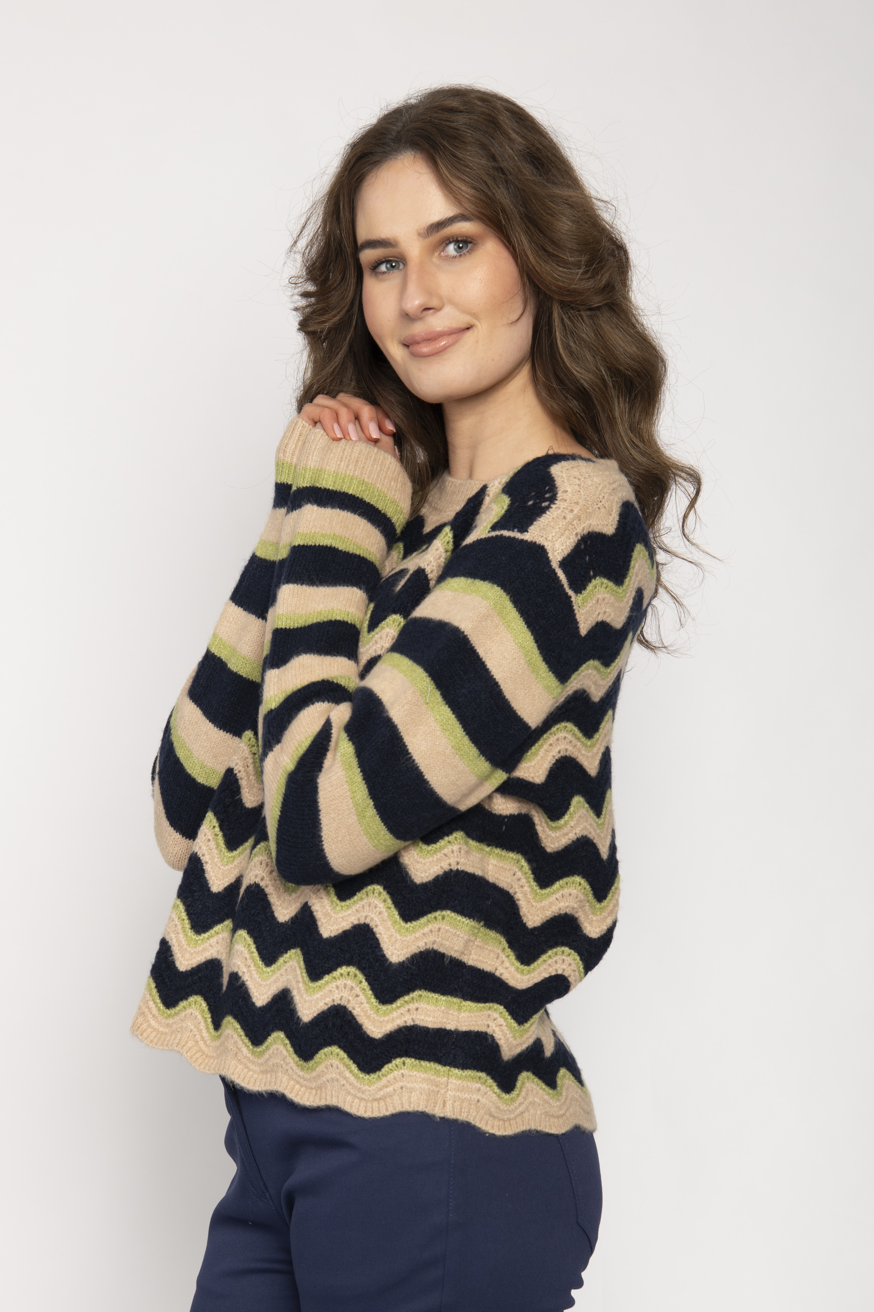 ROUND NECK LONG SLEEVE SWEATER WITH HORIZONTAL WAVY STRIPE CROCHET EFFECT