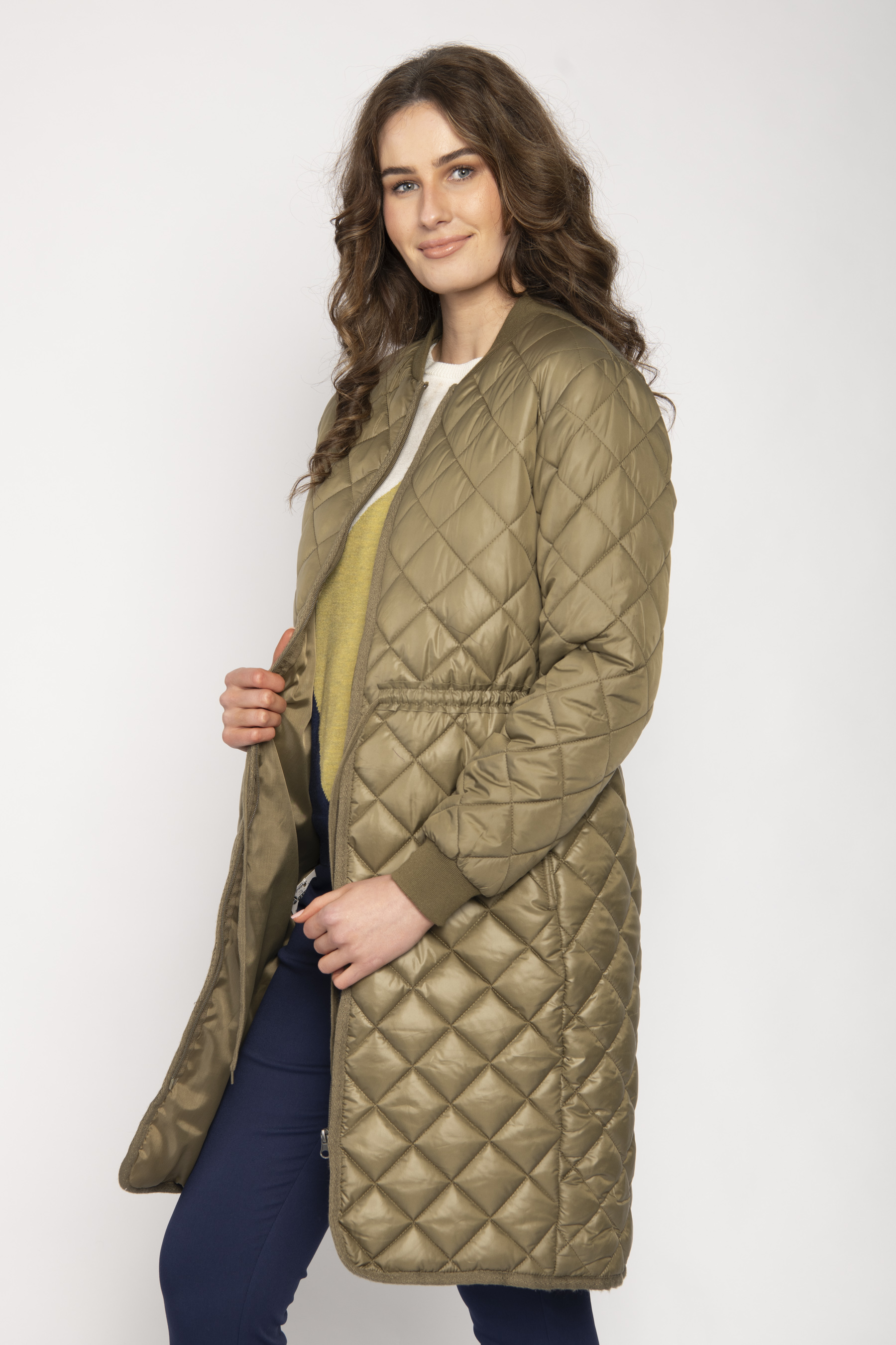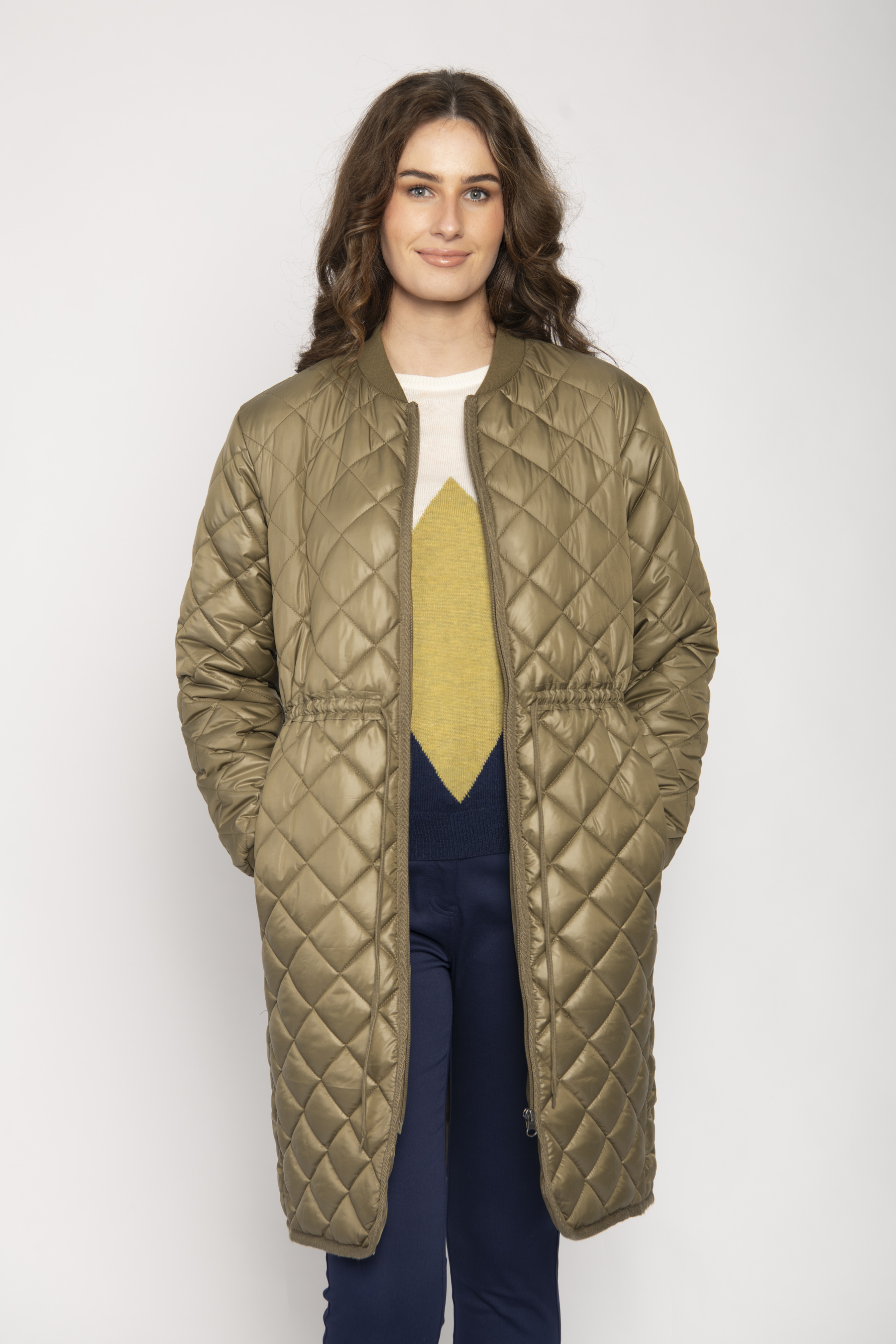 RIB COLLAR LONG PADDED JKT TIE WAIST DIAMOND STITCHED