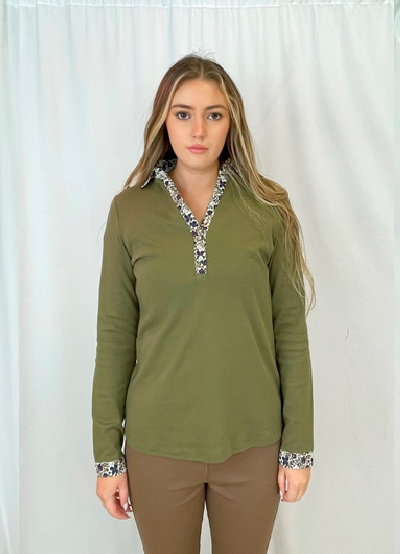FLORAL PRINTED SHIRT COLLAR JERSEY TOP LONG SLEEVE WITH PRINT CUFF TRIM
