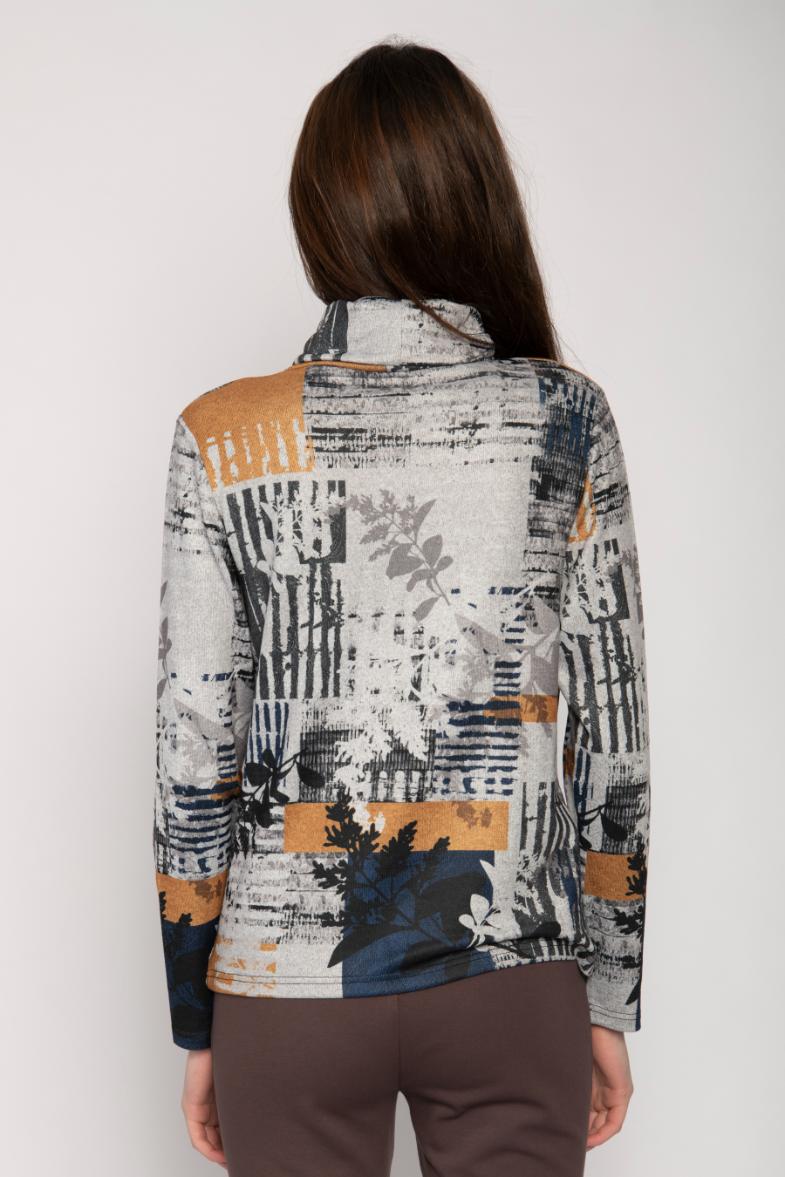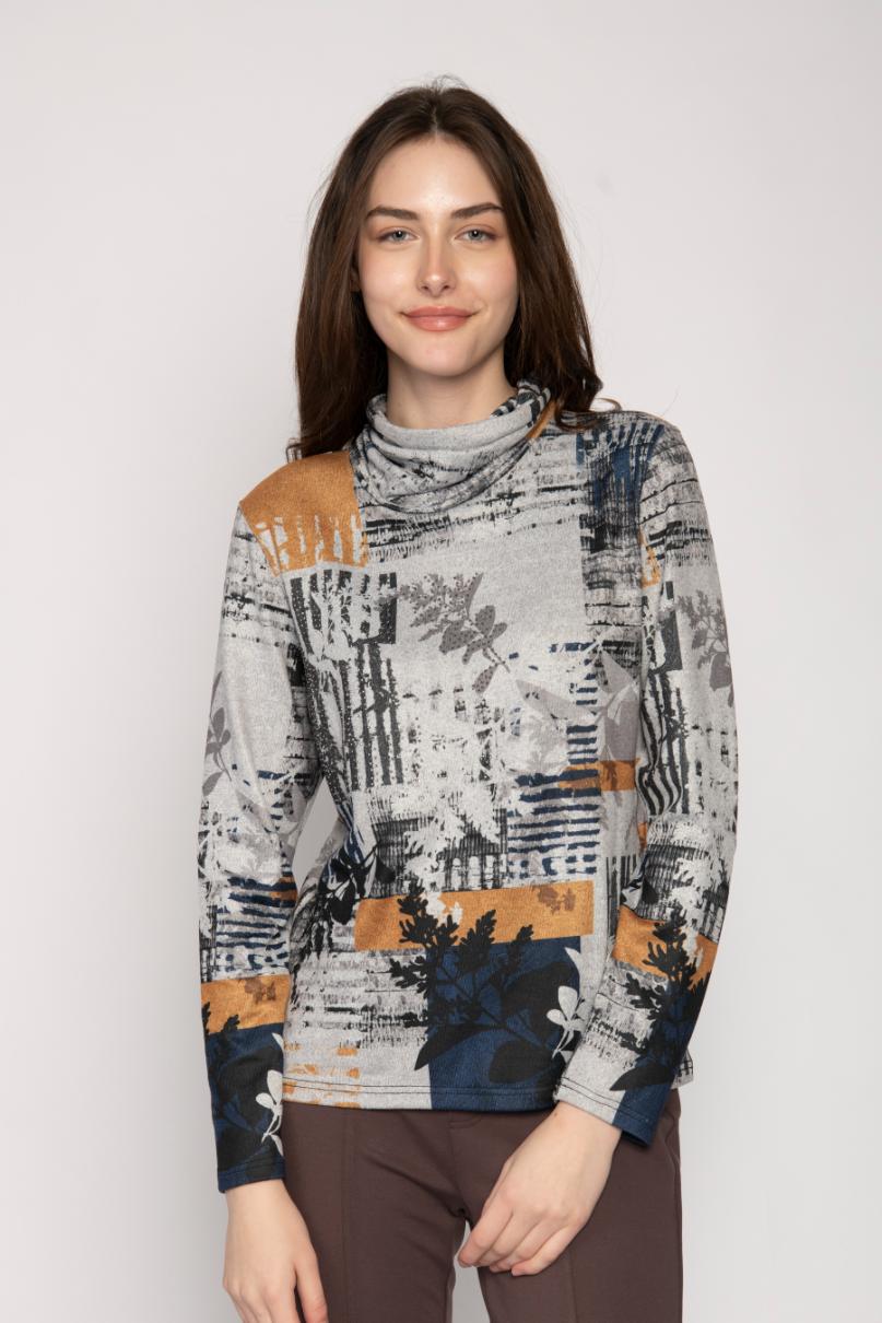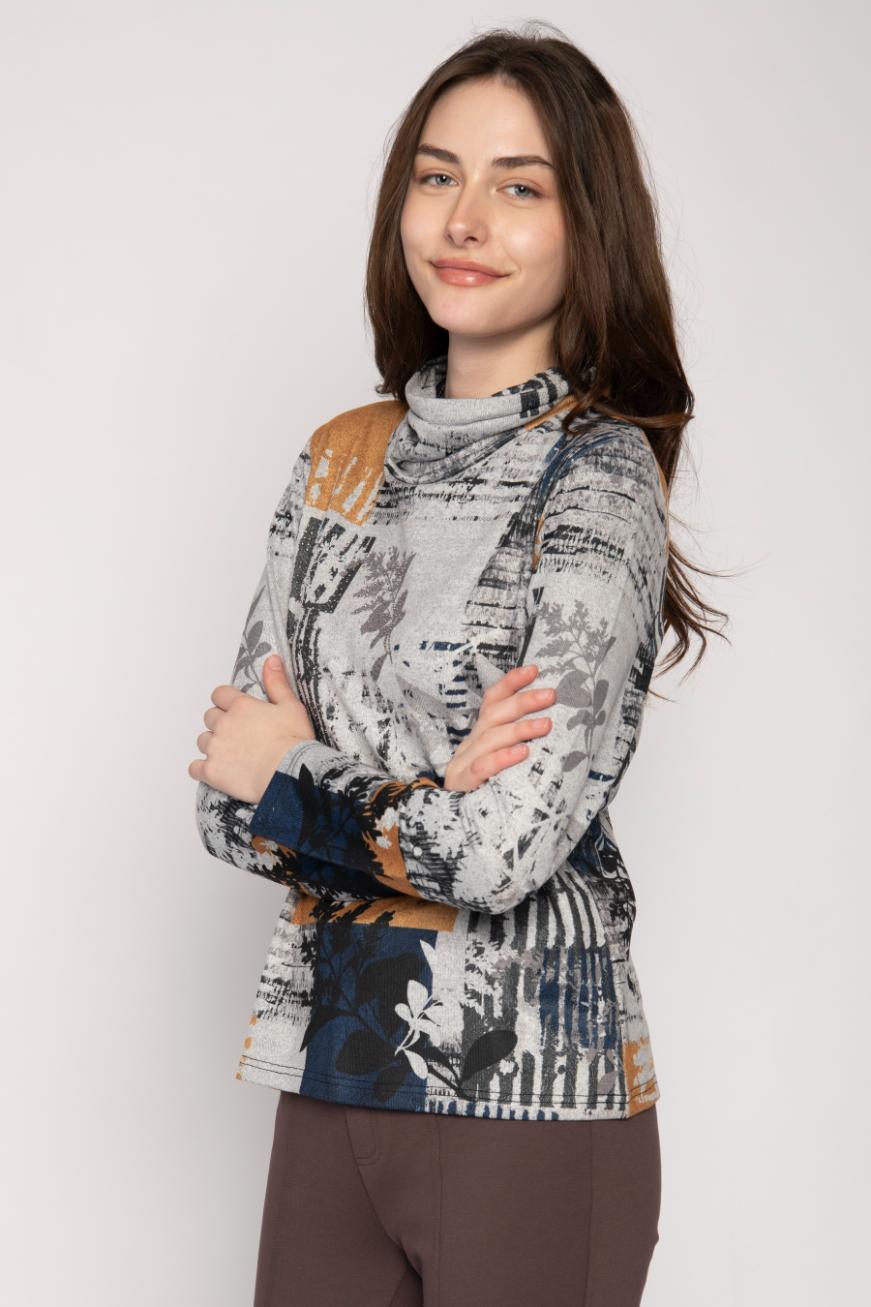 COWL NECK LONG SLEEVE ABSTRACT LEAF PRINT TOP JERSEY RHINESTONE APPLIQUE