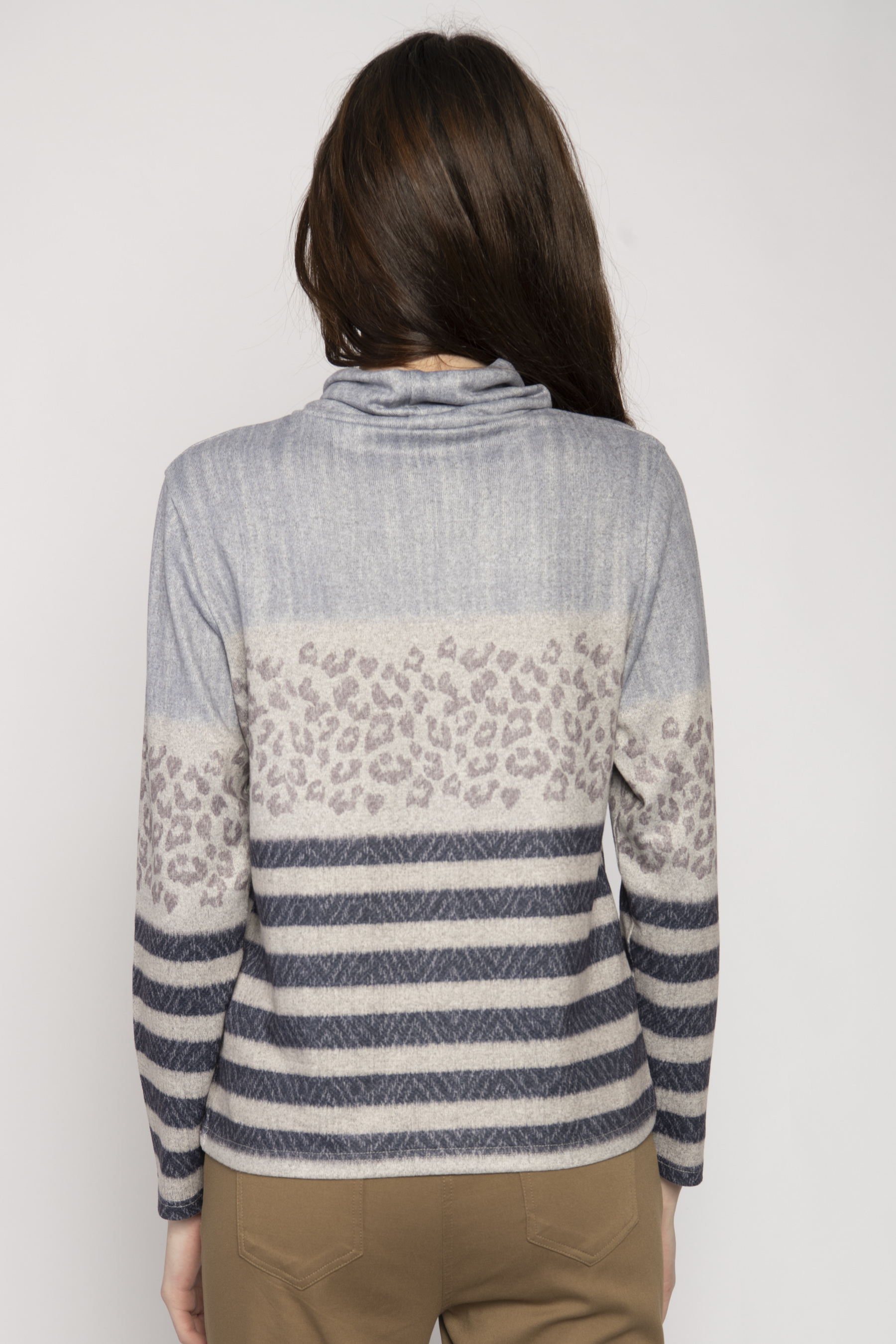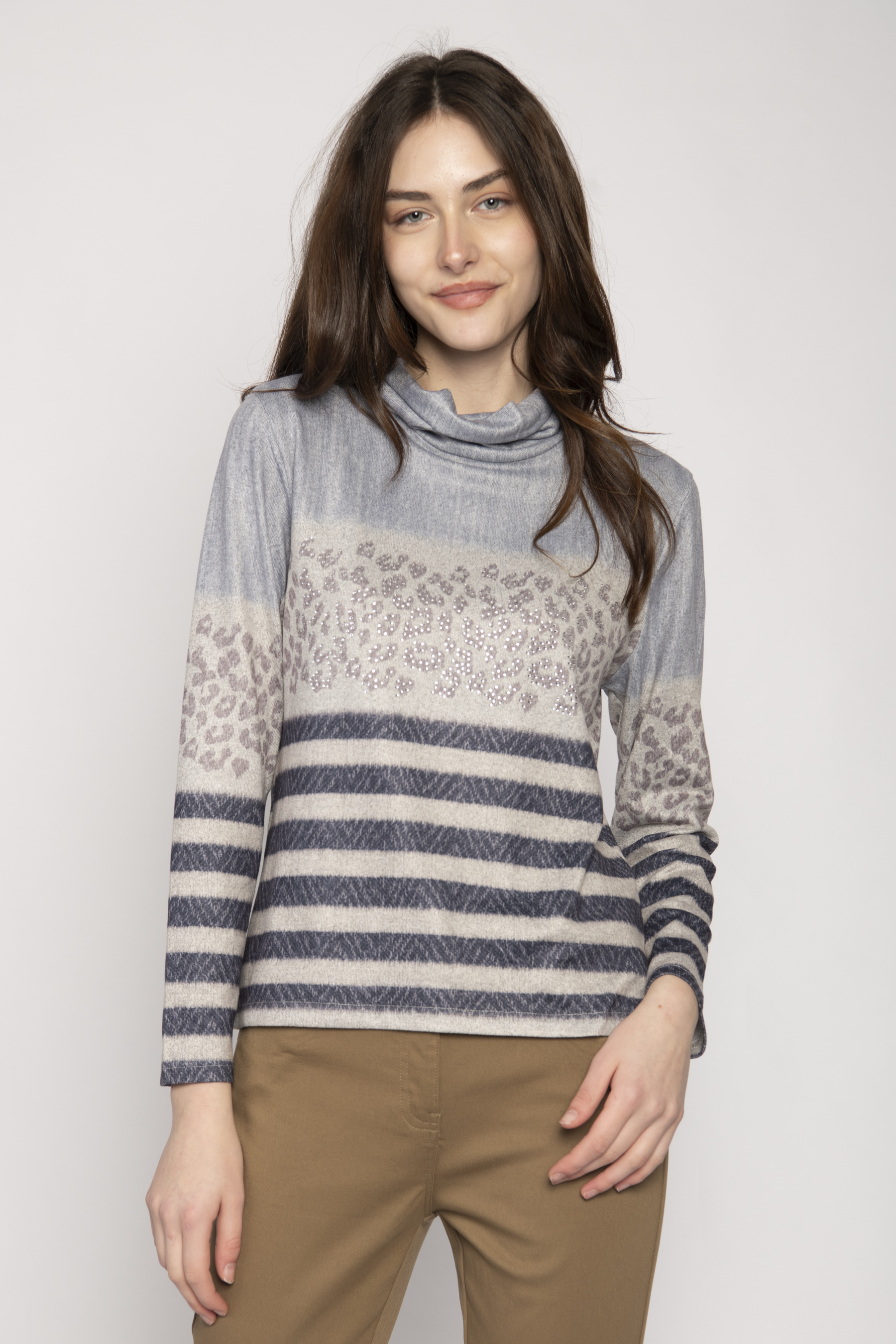 COWL NECK LONG SLEEVE ABSTRACT ANIMAL/STRIPE PRINT TOP WITH RHINESTONE APPLIQUE