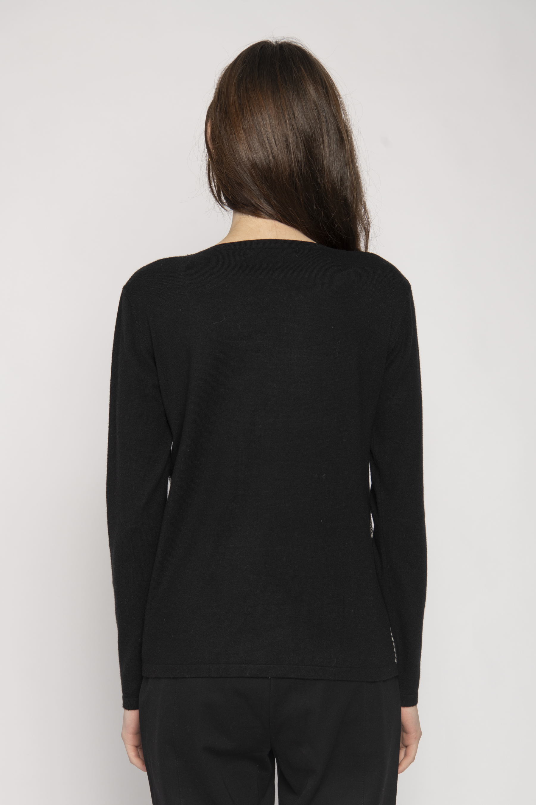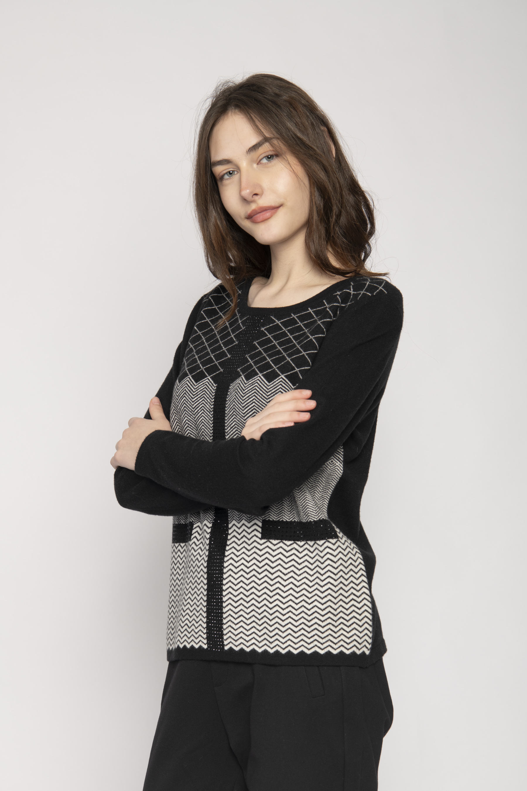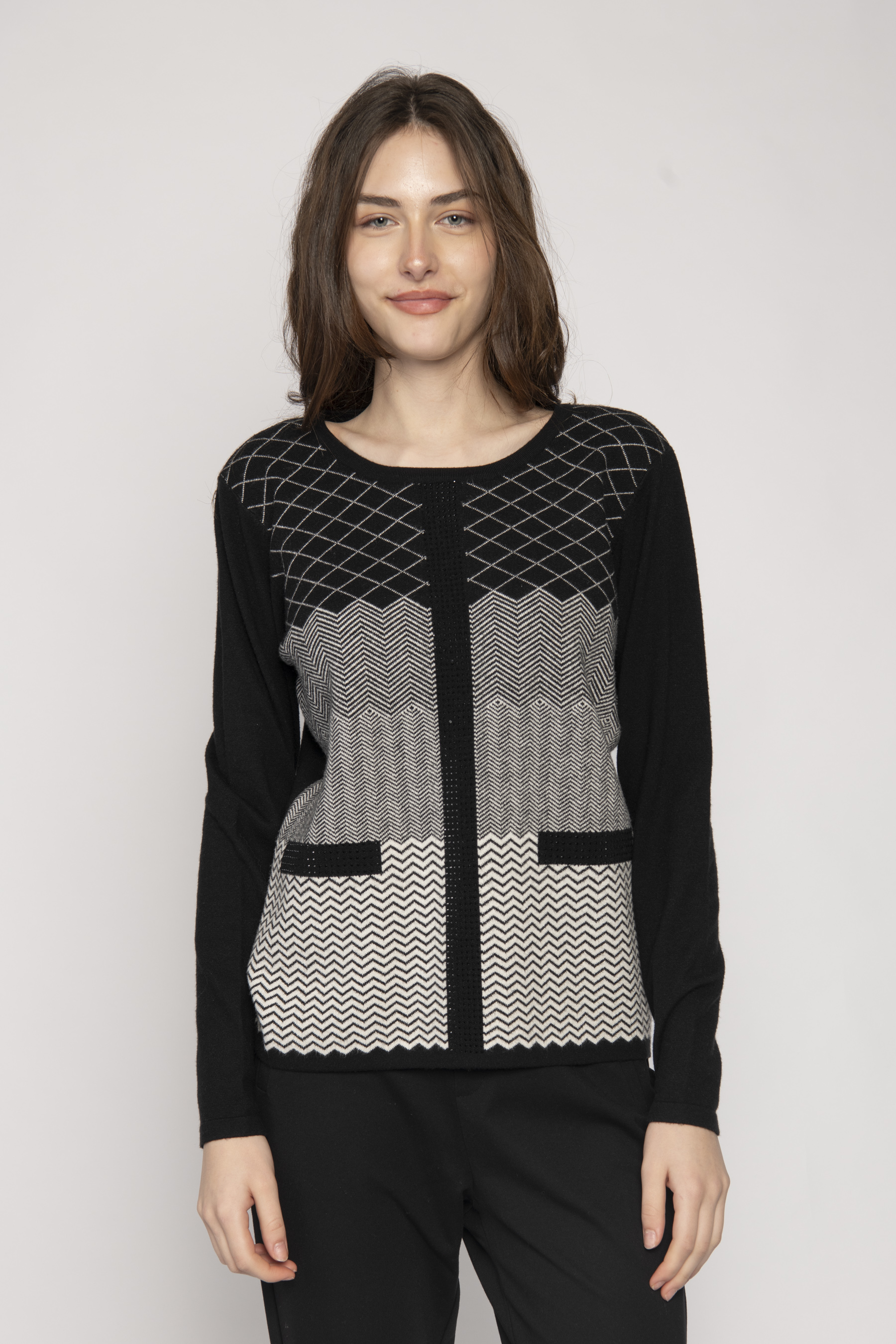 ROUND NECK LONG SLEEVE SWEATER CHEVRON/DIAMOND PATTERN & DIAMONTE APPLIQUE
