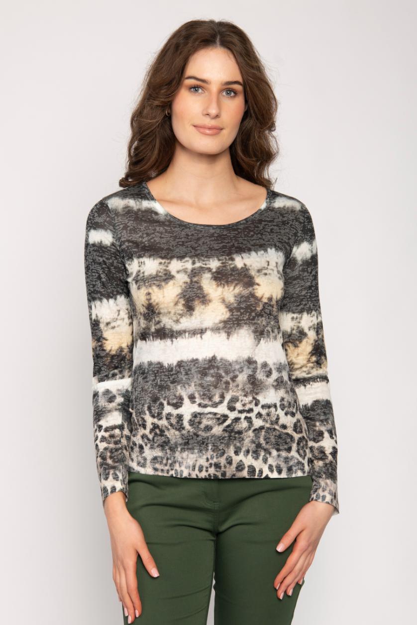 SCOOP NECK JERSEY LONG SLEEVE TOP WITH TIE DYE ANIMAL PRINT