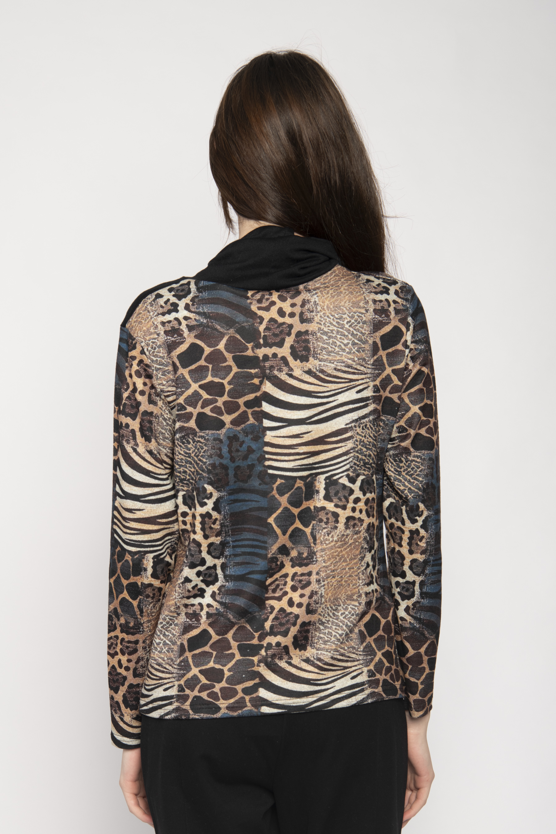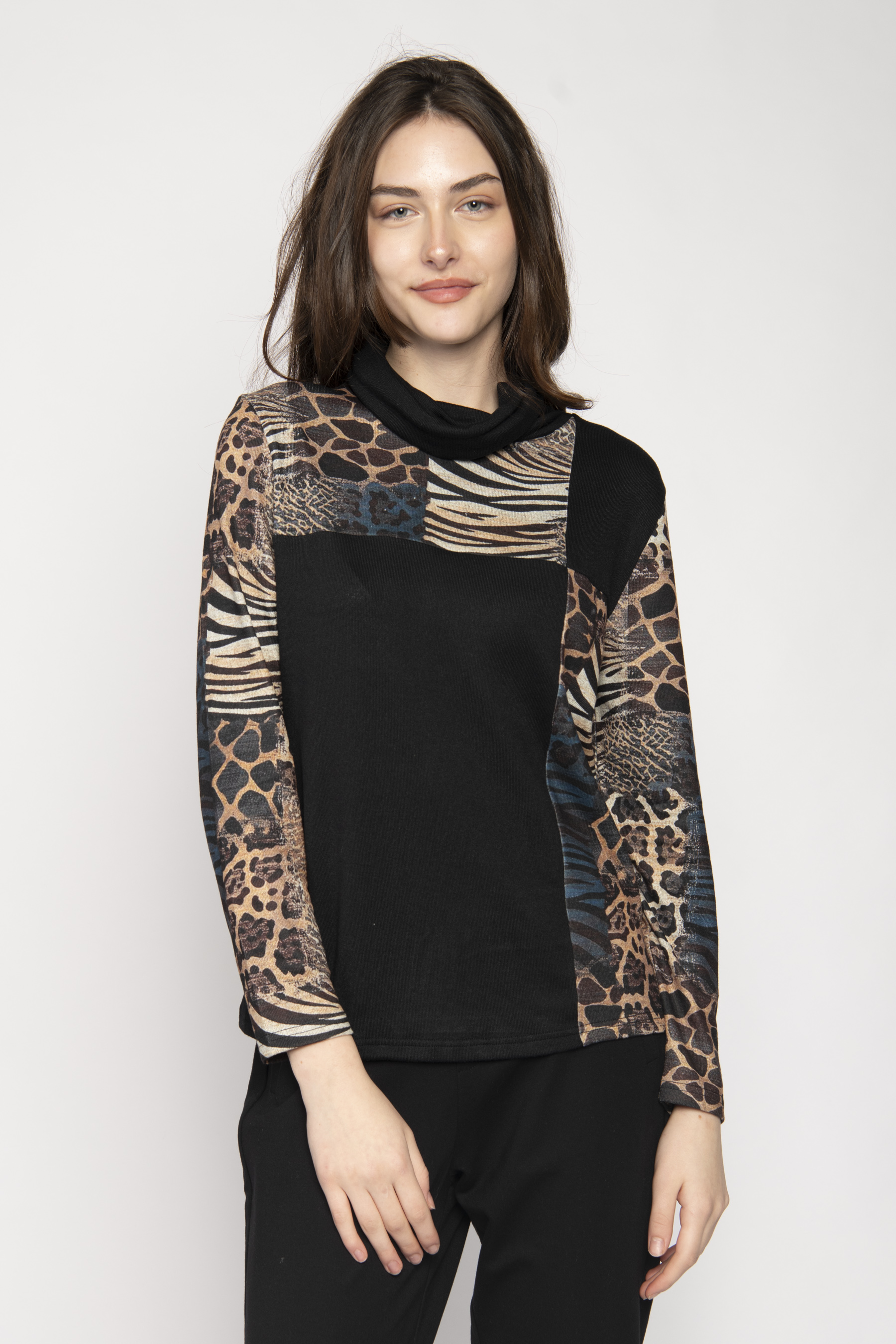 COWL NECK LONG SLEEVE PATCHWORK ANIMAL PRINT TOP WITH CONTRAST PANELS