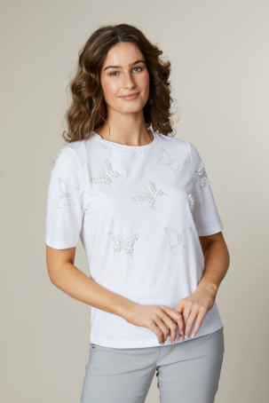 ROUND NECK T-SHIRT WITH DIAMANTE/PEARL BUTTERFLIES