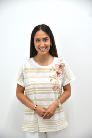 ROUND NECK STRIPED T-SHIRT WITH FLORAL APPLIQUE/ SEQUINS