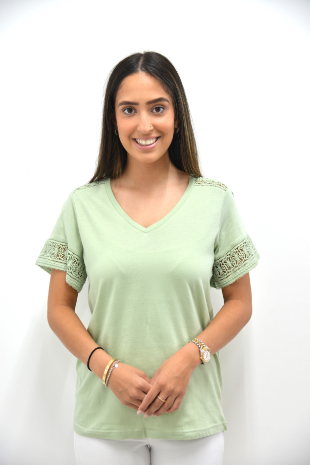 V-NECK T-SHIRT WITH LACE TRIM AT SLEEVE AND SHOULDER