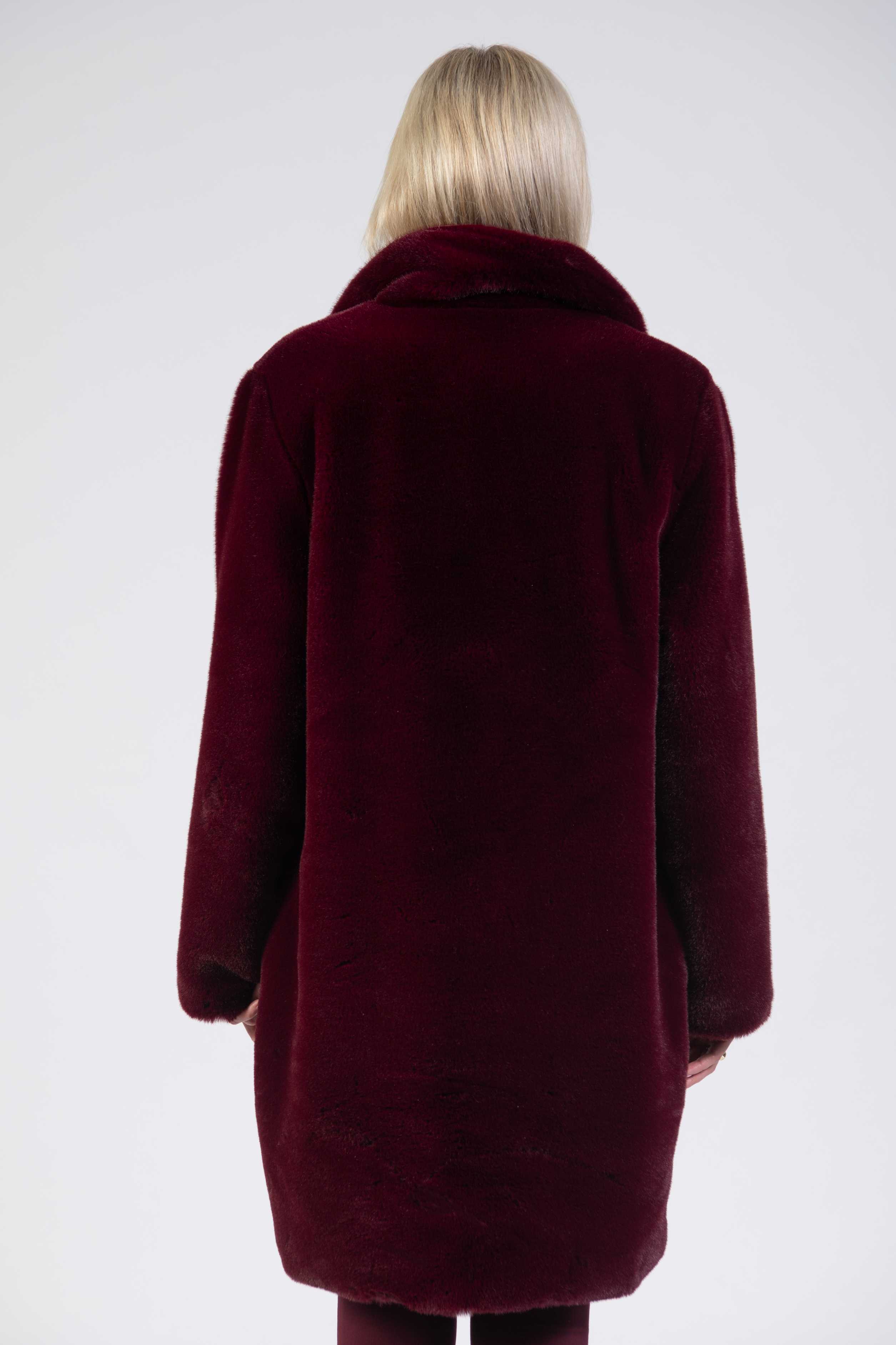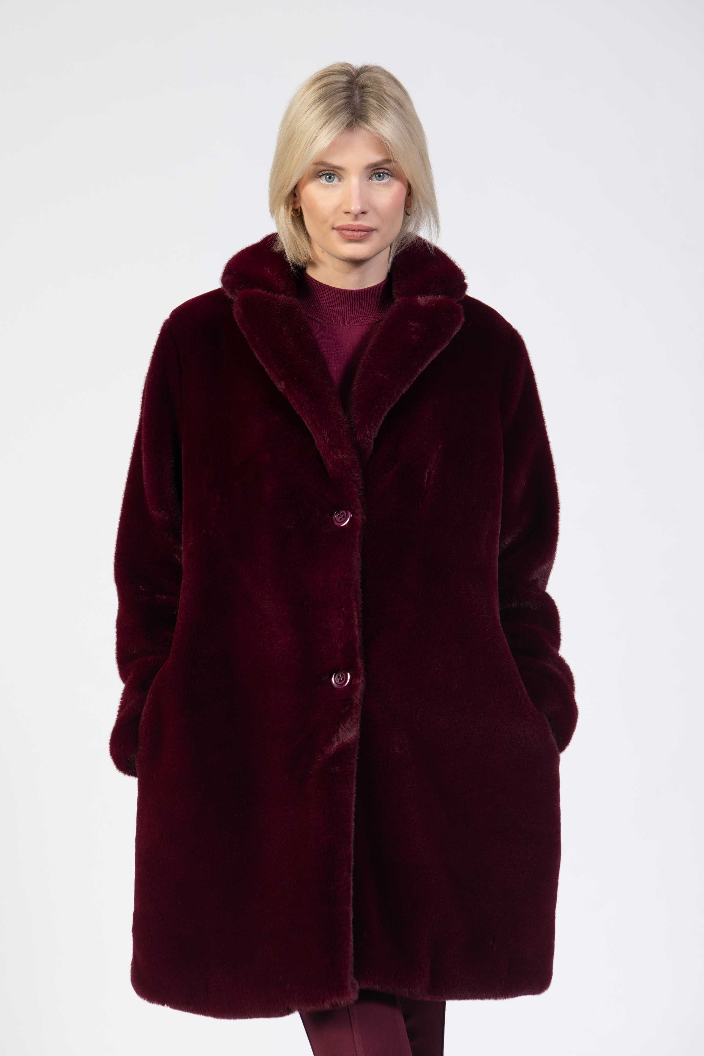 Faux fur coat, longer relaxed fit, two buttons, rich cherry colour
