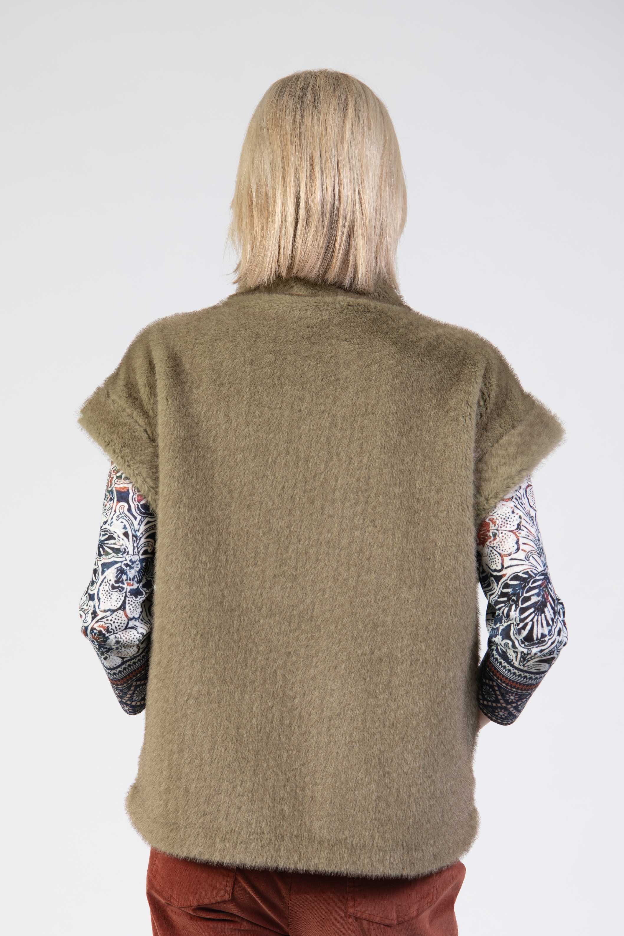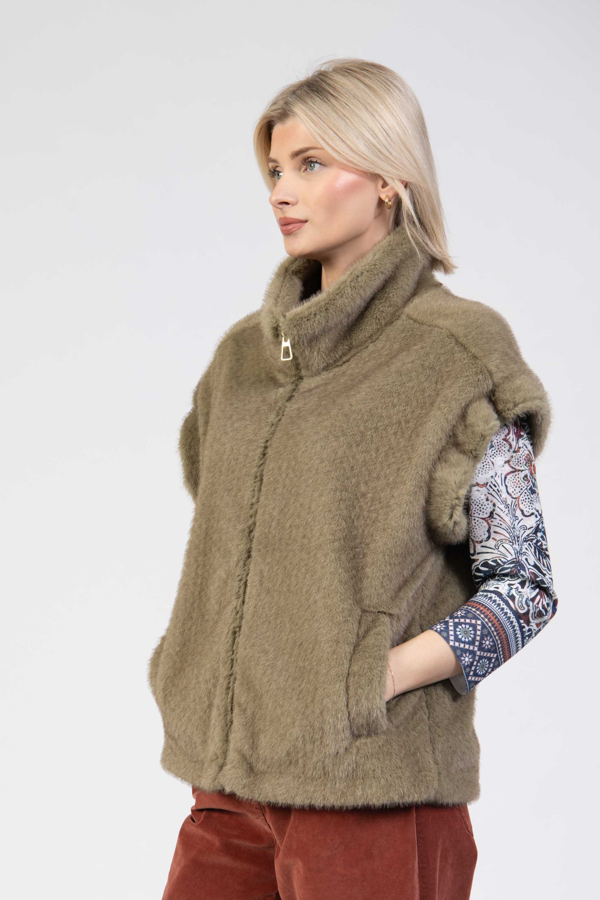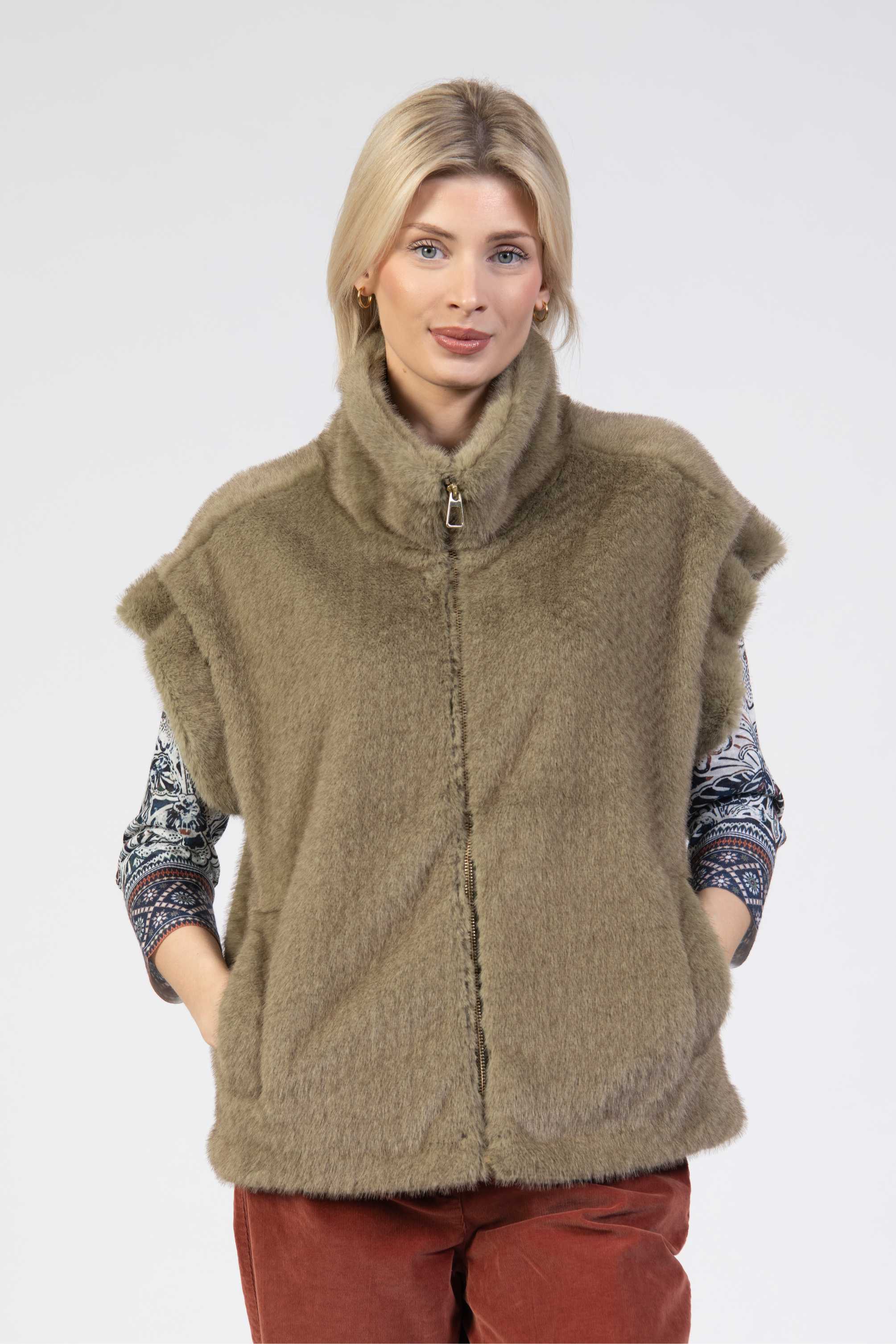 Faux fur gilet, gold zip, high collar, boxy fit, side pockets