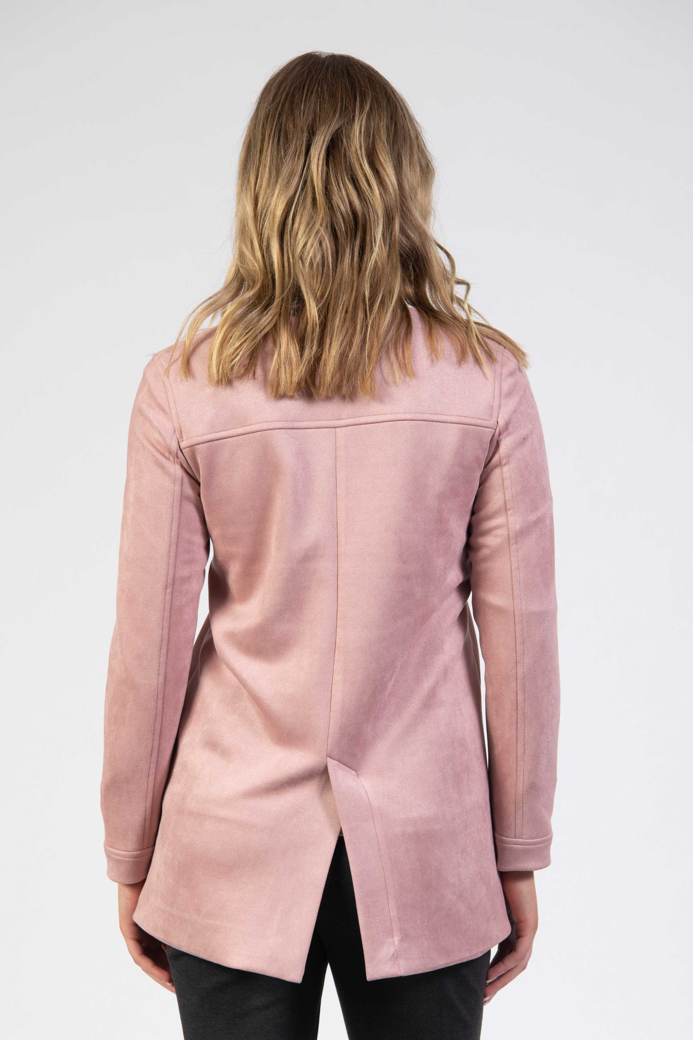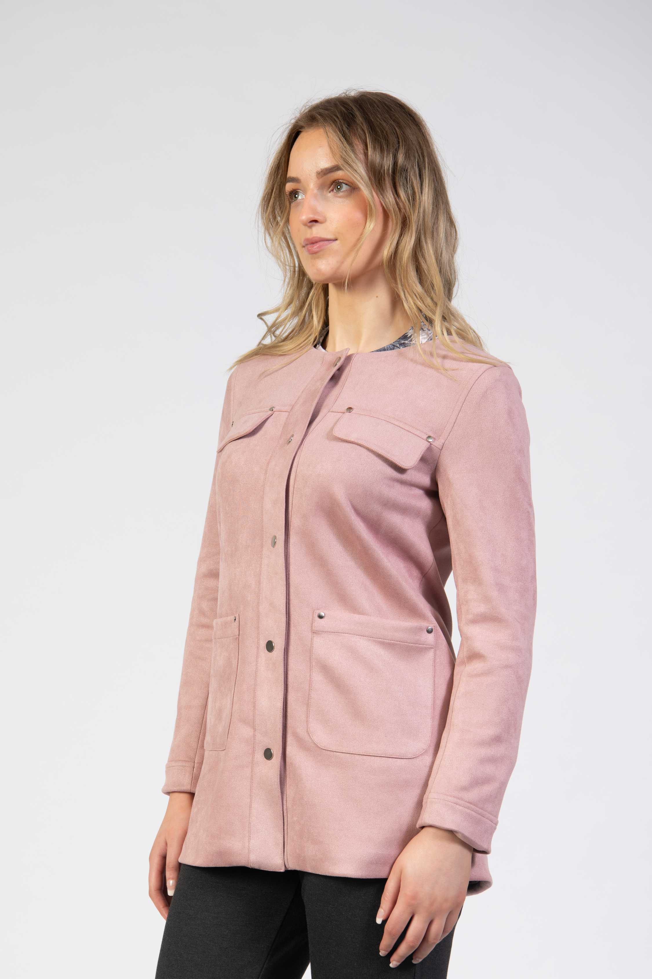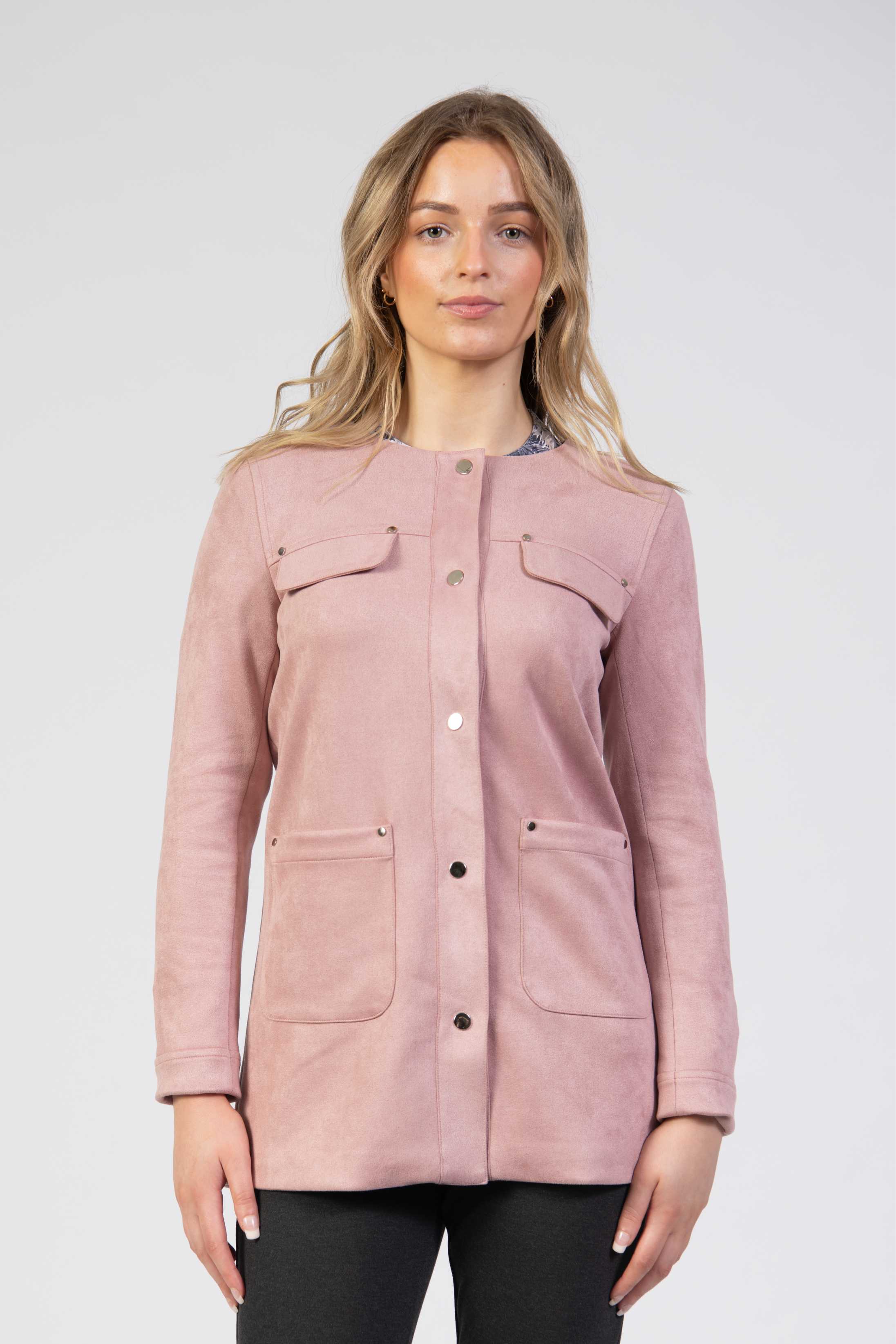 Suede jacket, silver clasp, non-functional chest flaps, collarless