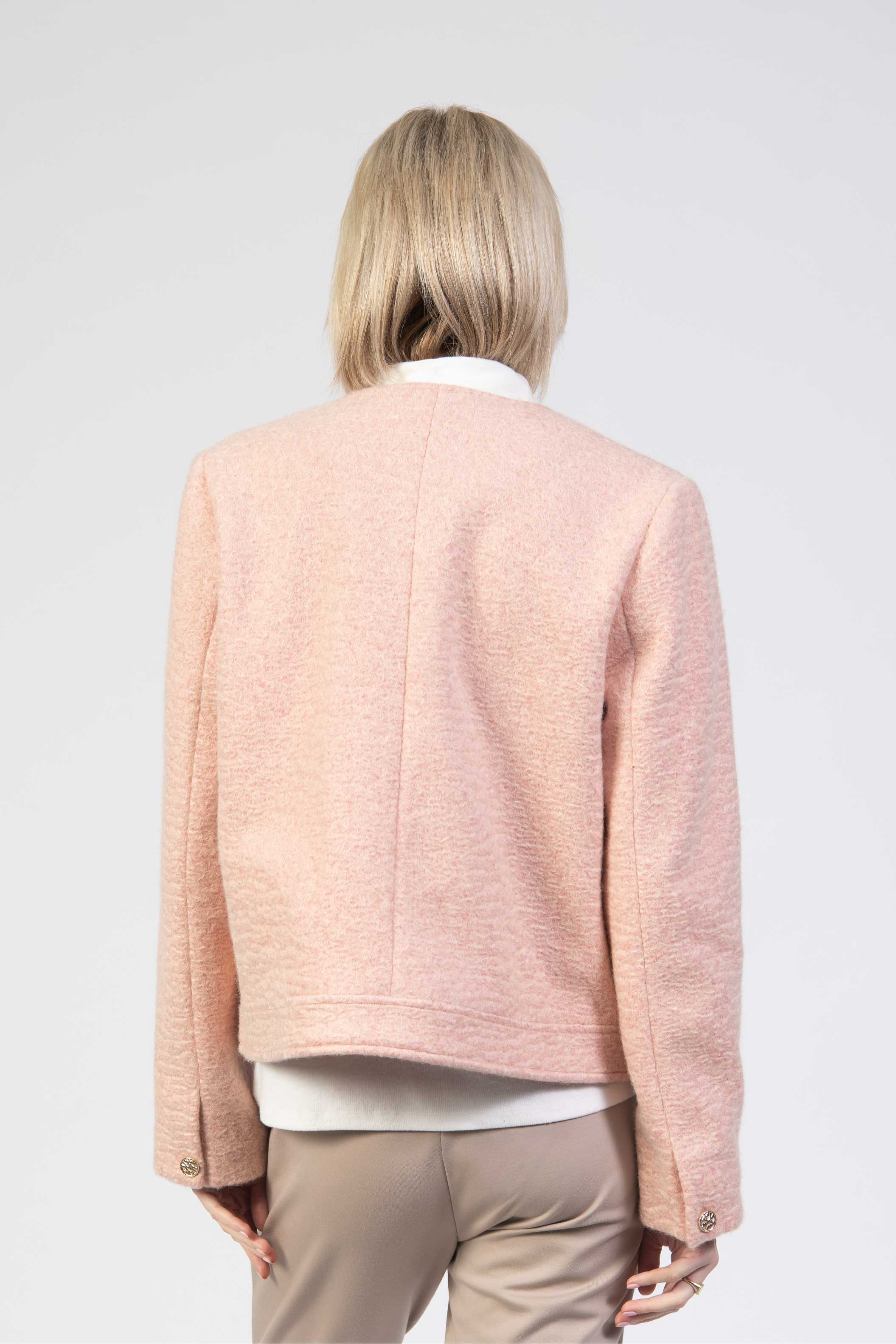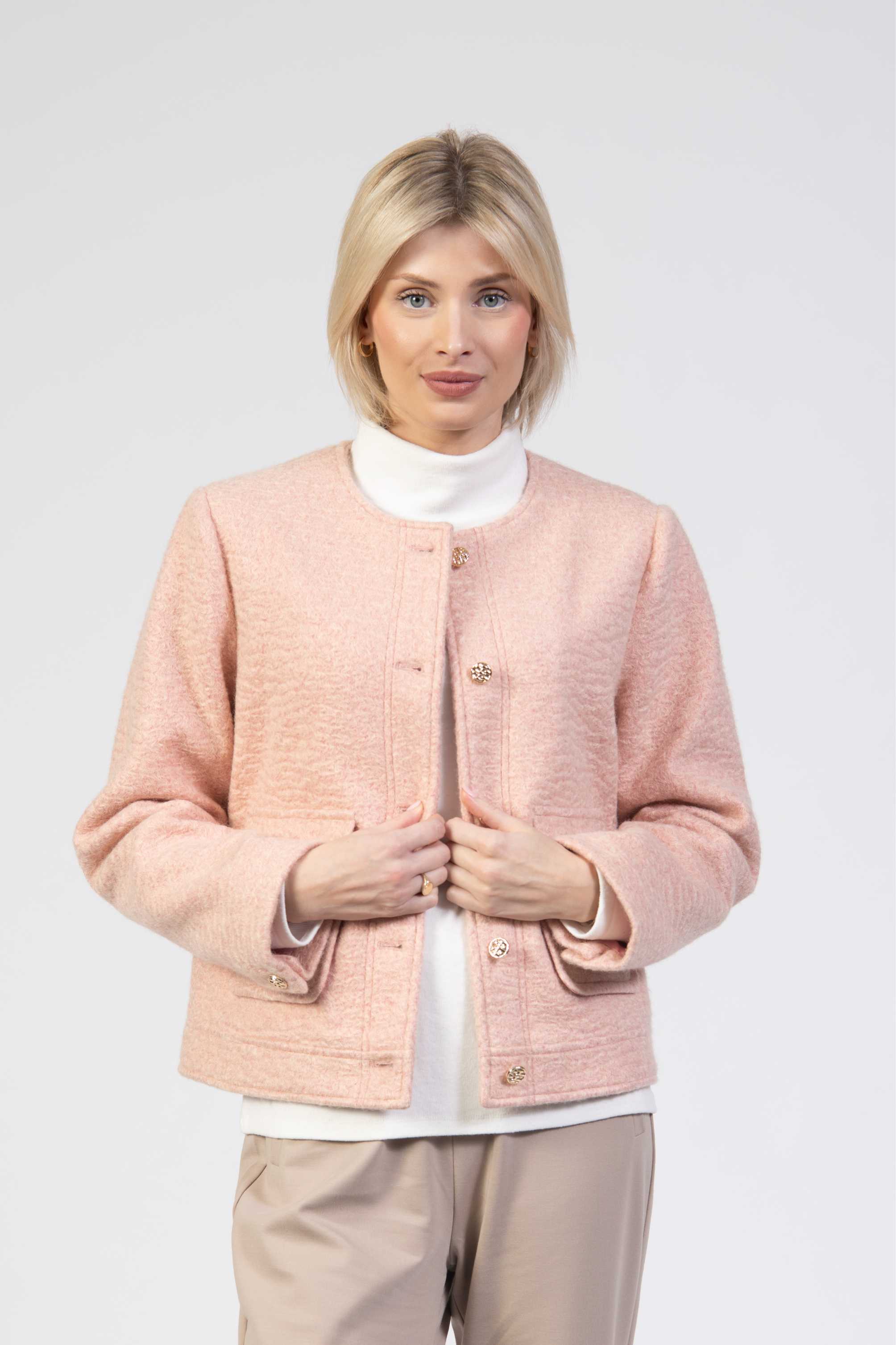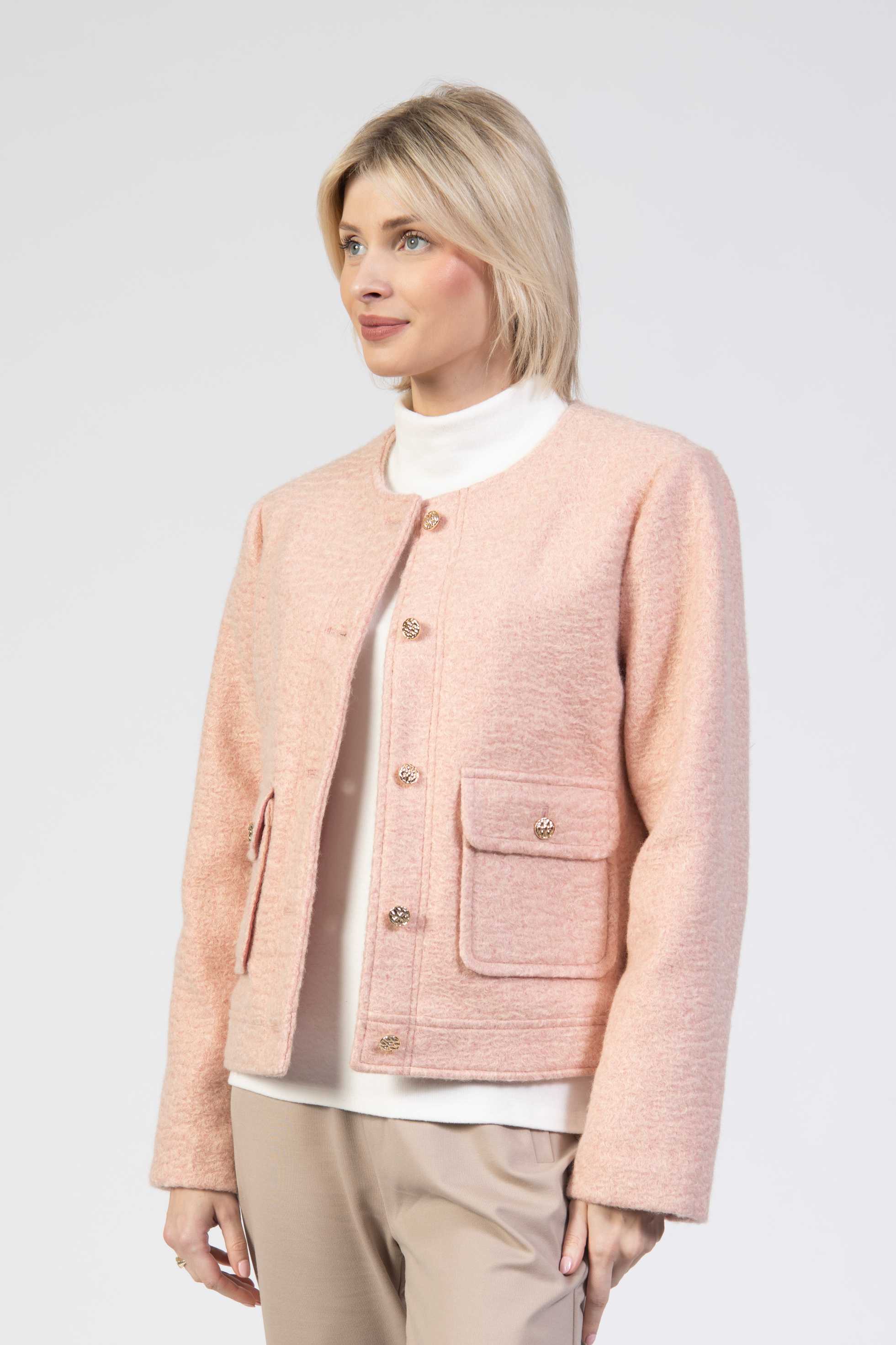 Wool-style lined jacket, wavy texture, straight fit, gold buttons, collarless, front pockets