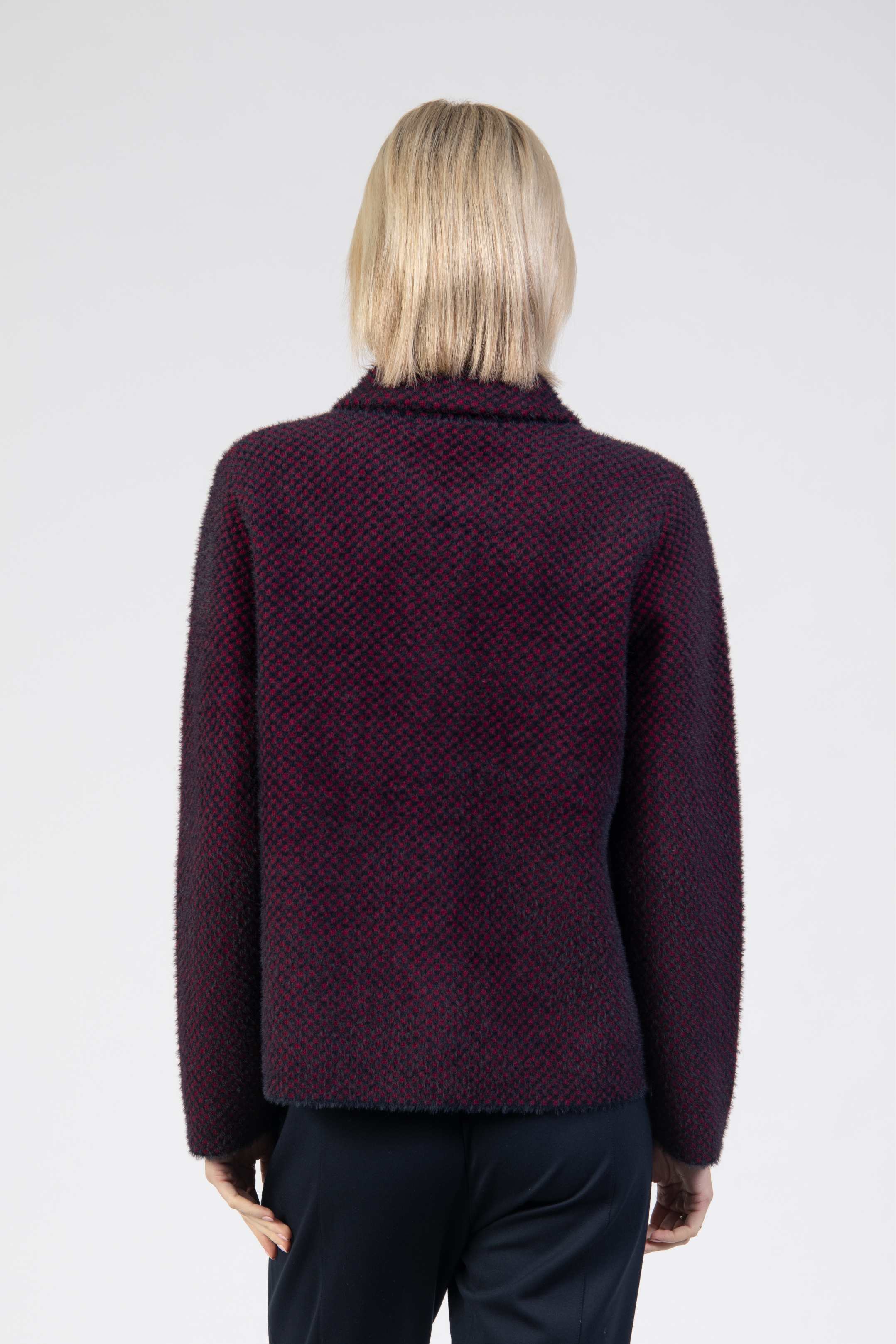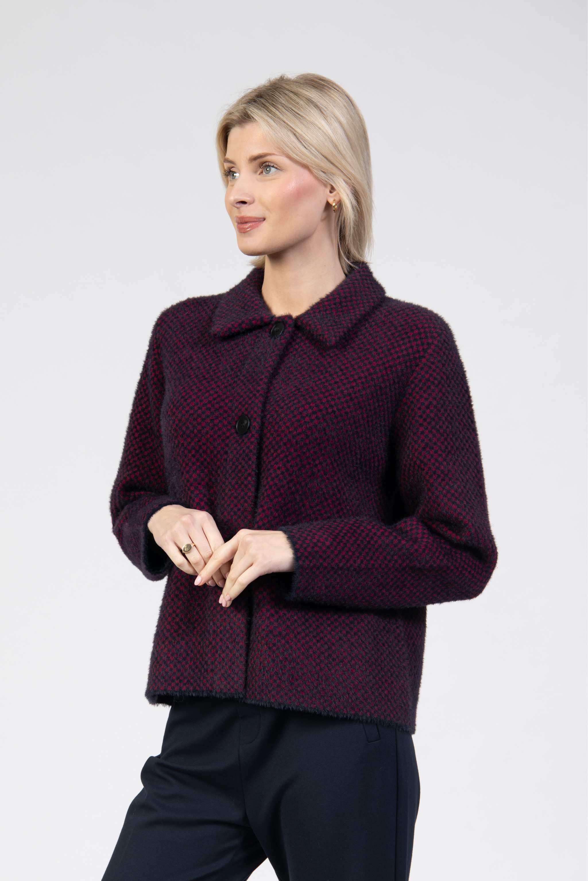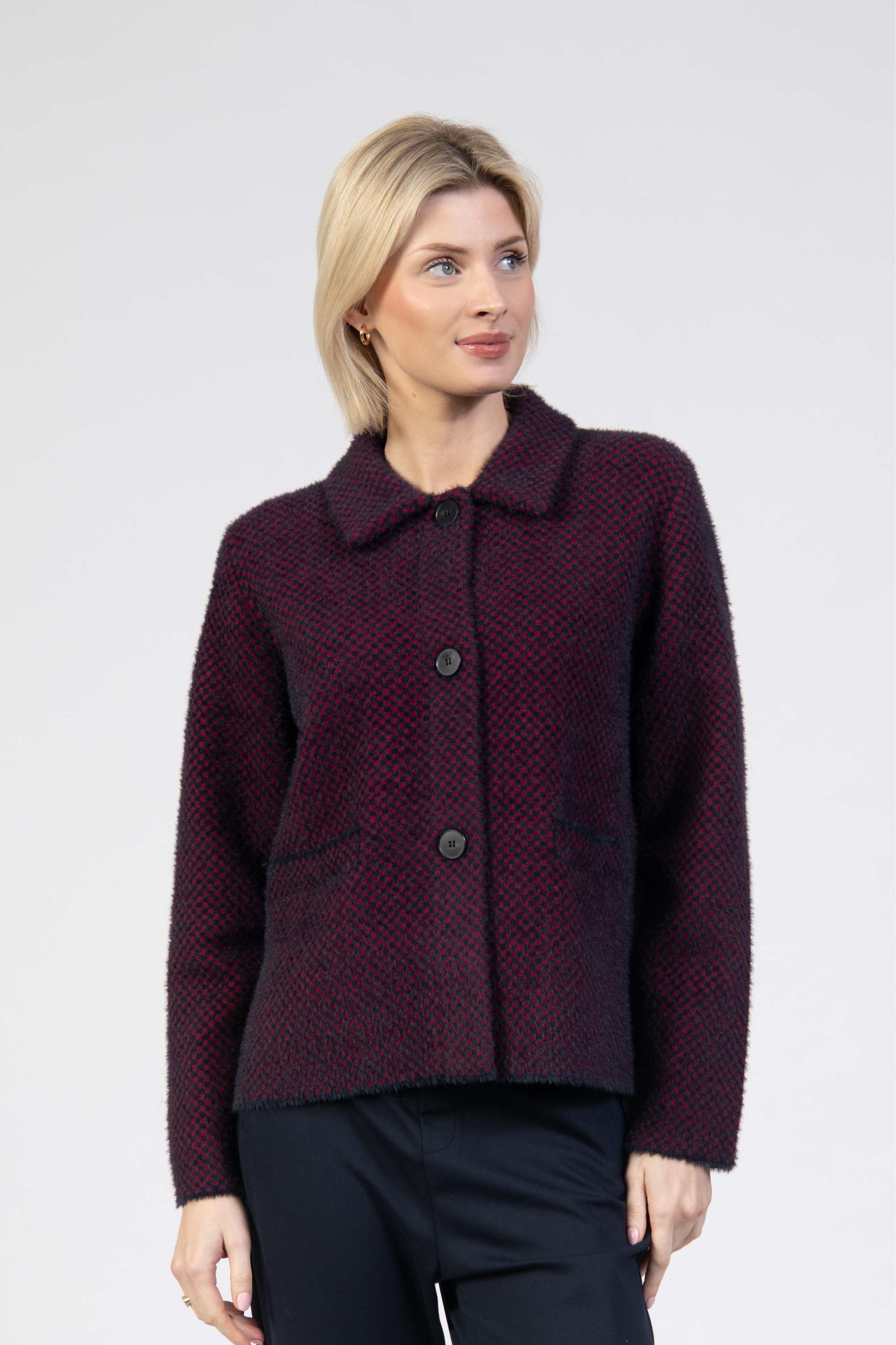 Short coatigan, textured knit, three buttons, shirt collar, front pockets, straight fit
