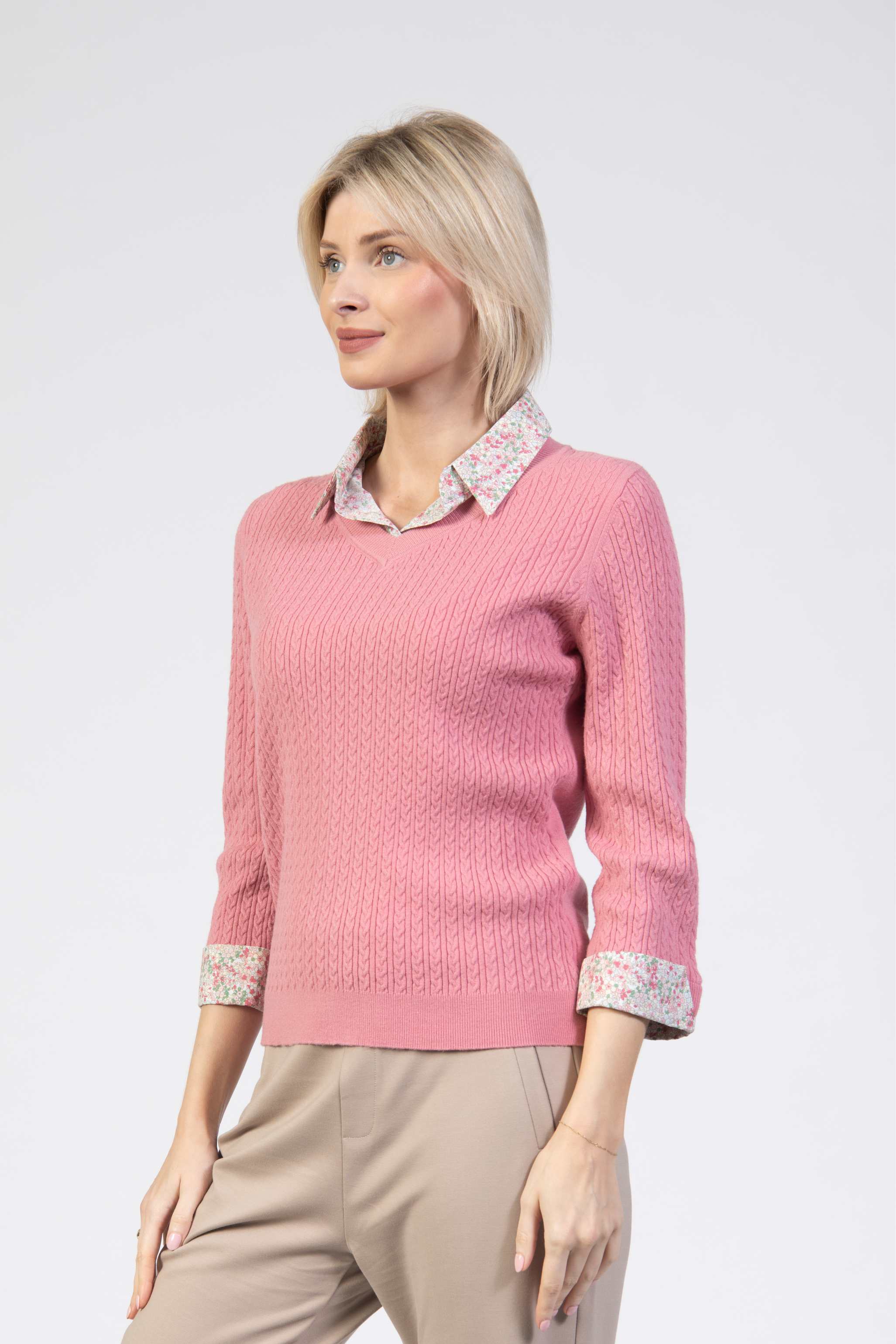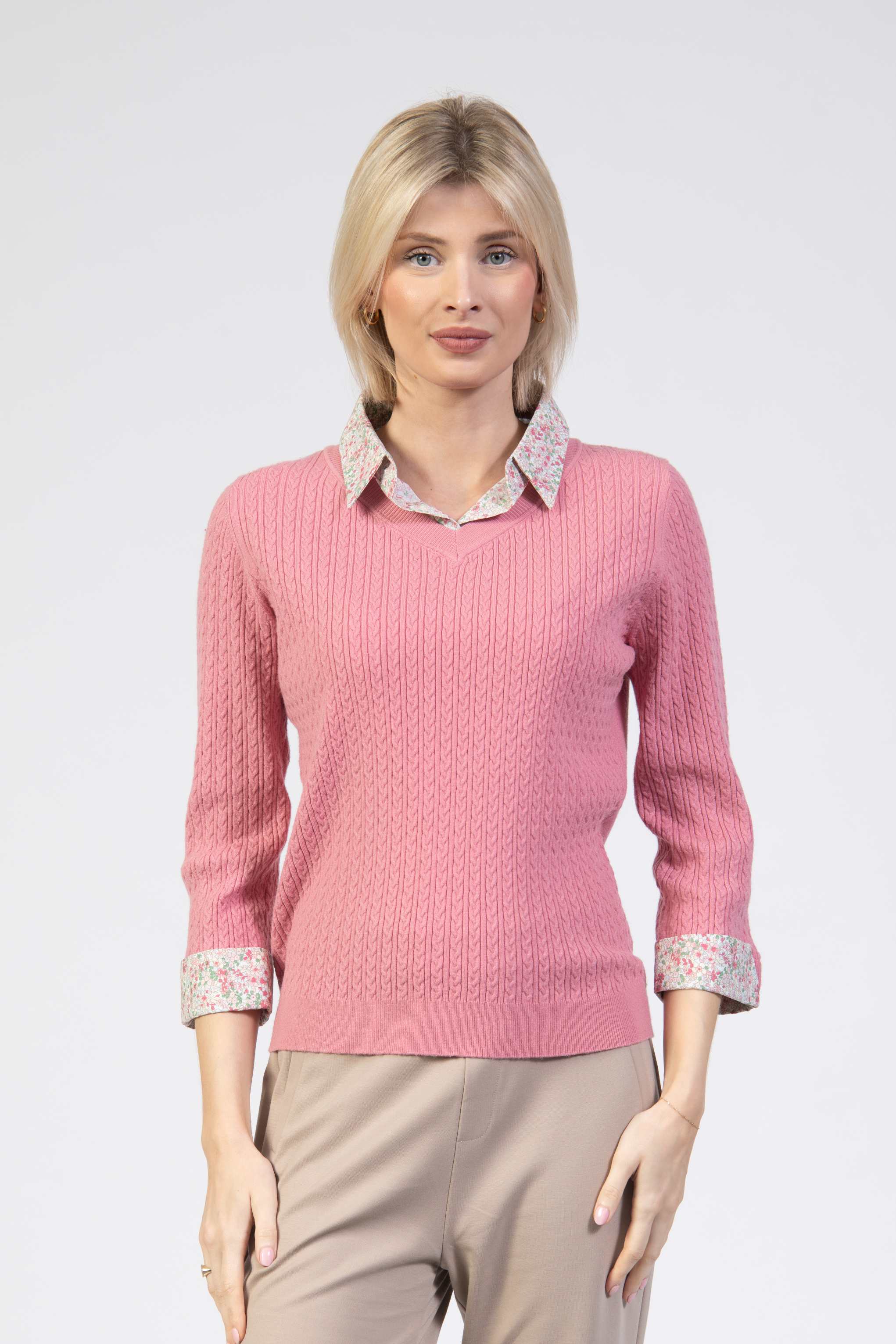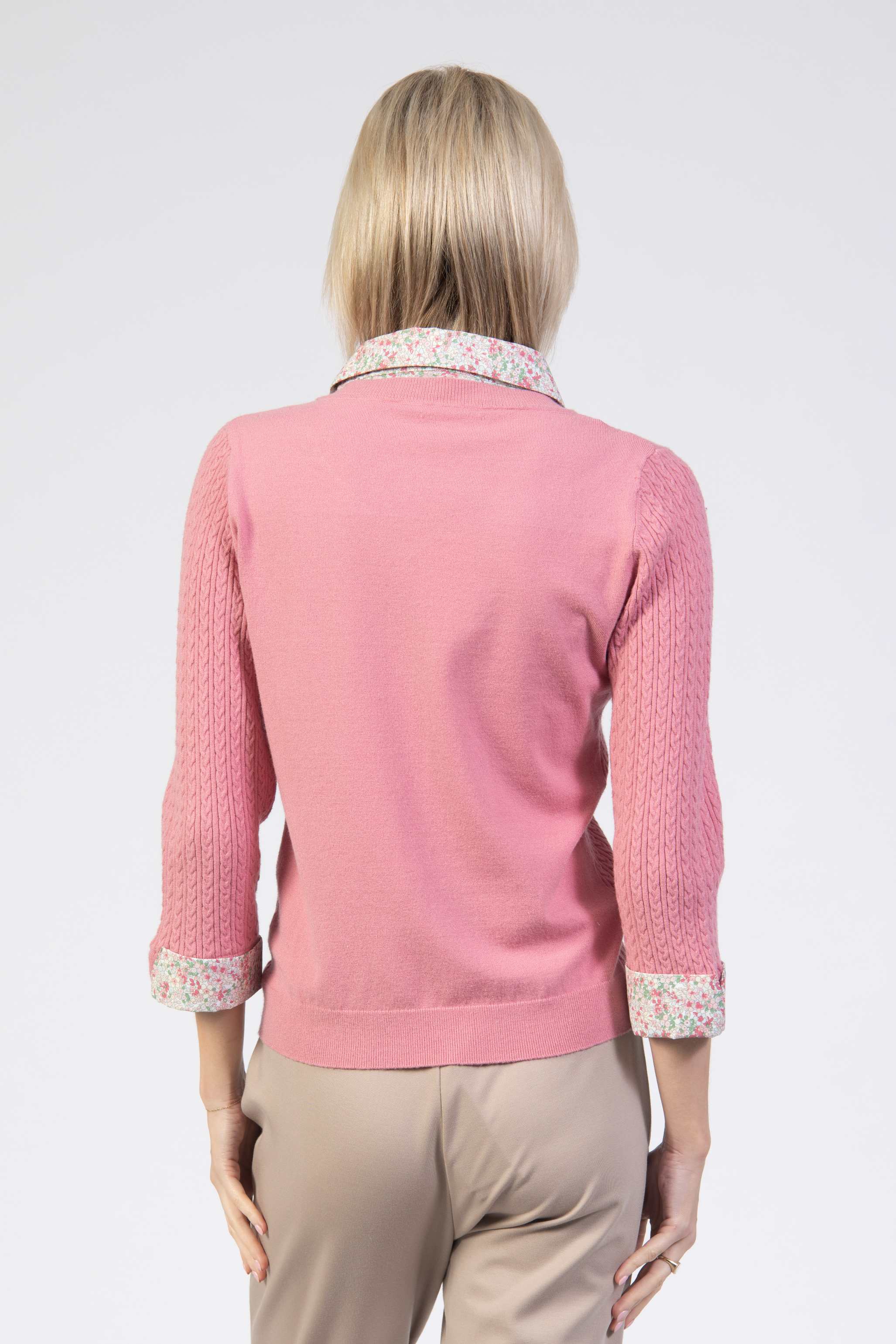 Cable sweater, matching floral shirt, matching shirt cuffs