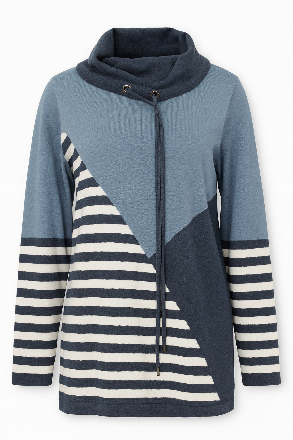 Colour block and stripe sweater, cowl neck with cord, long sleeves
