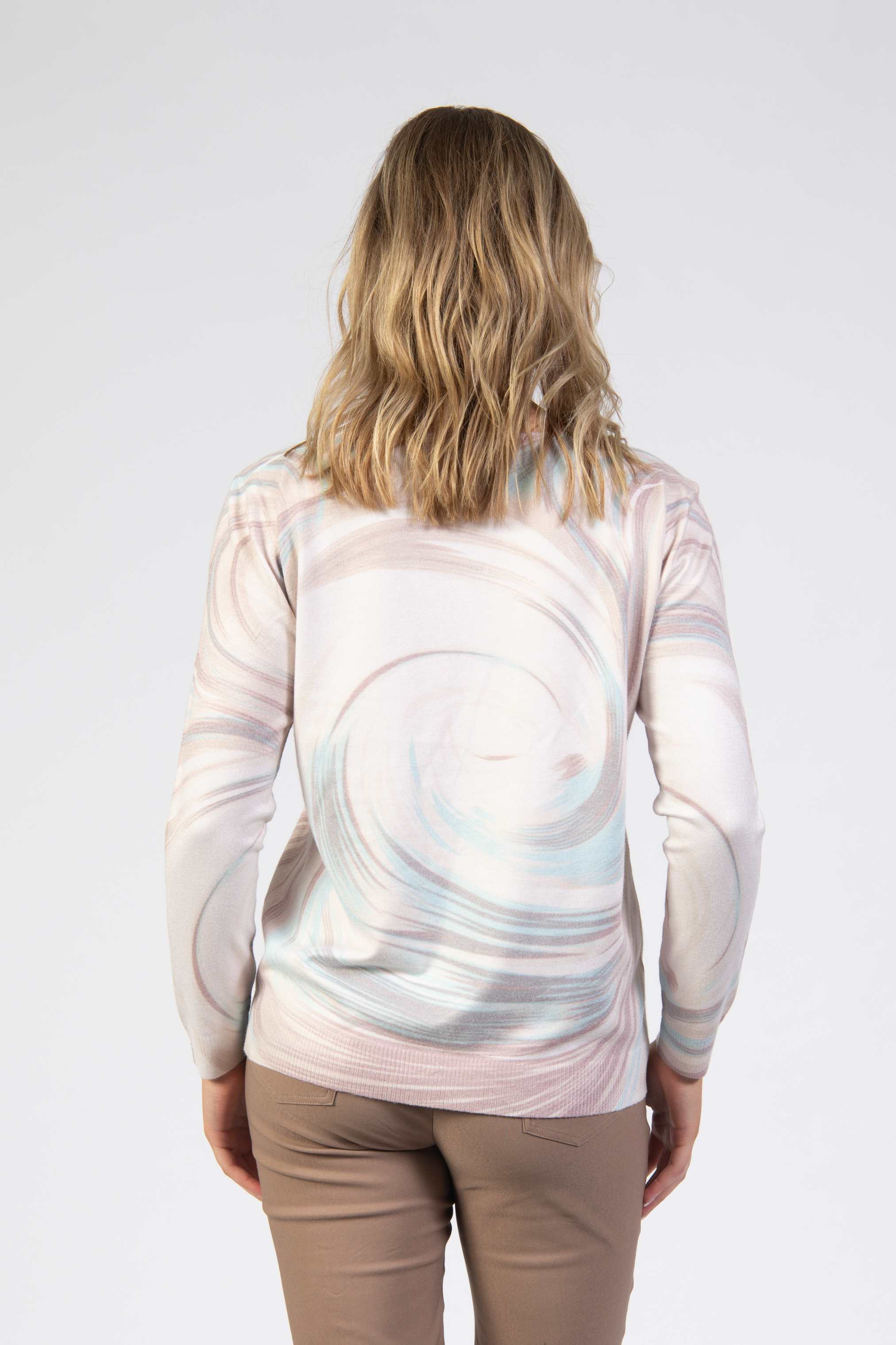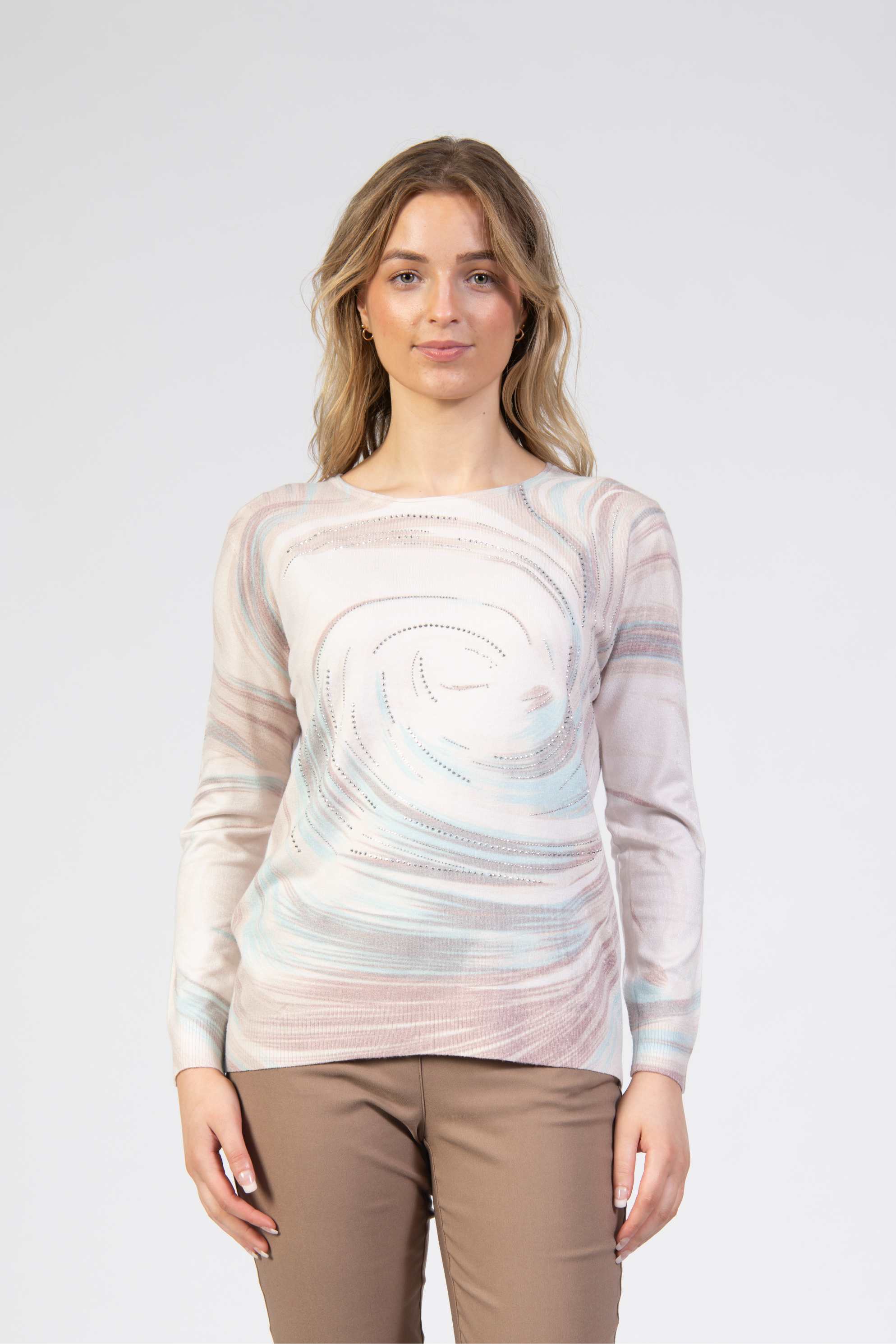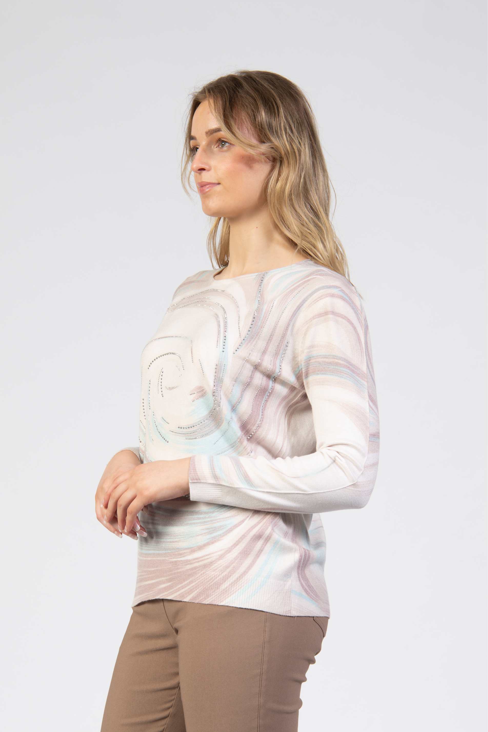 Printed knitted top, slim fit, pastel swirl, diamanté accents