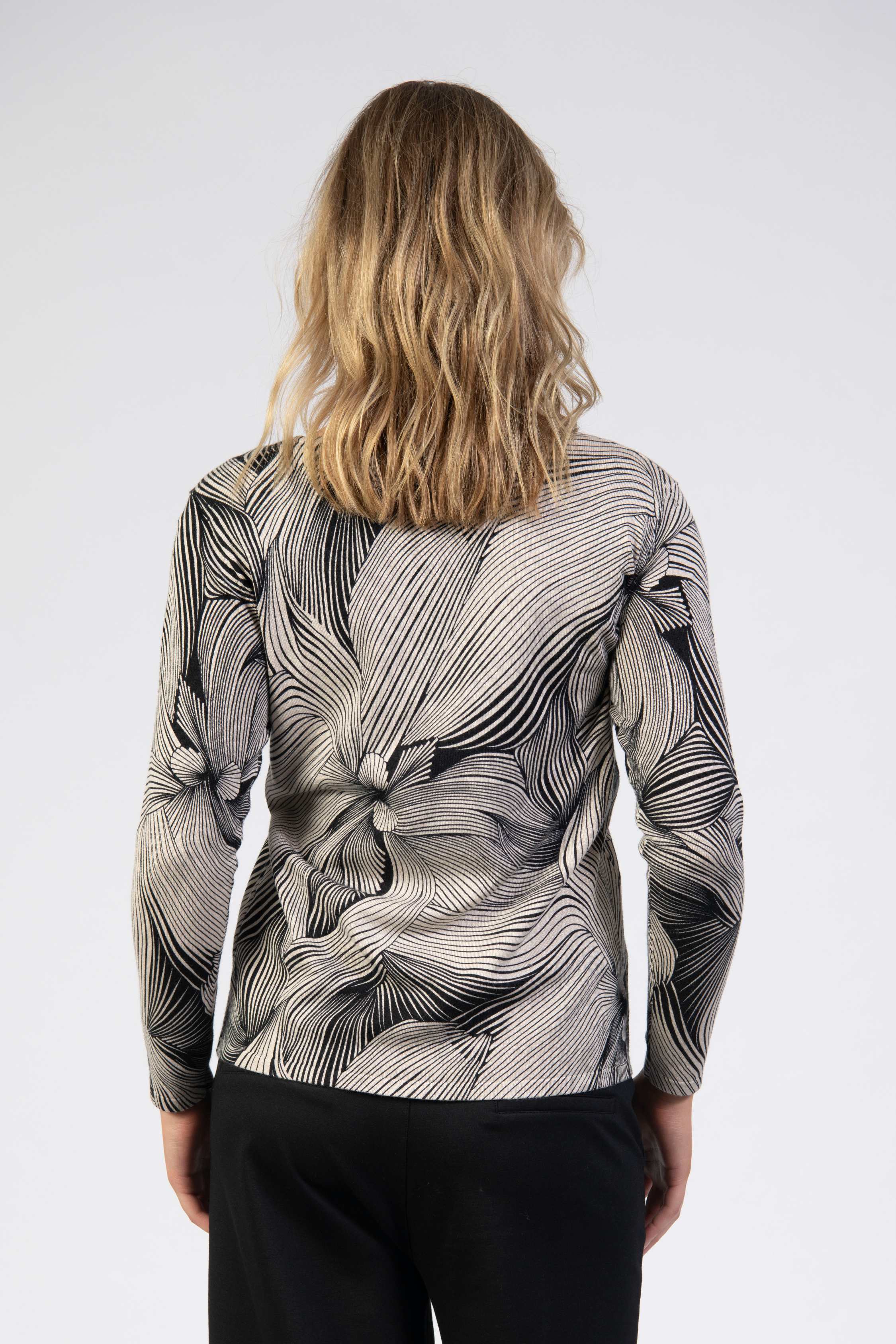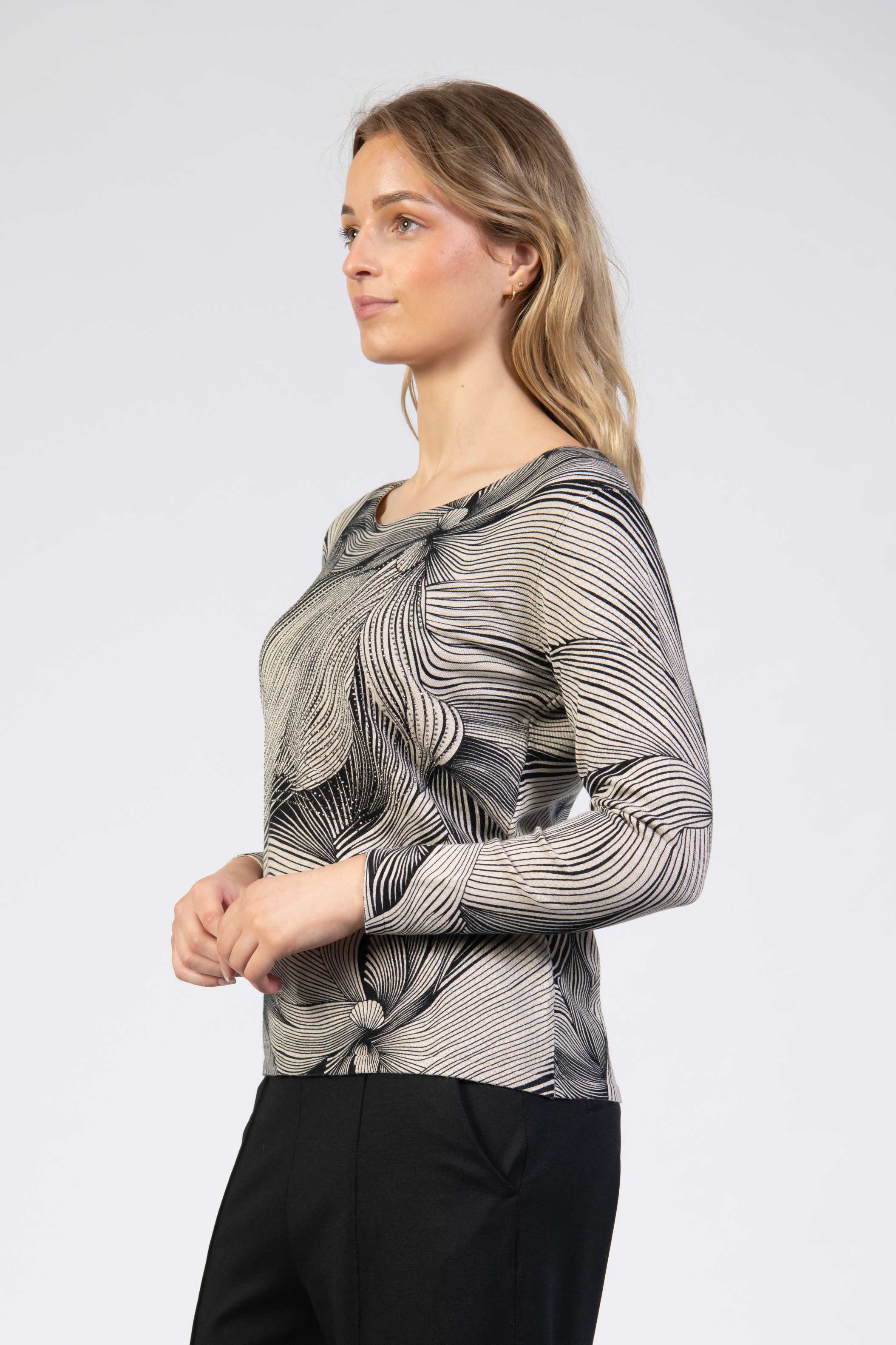 Printed knit top, abstract wavy lines, diamanté front