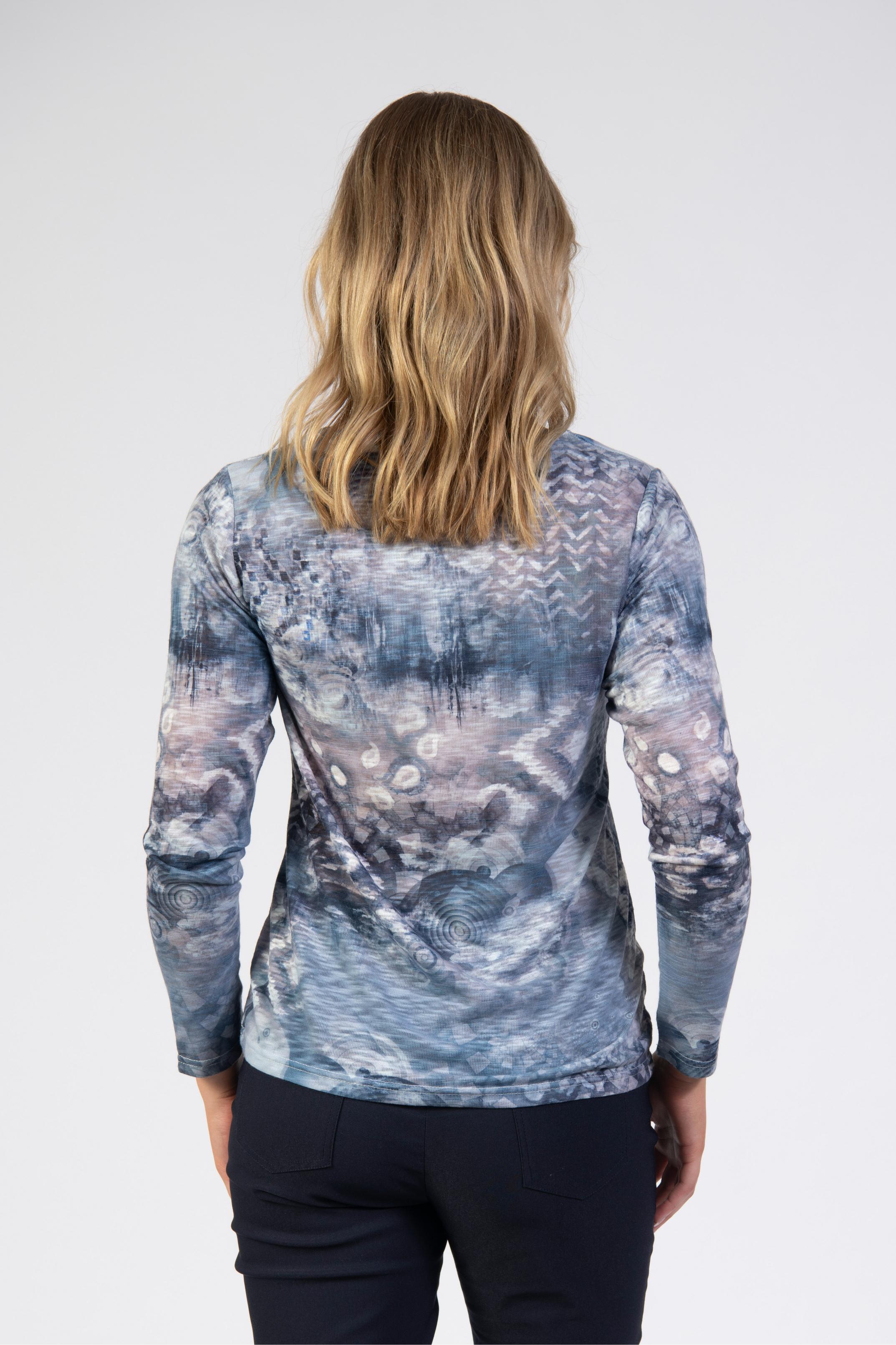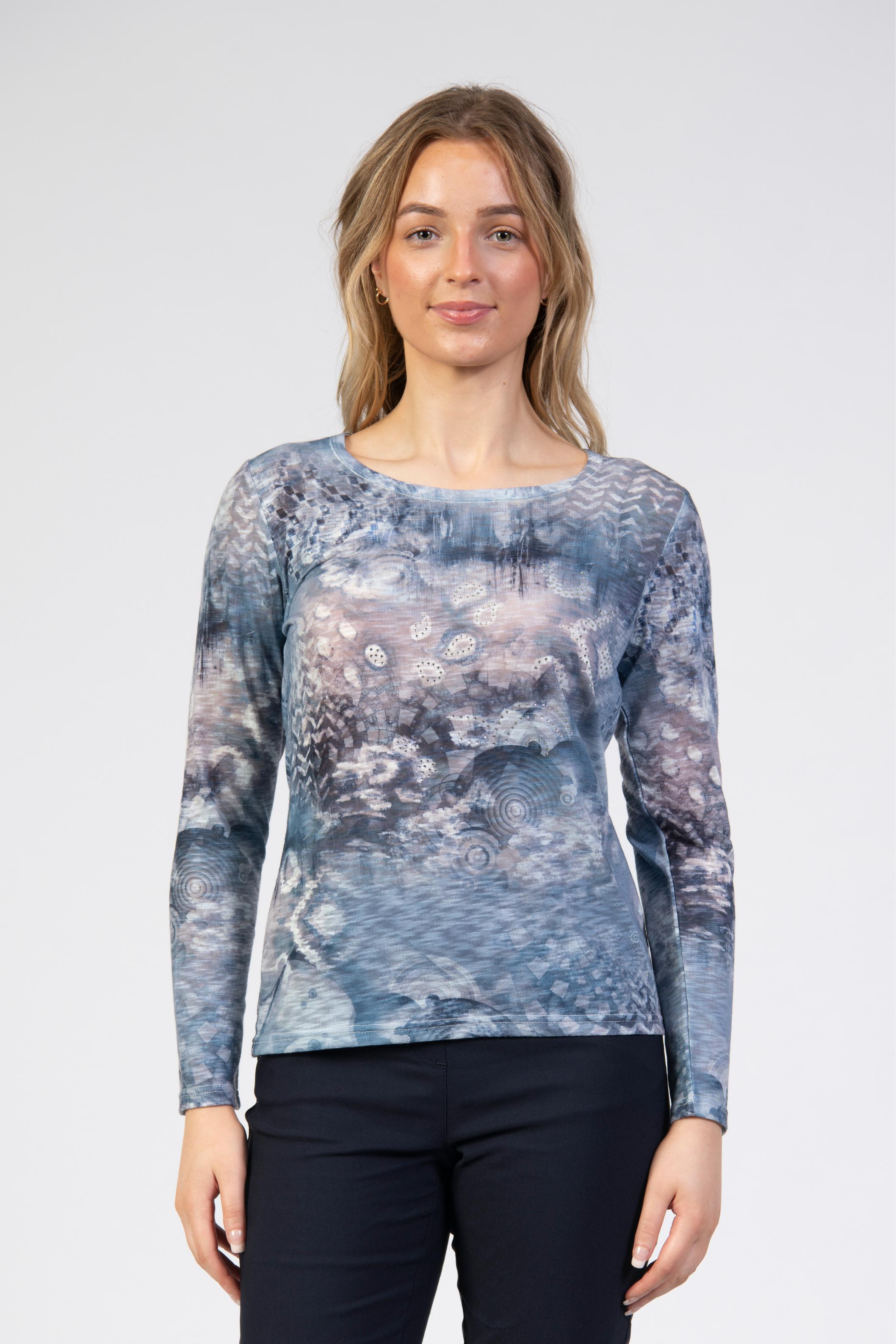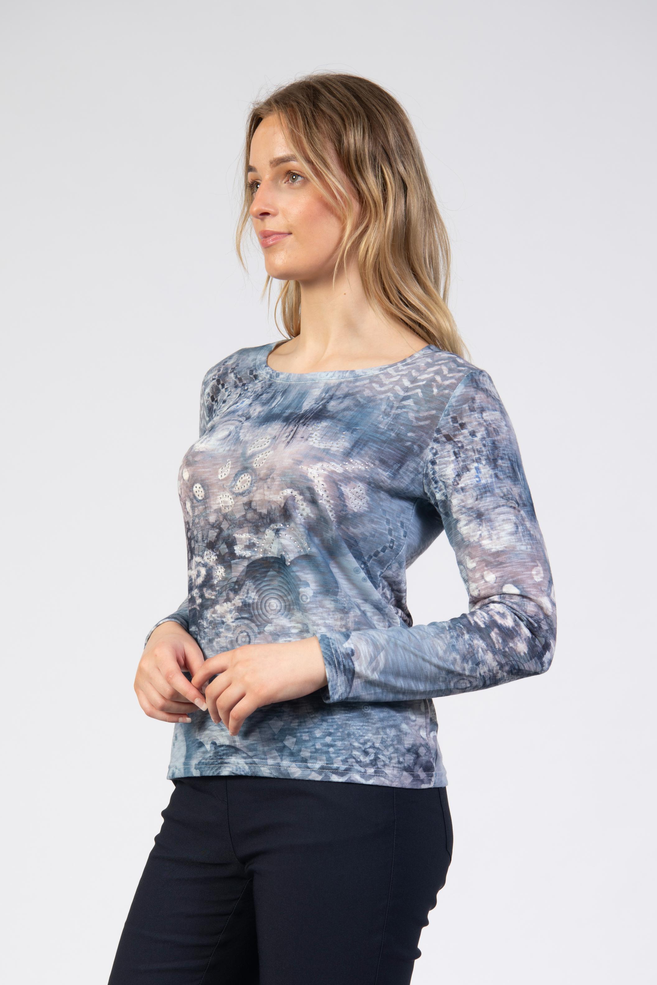 Long-sleeve printed top, front stones, slim fit, round neck