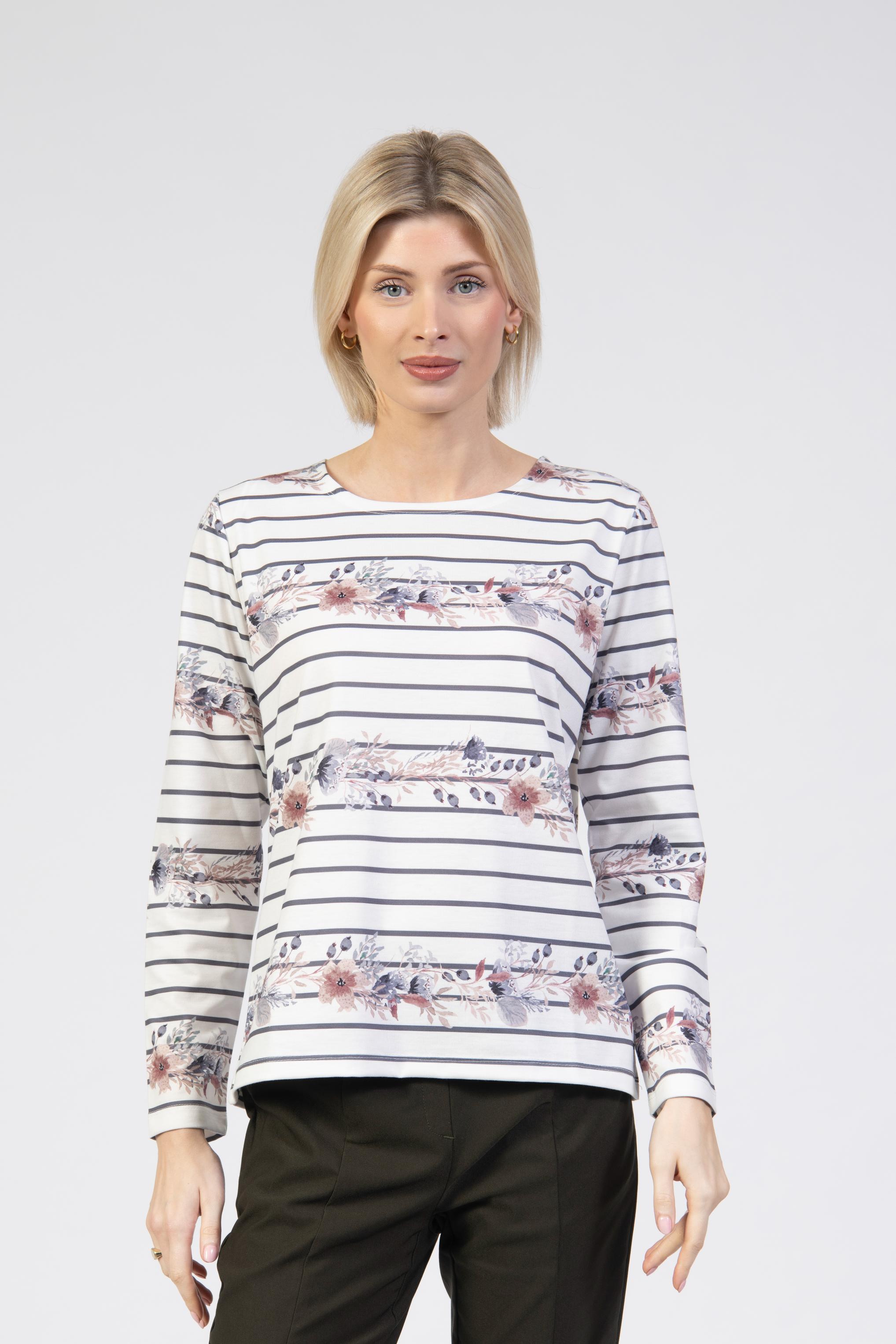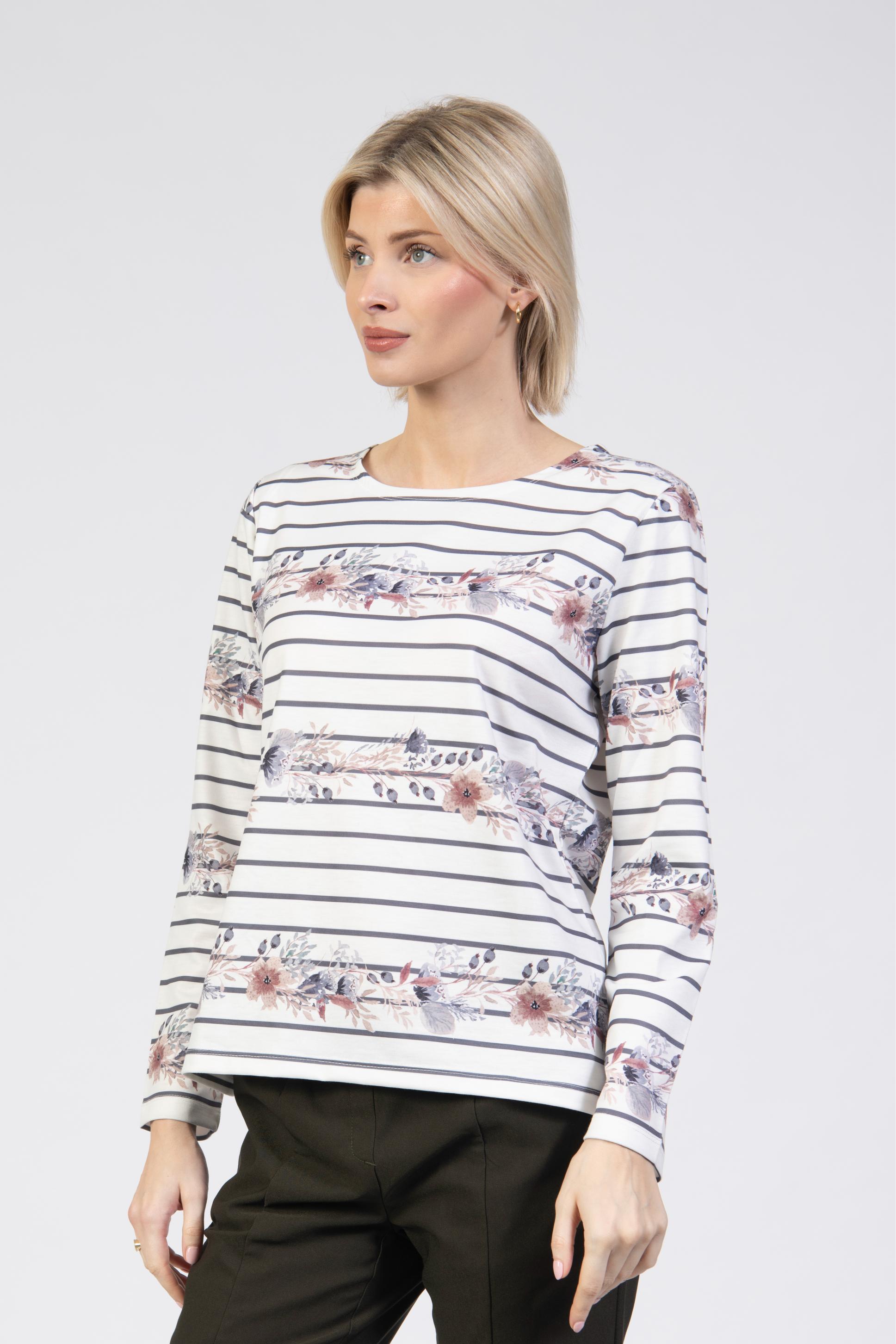 Loopback top, round neck, long sleeve, grey stripes and floral