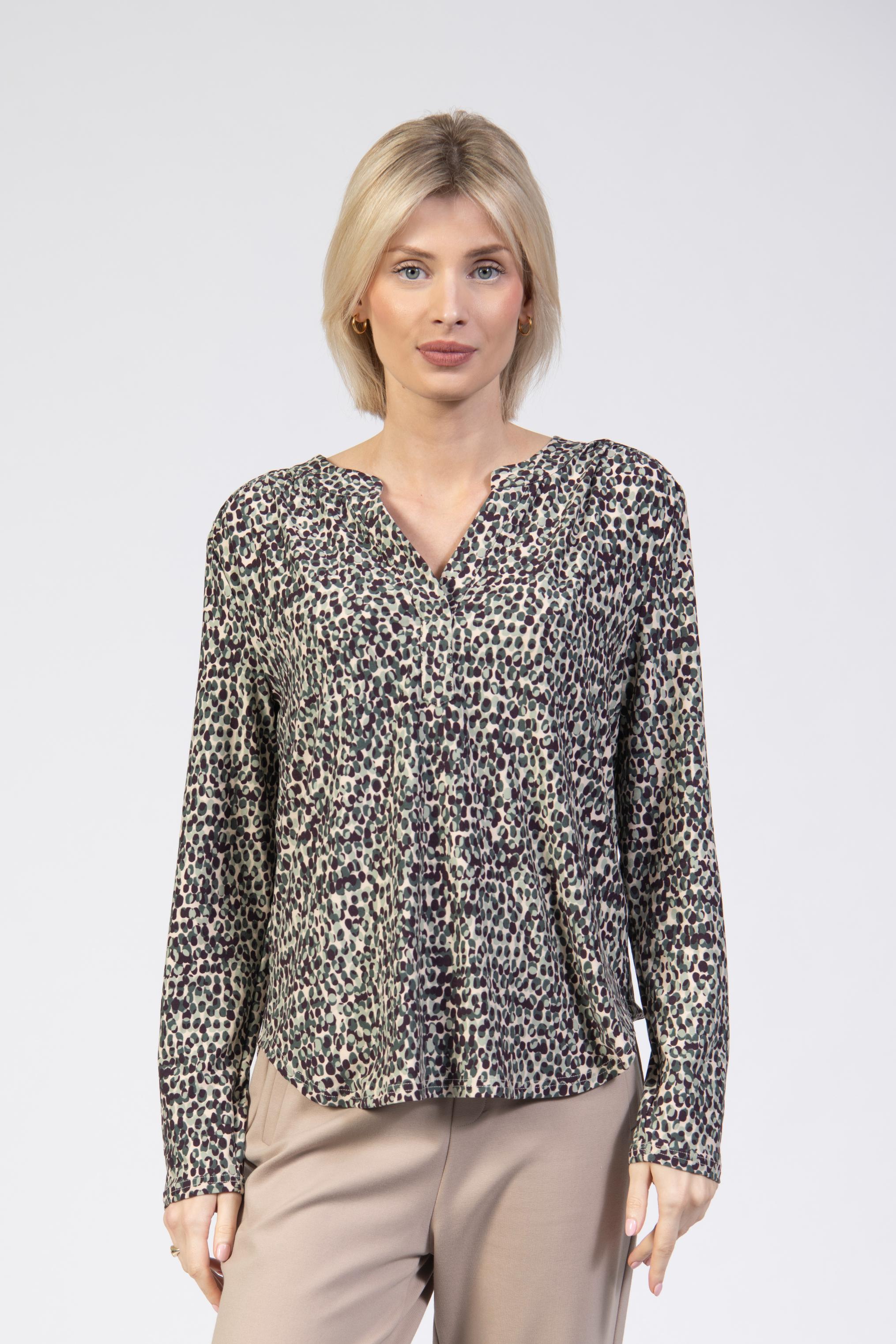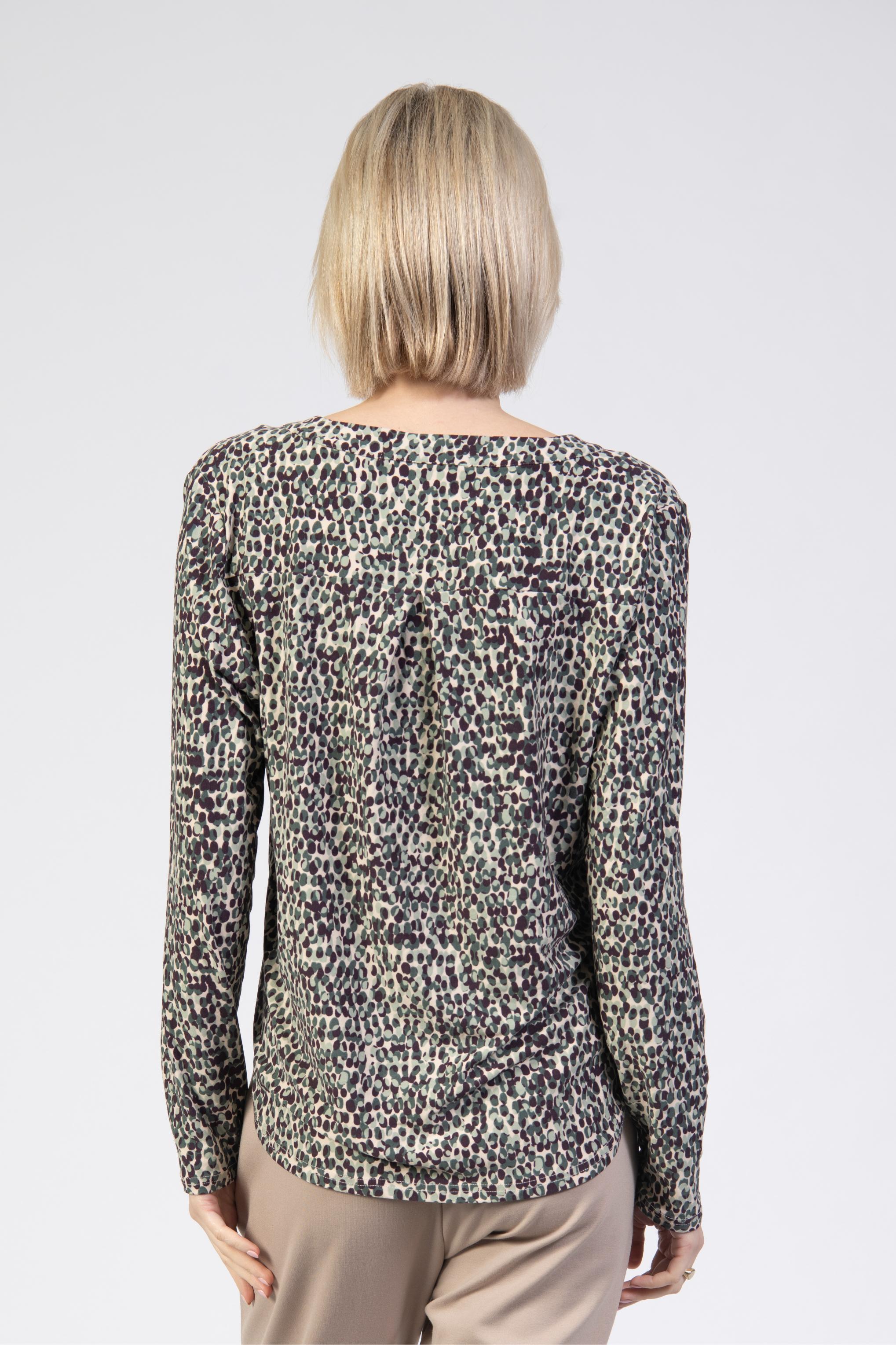 Notch-neck top, long sleeve, brushed texture, abstract print