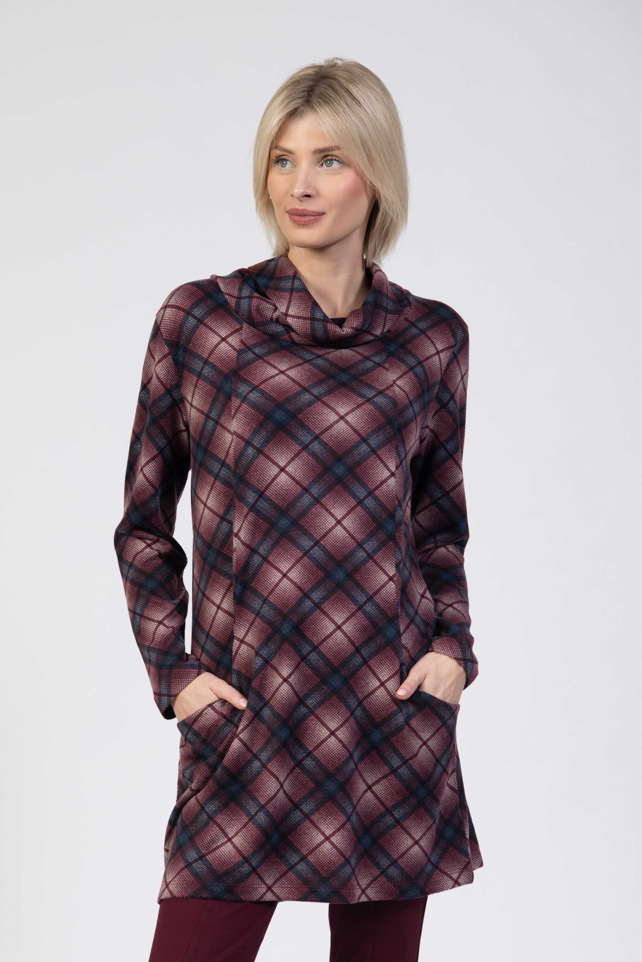 Jersey tunic dress, cowl neck, front pockets, argyle print