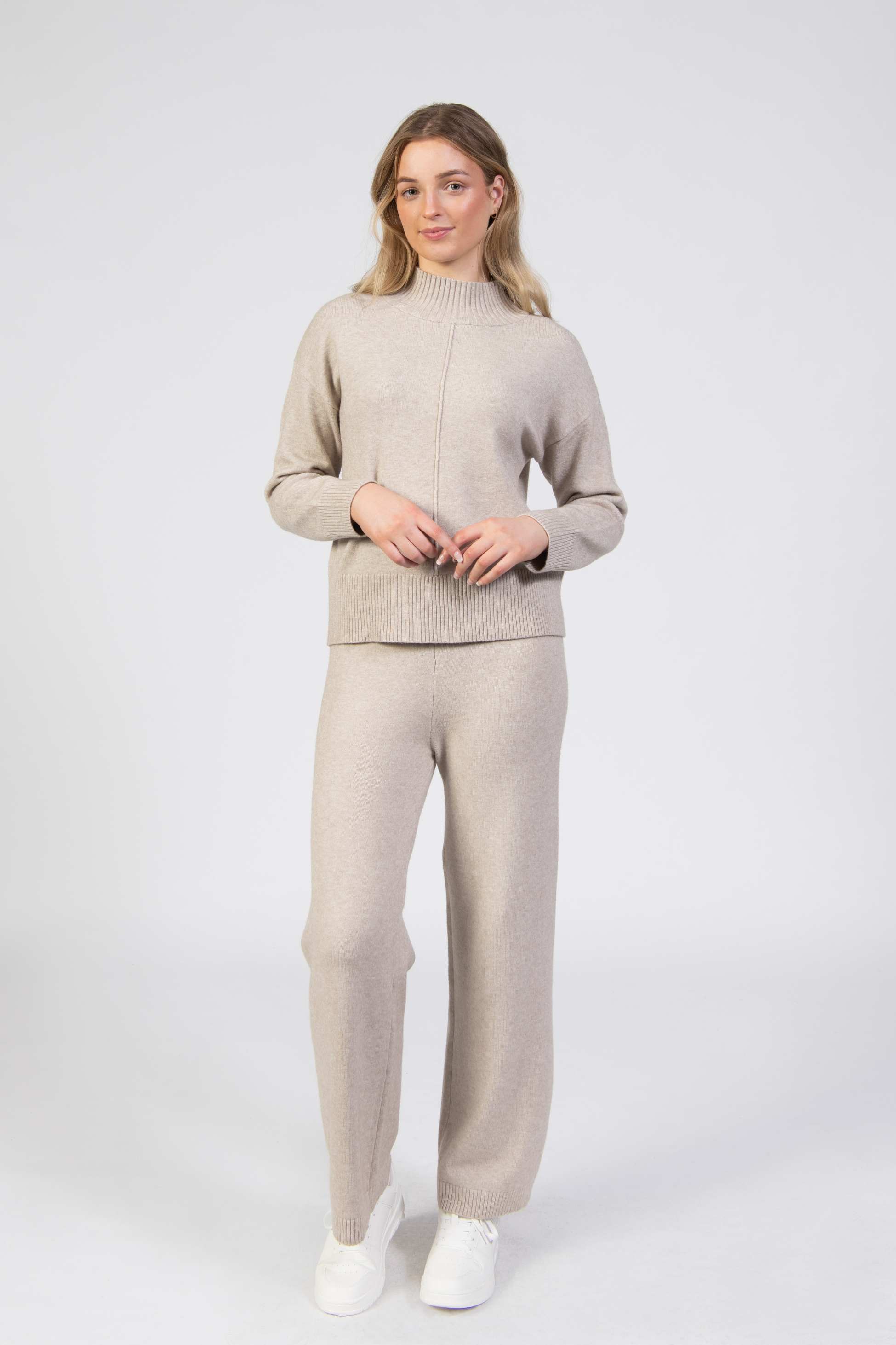 Knitted trousers, oat cream, relaxed fit, ribbed hem